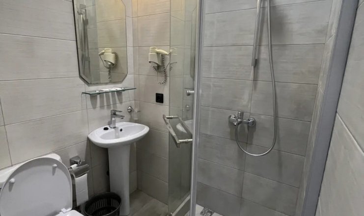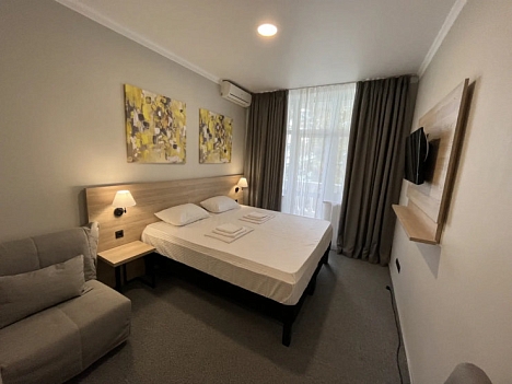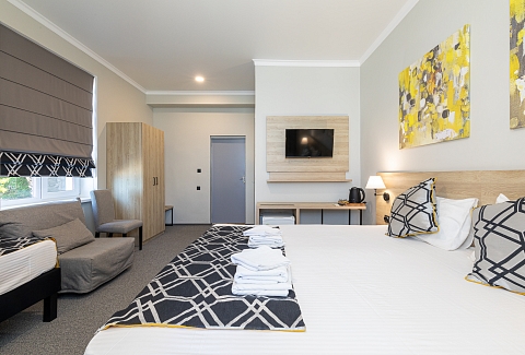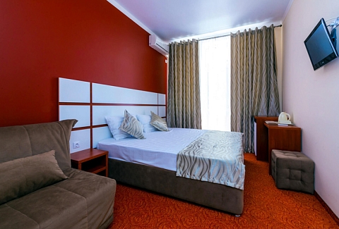 В номере: вешалка, зеркало, кресло-кровать, кровати односпальные /одна двуспальная кровать, прикроватные тумбочки, стул, тумба, шкаф, кондиционер, мини-холодильник, телевизор, чайный набор посуды, электрочайник