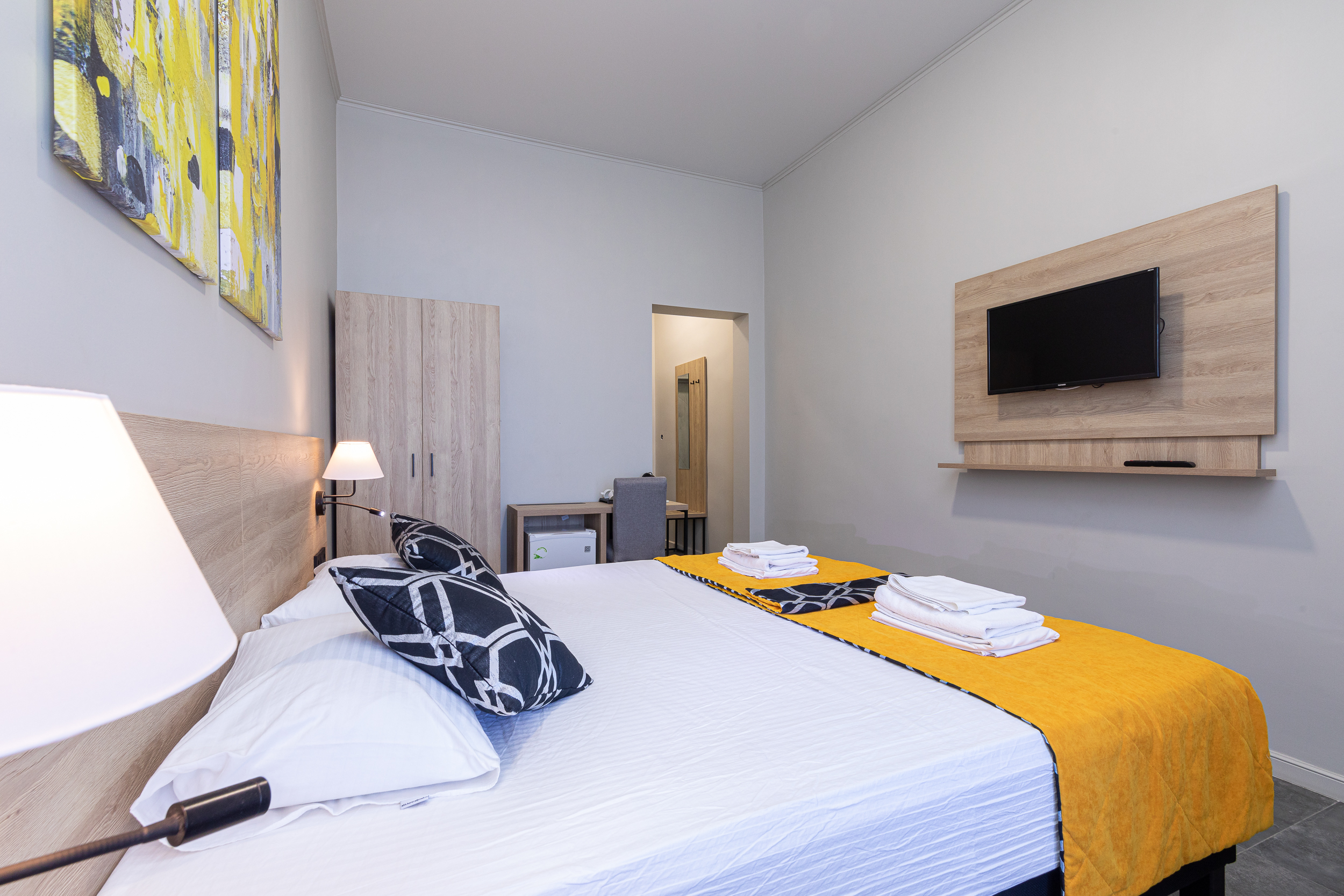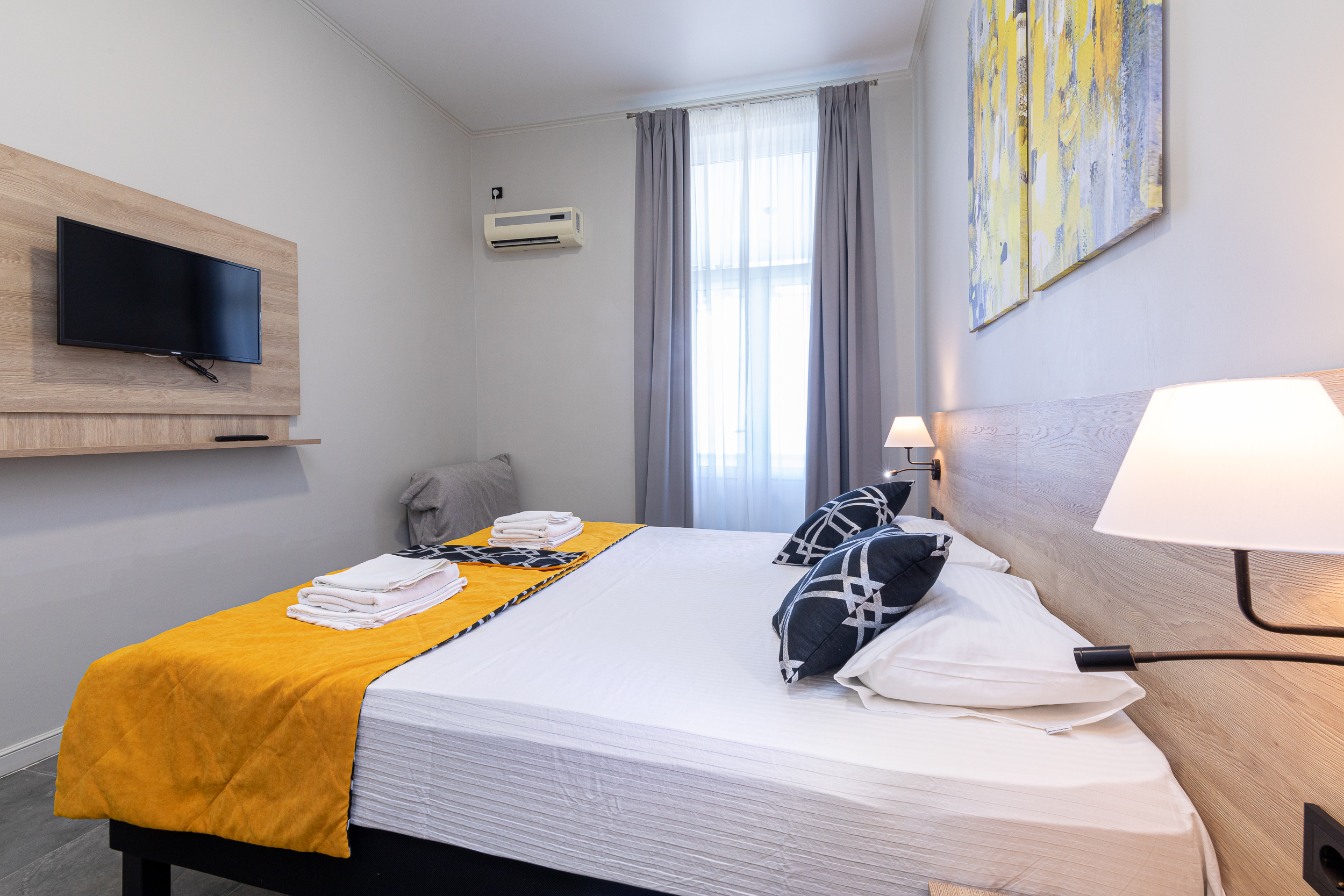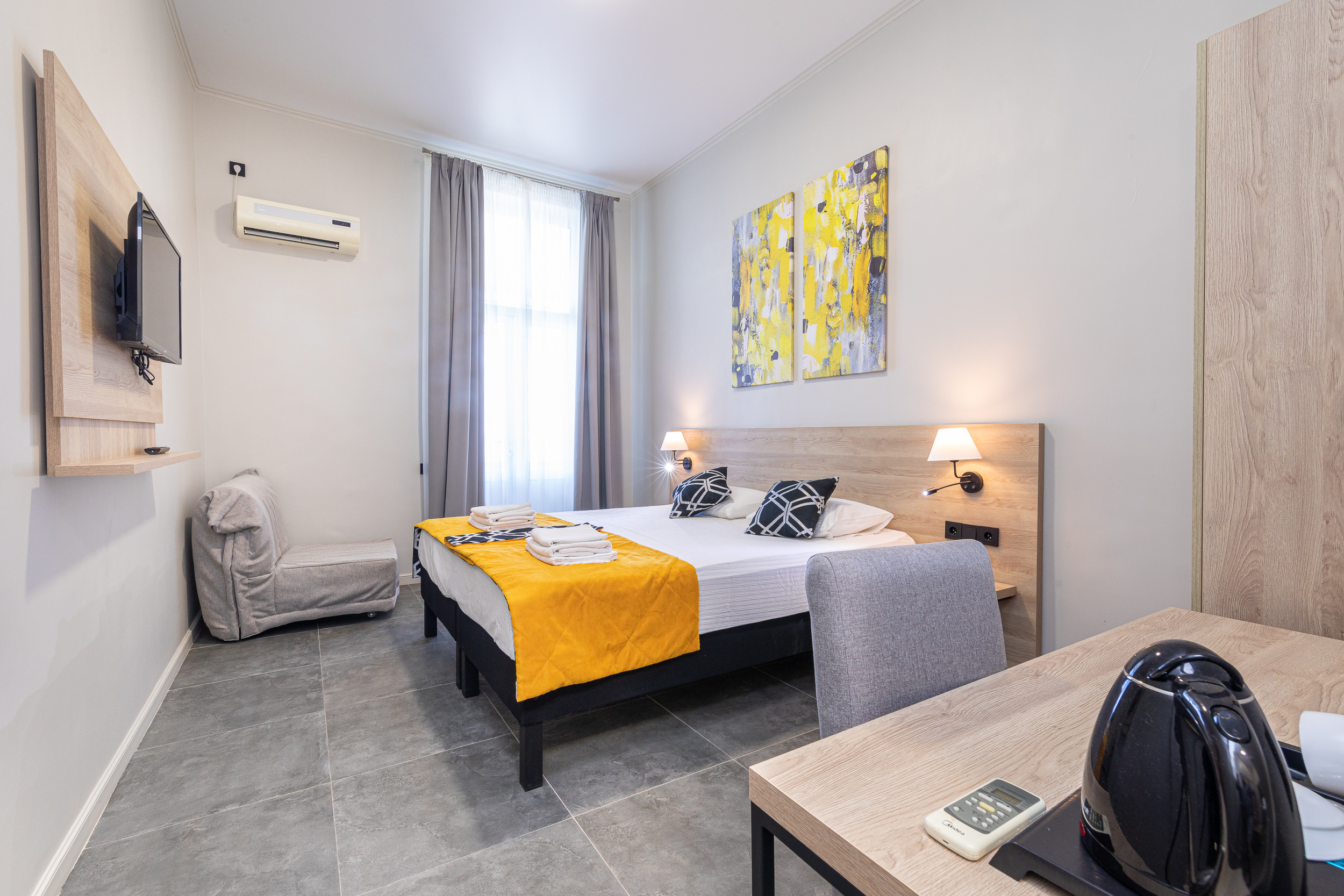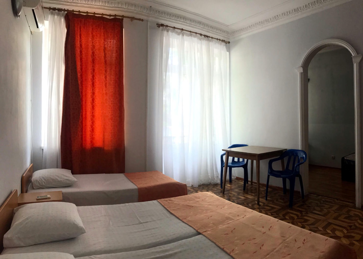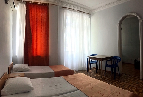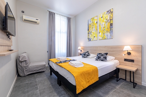В номере: вешалка, зеркало, кресло-кровать, кровати односпальные, прикроватные тумбочки, стол, стул, шкаф, кондиционер, мини-холодильник, телевизор