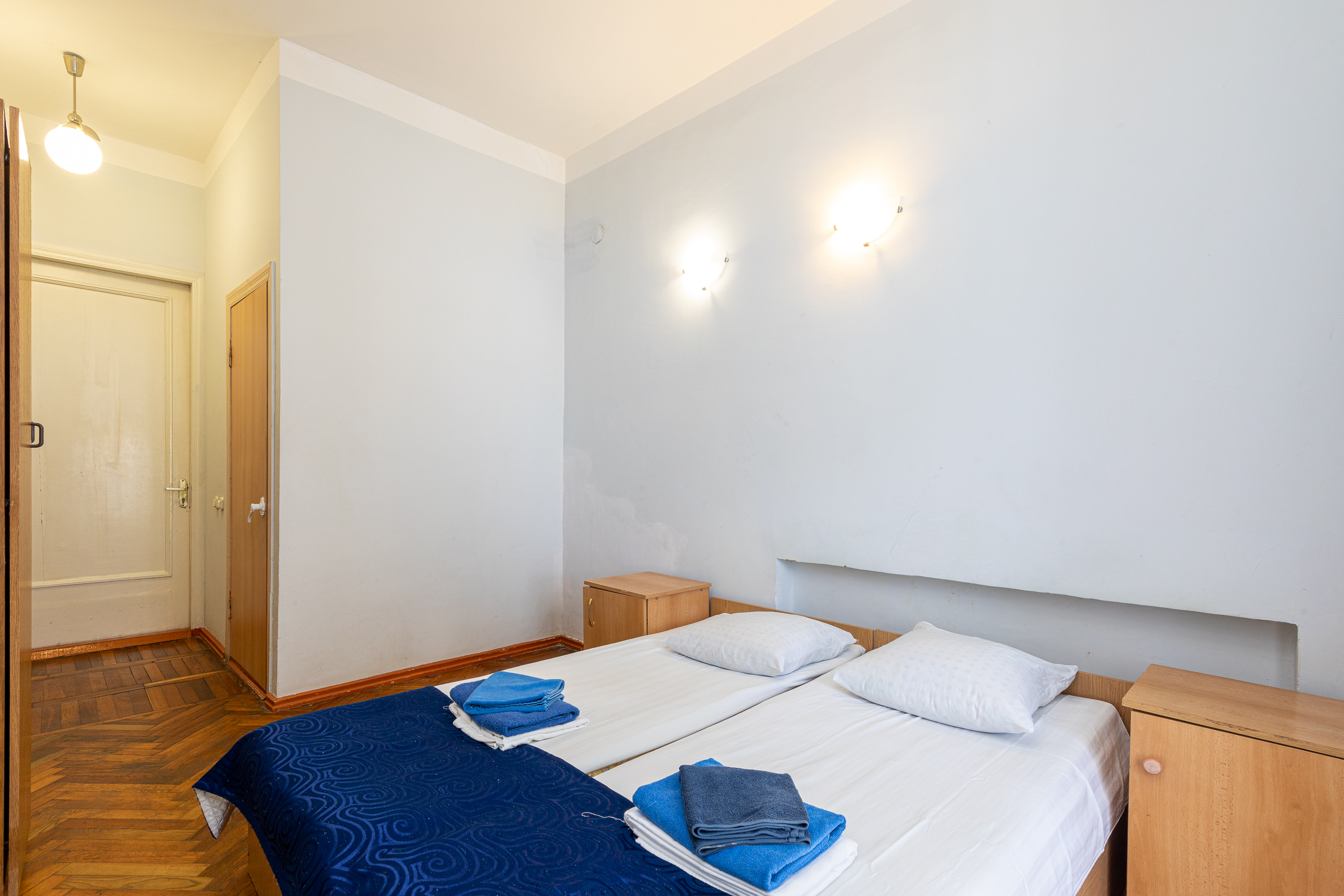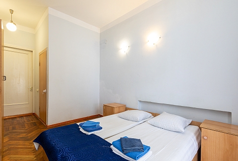 В номере: вешалка, зеркало, кровати односпальные, прикроватные тумбочки, шкаф, кондиционер, телевизор, холодильник, электрочайник