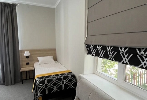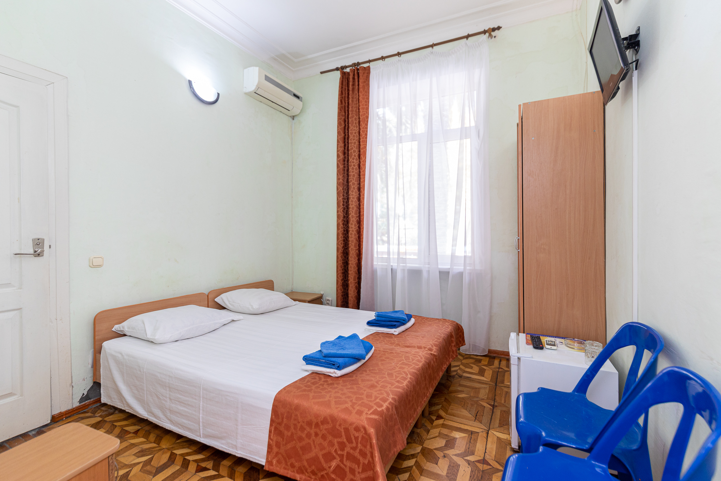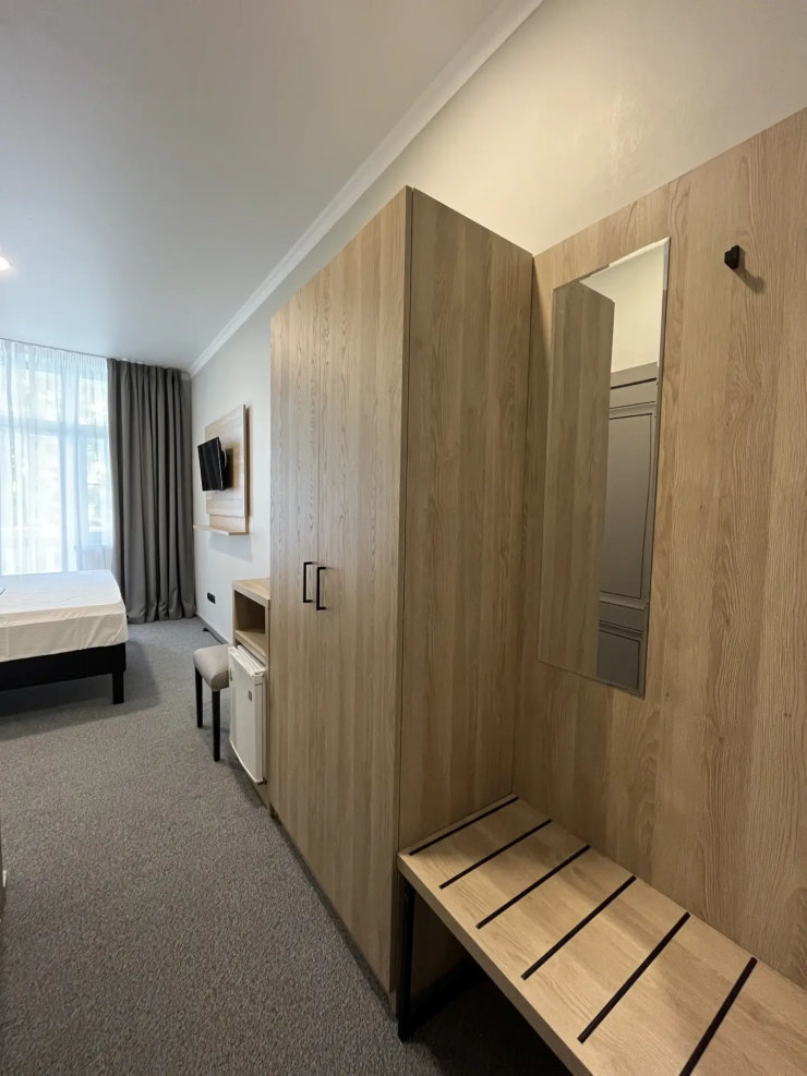 В номере: вешалка, зеркало, кровать односпальная, прикроватная тумбочка, стол, стул, шкаф, кондиционер, мини-холодильник, телевизор
