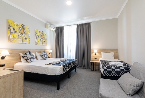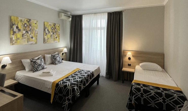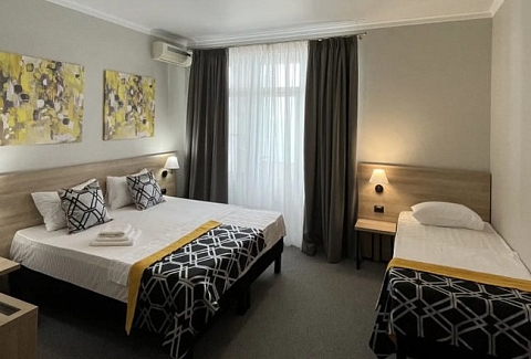 В номере: вешалка, зеркало, кресло-кровать, кровати односпальные /одна двуспальная кровать, кровать односпальная, прикроватные тумбочки, стол, стул, шкаф, кондиционер, телевизор, холодильник, электрочайник