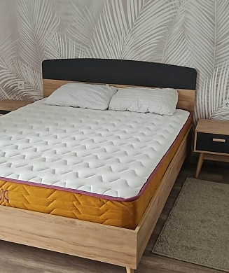 В номере: вешалка, зеркало, кровать двуспальная, прикроватные тумбочки, пуфик, стол, шкаф, кондиционер, сейф, телевизор, холодильник