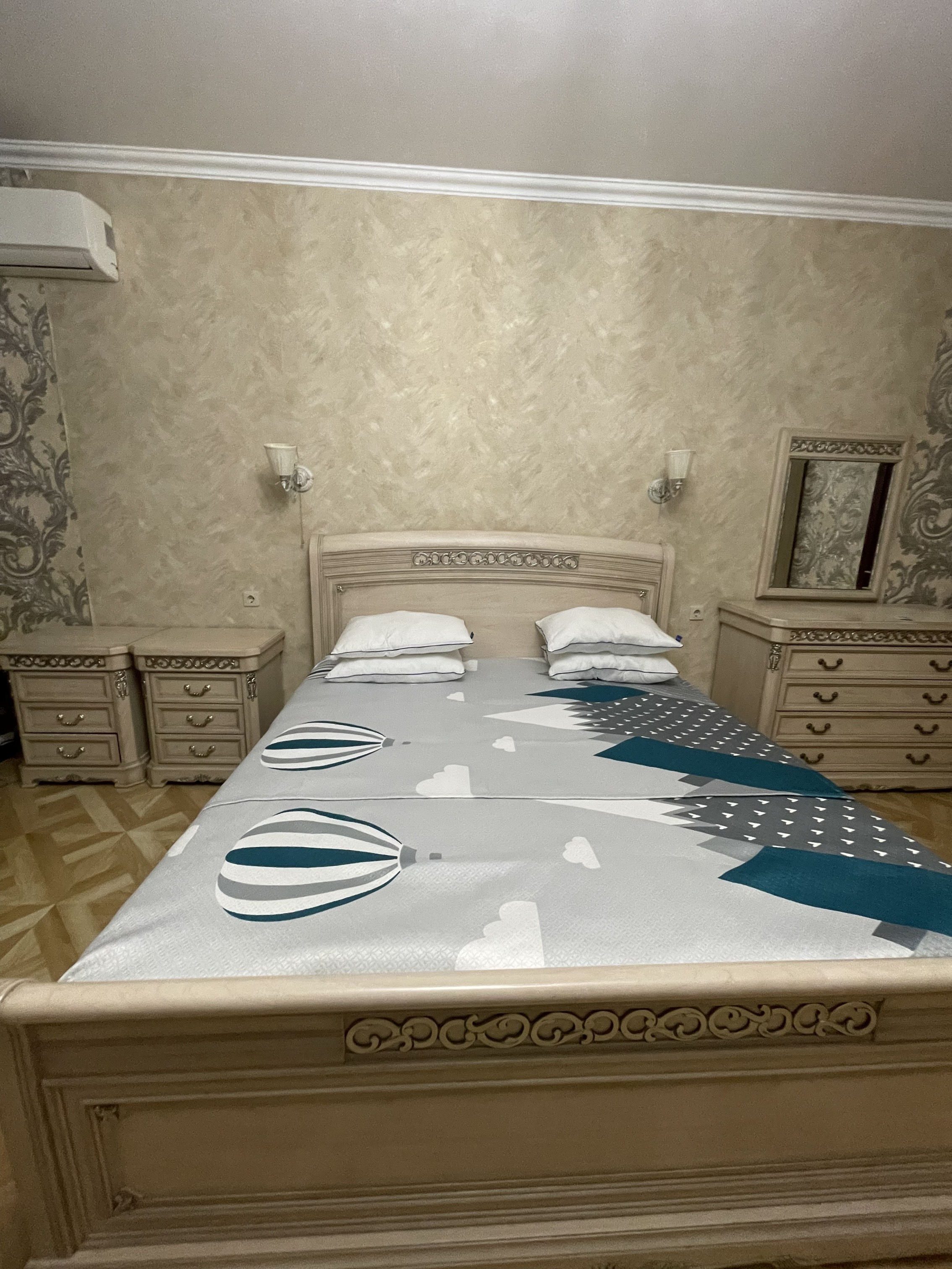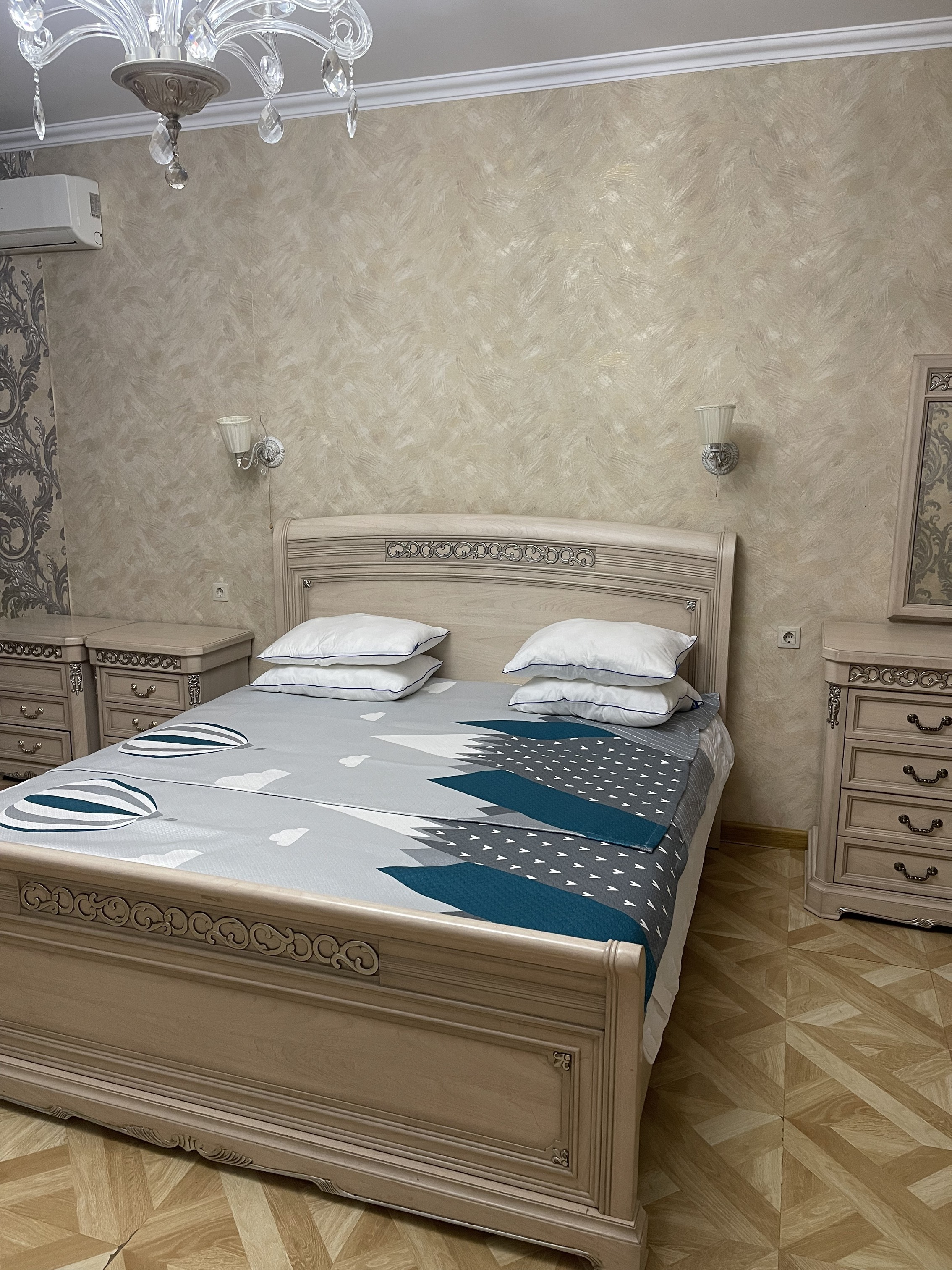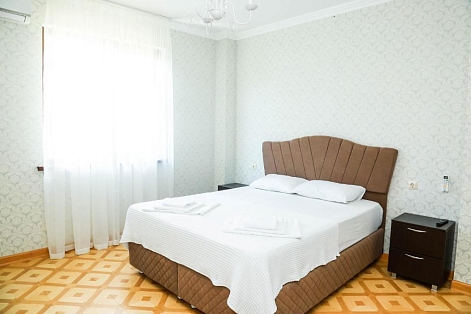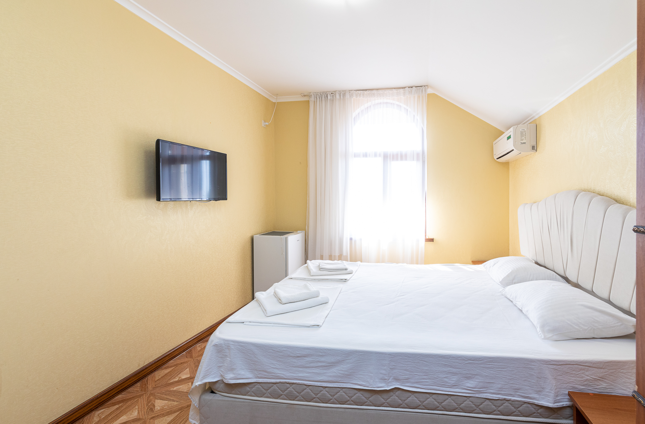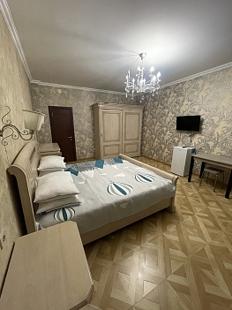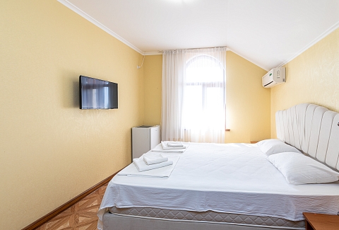 В номере: вешалка, диван раскладной, зеркало, кровать двуспальная, прикроватные тумбочки, стол, стулья, шкаф, кондиционер, мини-холодильник, телевизор