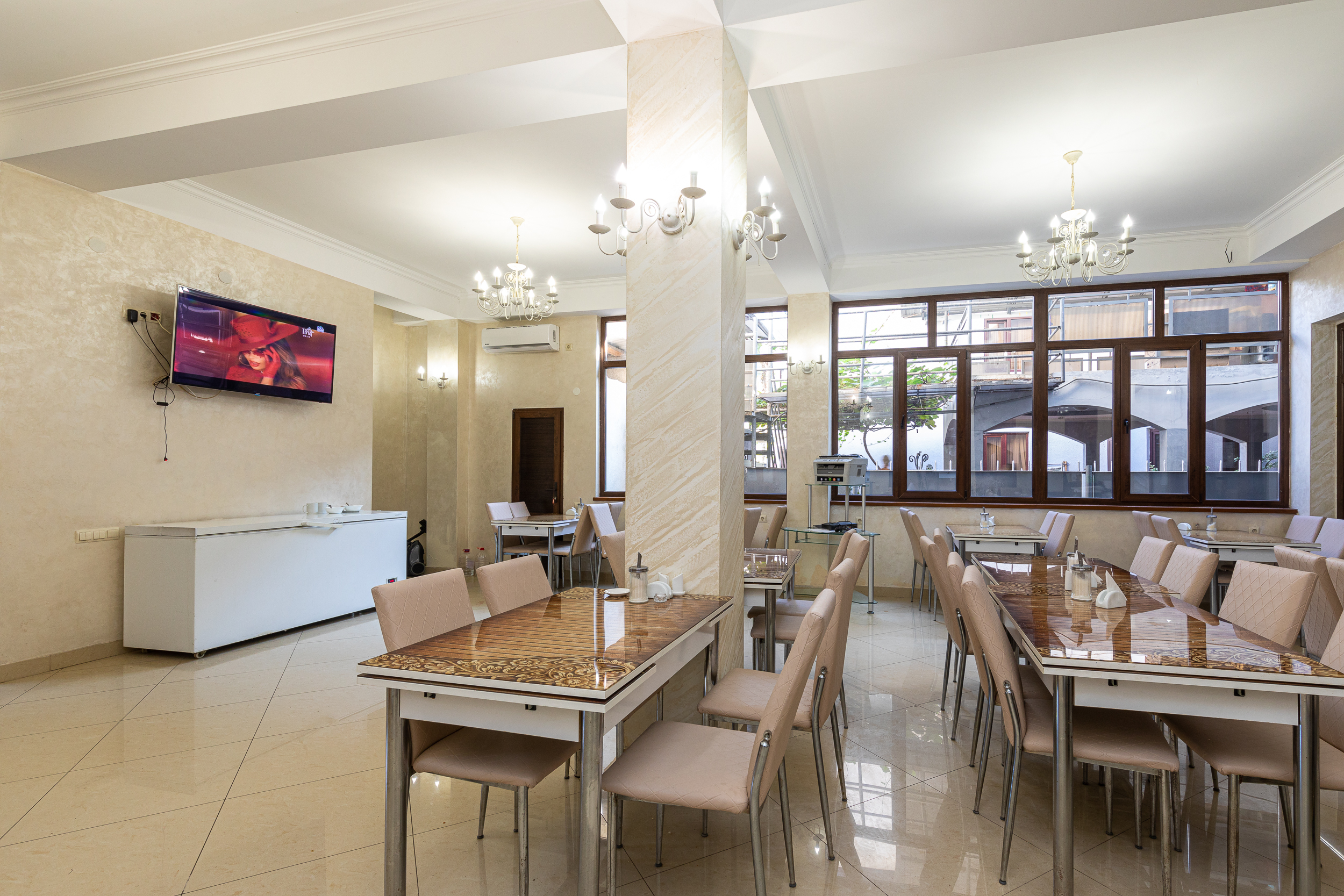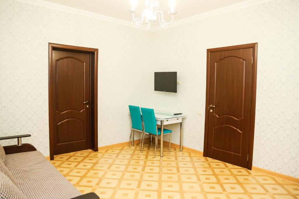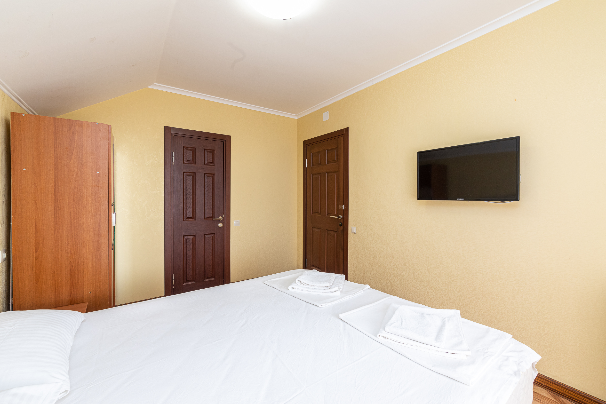 В номере: вешалка, диван раскладной, зеркало, кровать двуспальная, прикроватные тумбочки, стол, стулья, шкаф, кондиционер, мини-холодильник, телевизор
