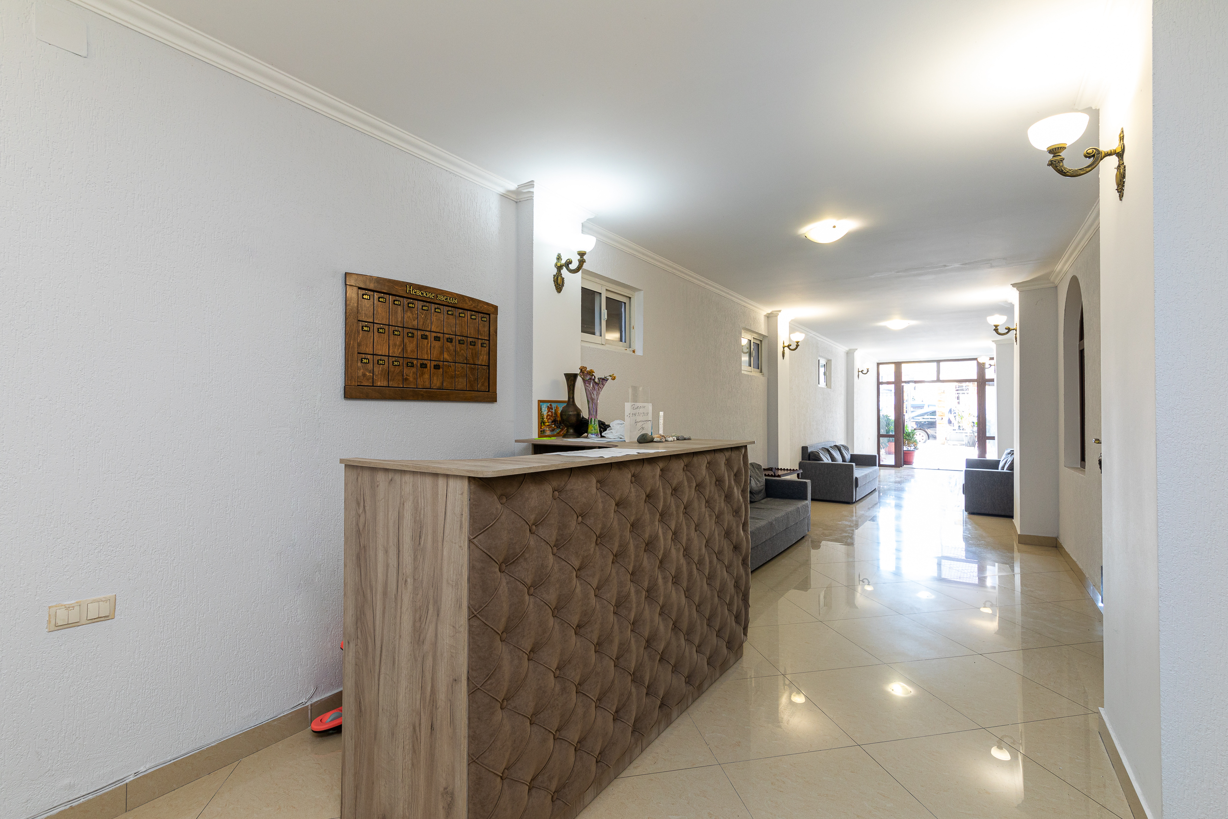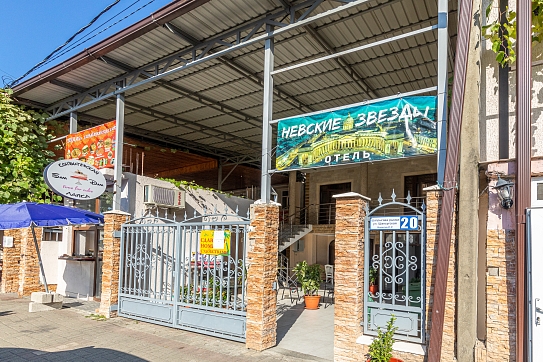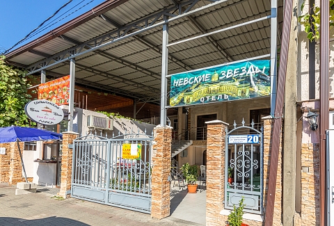 Отель, напоминающий дворянский особняк, расположен на закрытом от посторонних участке. Владельцы отеля позаботились о том, чтобы уютным был не только он сам, но и его территория. «Невские звезды» – это ухоженные дорожки, внутренний дворик, клумбы, миниатюрные лужайки, места для отдыха и безупречная чистота. Номера гостевого дома, от «стандарта» до «люкса», выглядят светло и уютно. В каждом есть необходимая бытовая техника и удобная мебель. Завтраки, обеды и ужины подают в столовой отеля. При желании можно найти кафе или ресторан неподалеку от отеля: в центре города есть много вариантов на разный вкус. Песчано-галечный городской пляж находится в 200 метрах от отеля. На берегу есть навесы и шезлонги.
