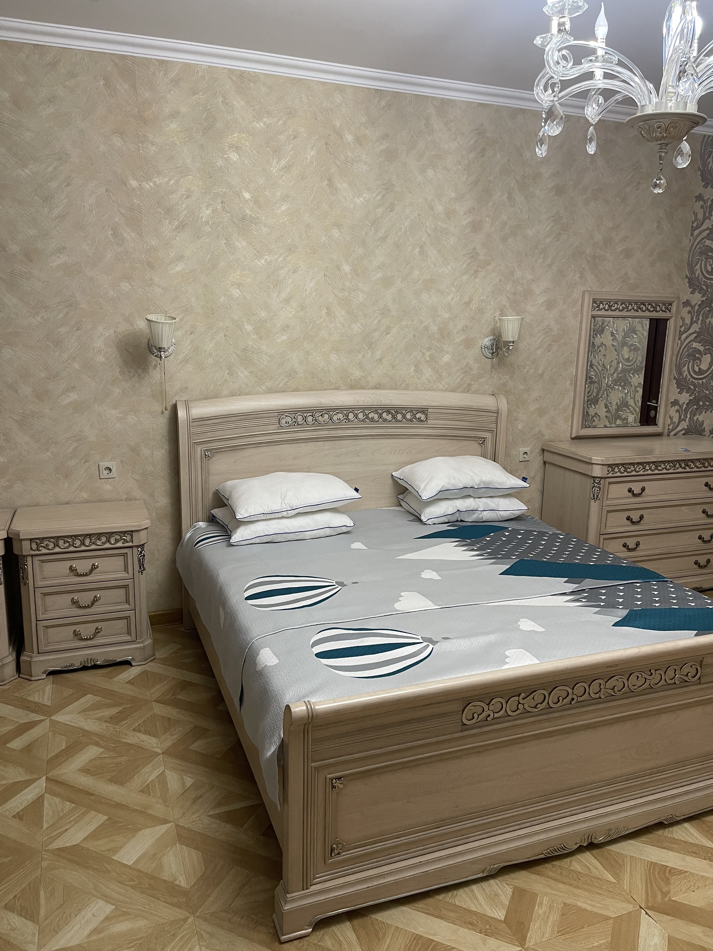 В номере: вешалка, диван, зеркало, комод, кровать двуспальная, прикроватные тумбочки, стол, стул, шкаф, кондиционер, мини-холодильник, телевизор