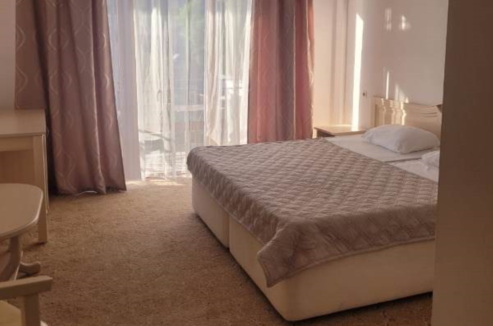 В номере: вешалка, зеркало, кровать двуспальная, прикроватные тумбочки, стол, стул, шкаф, кондиционер, телевизор, холодильник, чайный набор посуды, электрочайник
