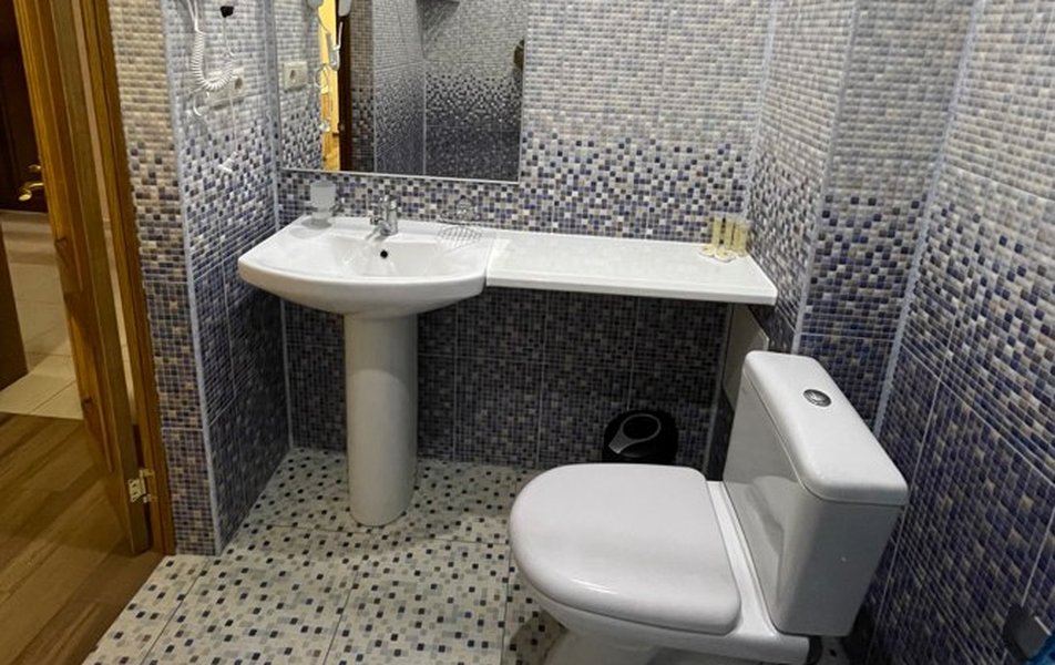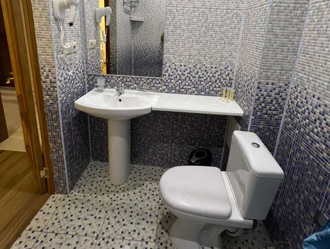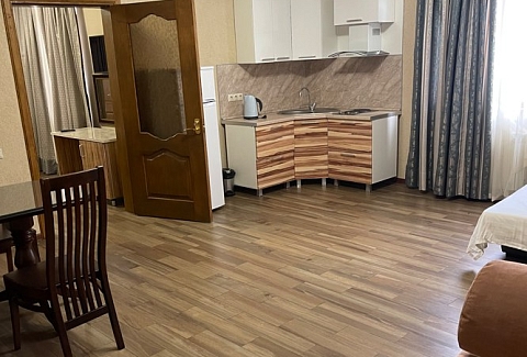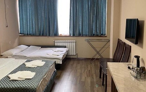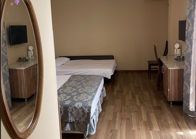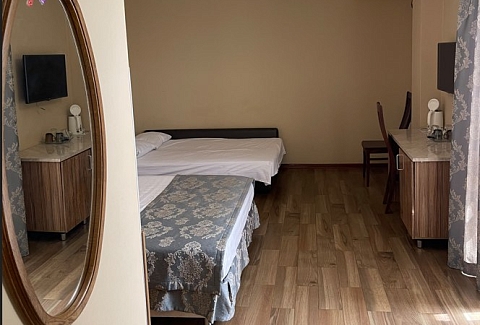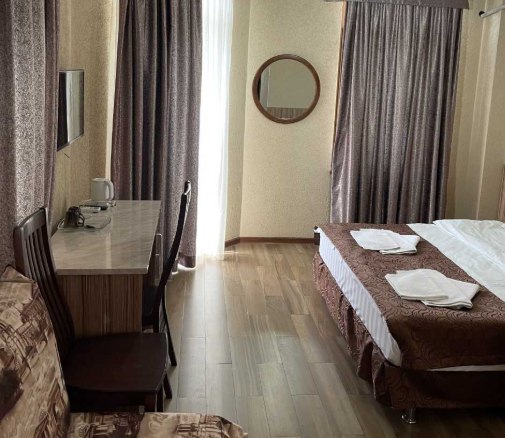 В номере: вешалка, диван раскладной, зеркало, кровать двуспальная, прикроватные тумбочки, стол, стулья, шкаф, кондиционер, мини-холодильник, сейф, телевизор ЖК, чайный набор посуды, электрочайник
