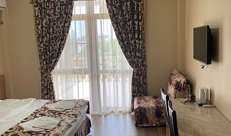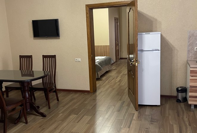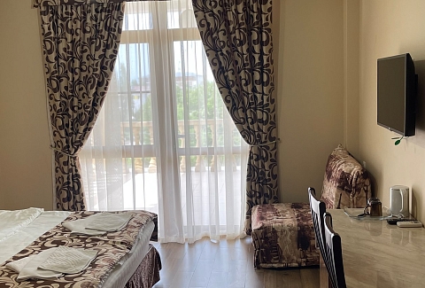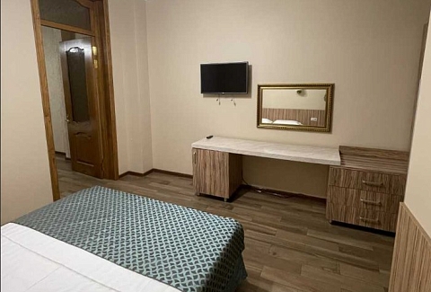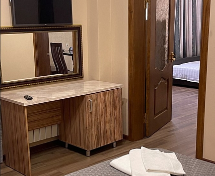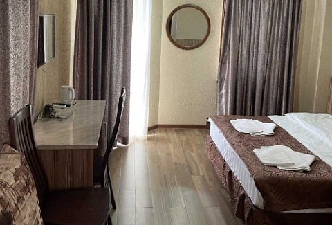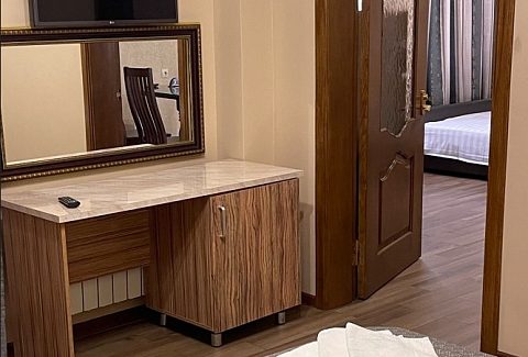 В номере: вешалка, диван, зеркало, кровать двуспальная, прикроватные тумбочки, стол, стулья, шкаф, кондиционер, мини-холодильник, сейф, телевизор ЖК, чайный набор посуды, электрочайник