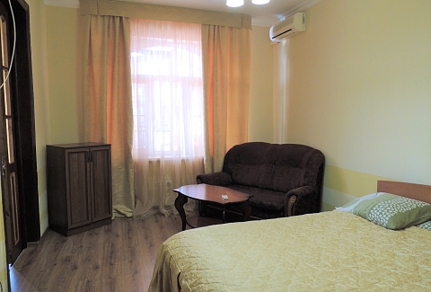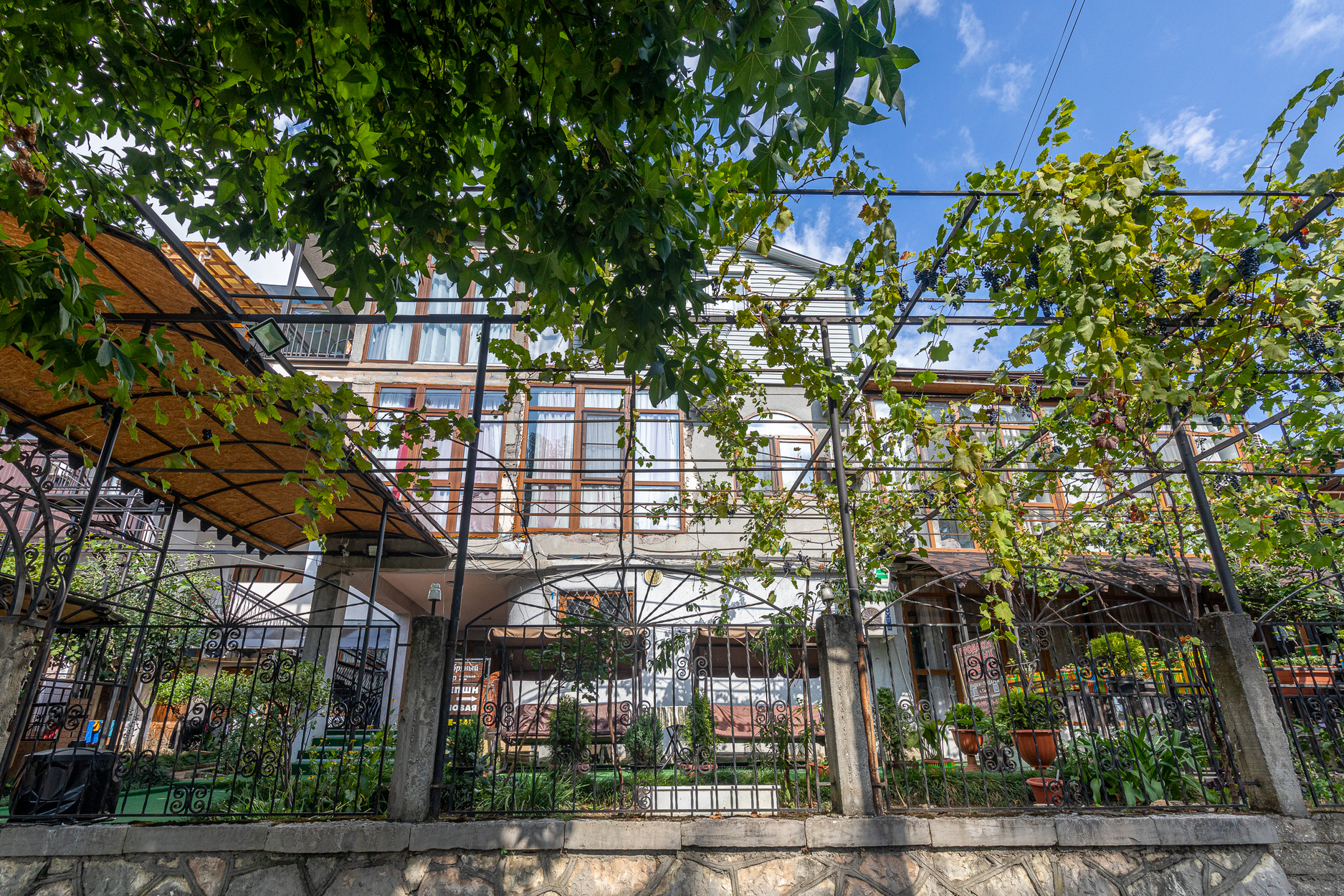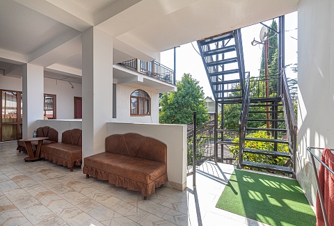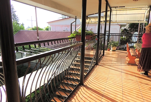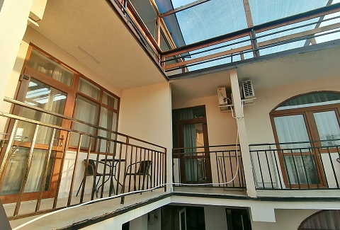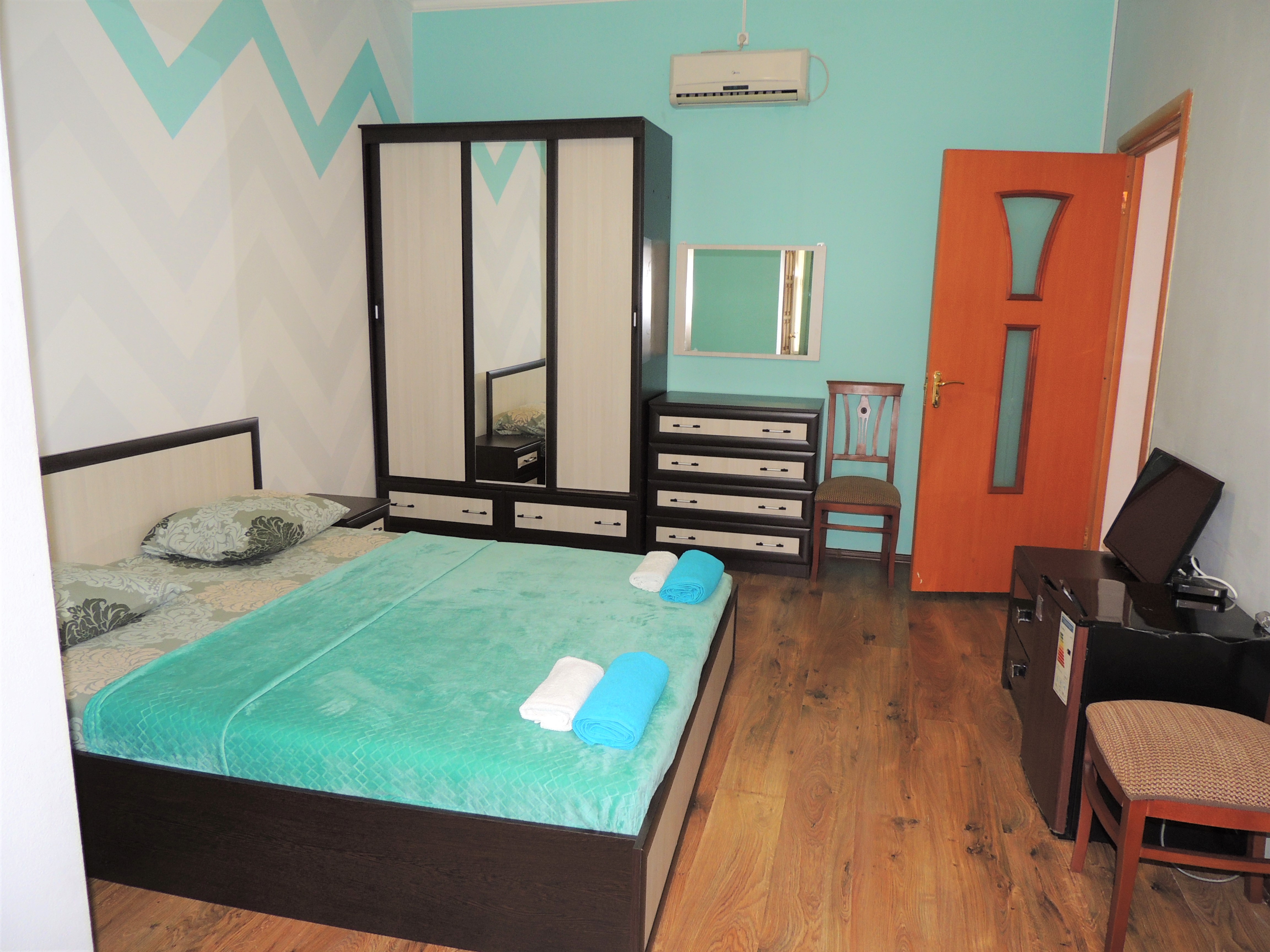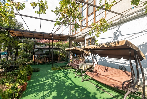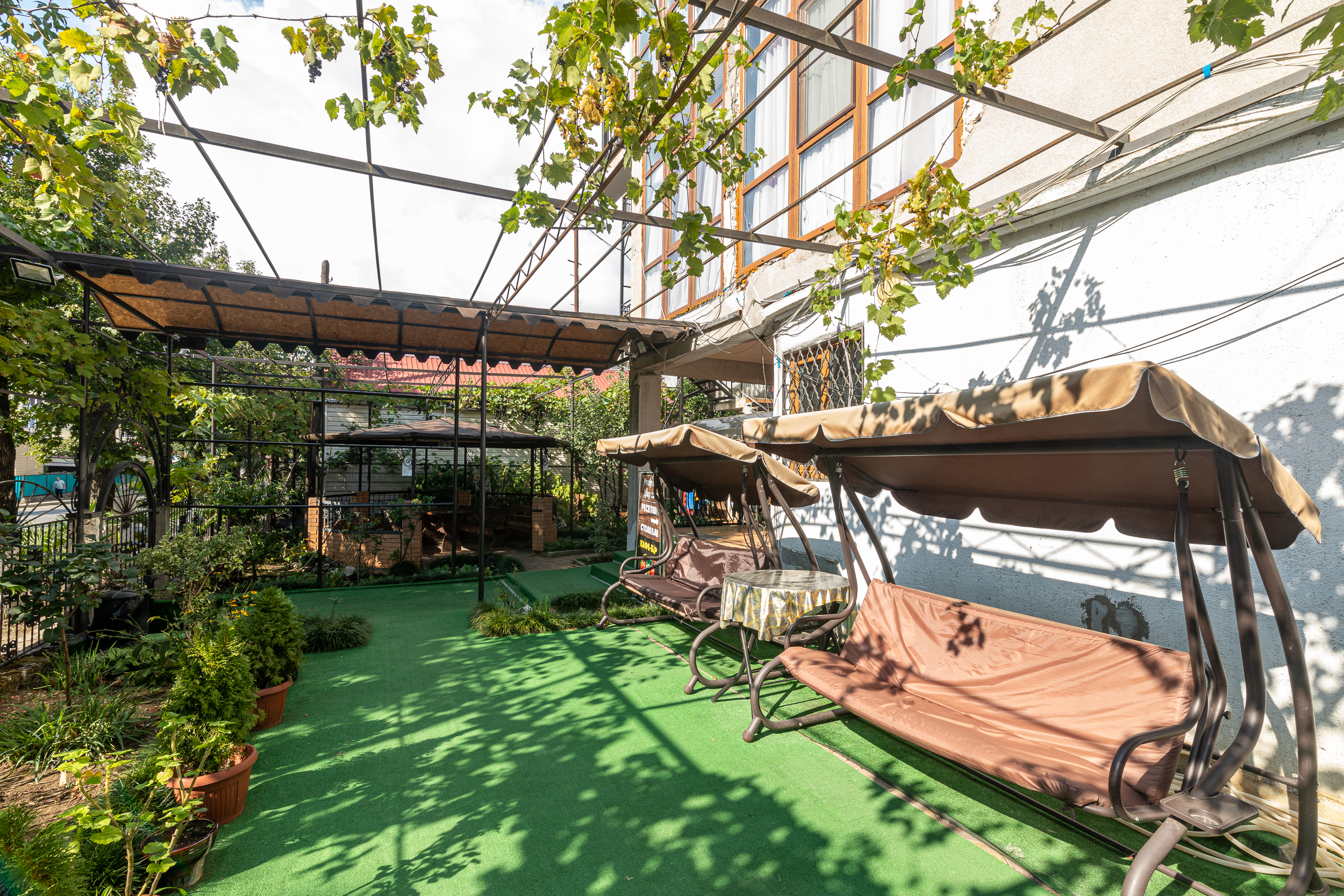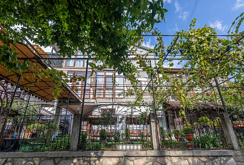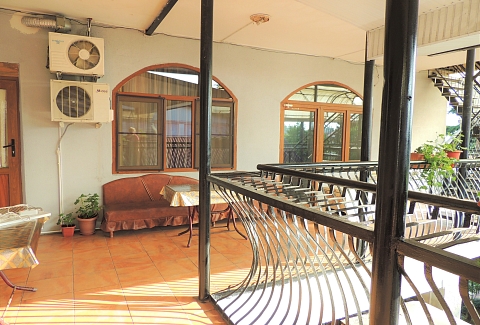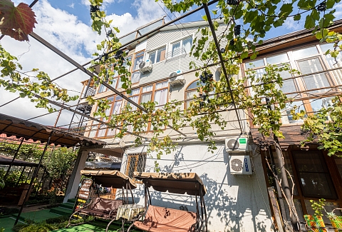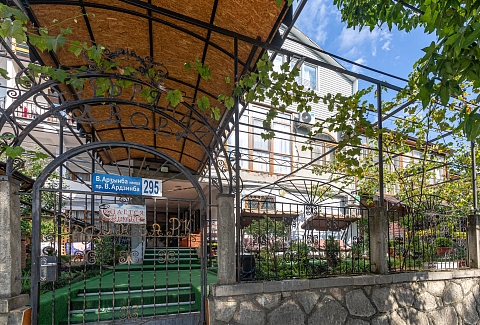 Гостиница представляет собой трехэтажный коттедж, способный разместить около 30 человек. Номера жилого фонда категорий «стандарт» снабжены санузлами с душем, для класса «эконом» удобства находятся на этаже. Все номера оборудованы кондиционерами и телевизорами, отдельные холодильники есть в «стандартах», а для «экономов» – также на этаже. Есть мангальная зона для шашлыков во дворе. Дорога к морю отнимает 5 -7 минут и проходит по тенистому Парку Славы или улочке, наполненной магазинчиками и кафе. Кроме ближайшего общественного пляжа, рядом немало пляжей пансионатов и гостиниц, которые можно посещать по договоренности. На берегу работают пункты проката и кафе, есть водные аттракционы для детей и взрослых.