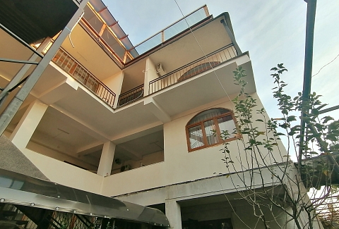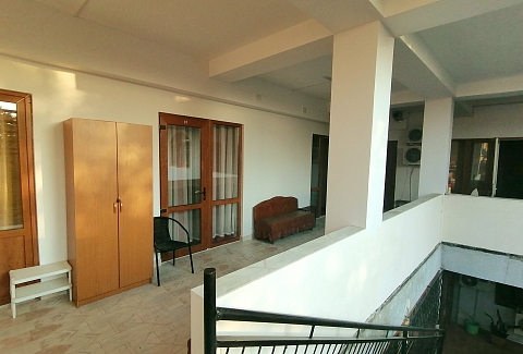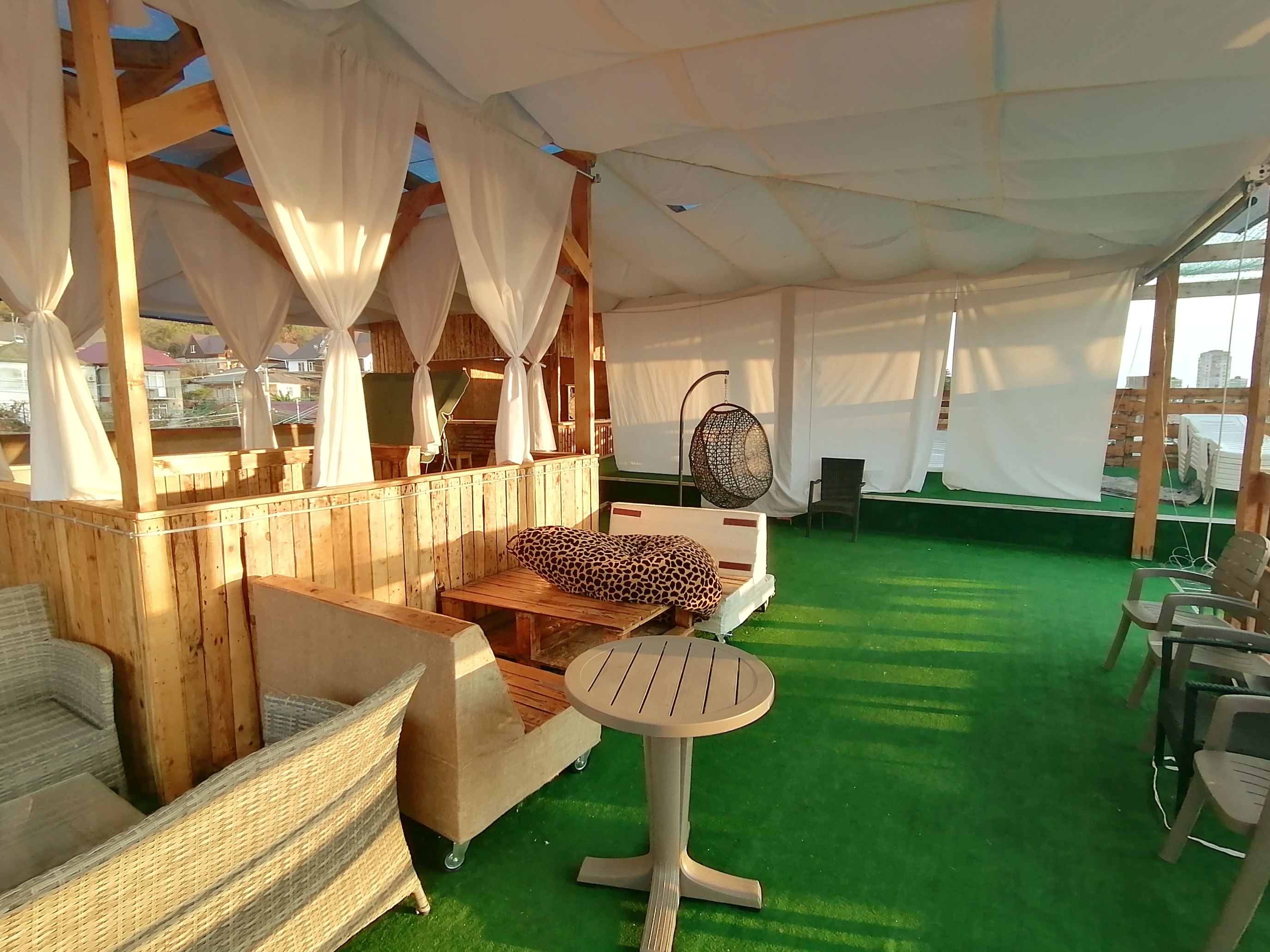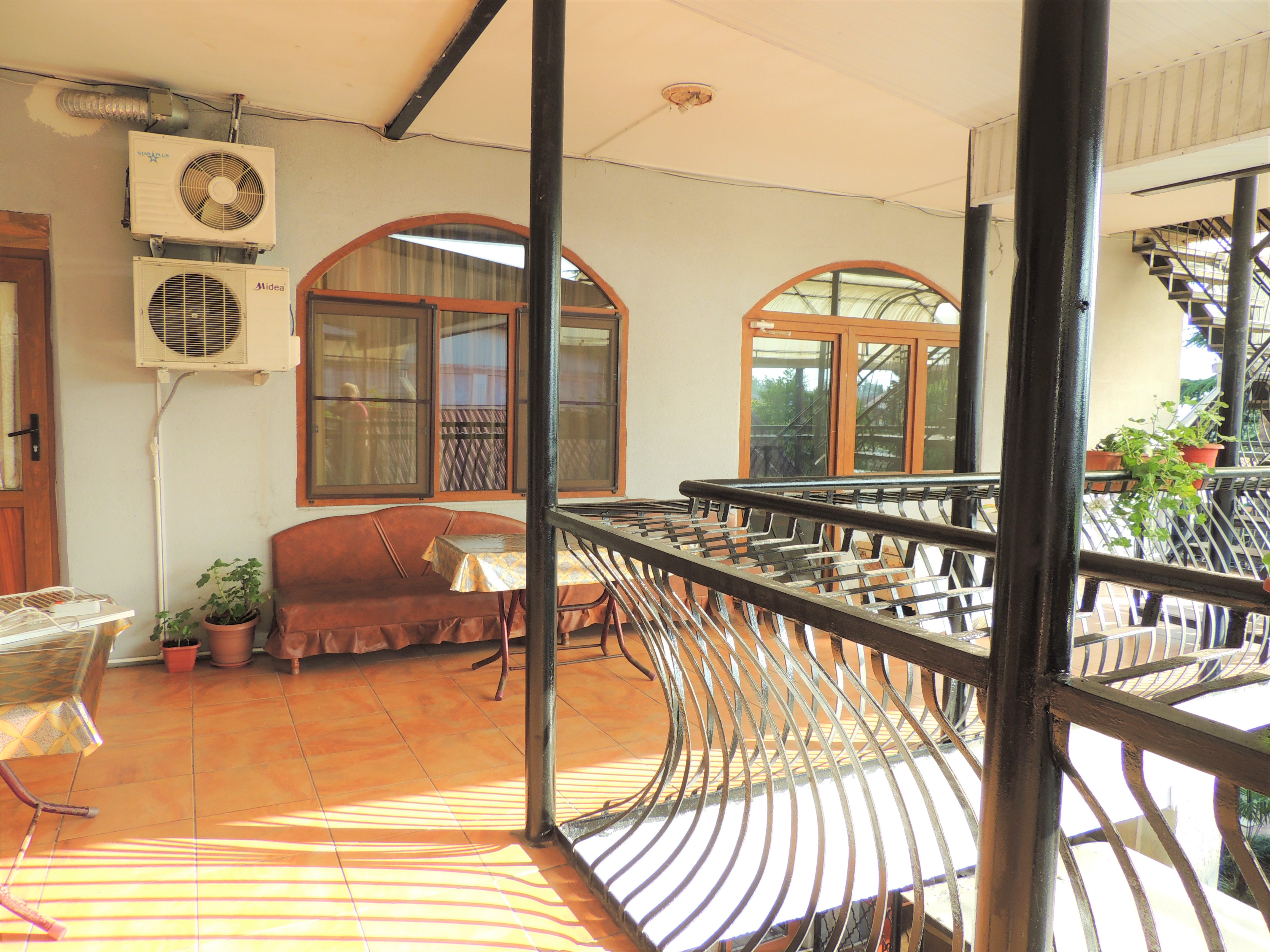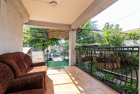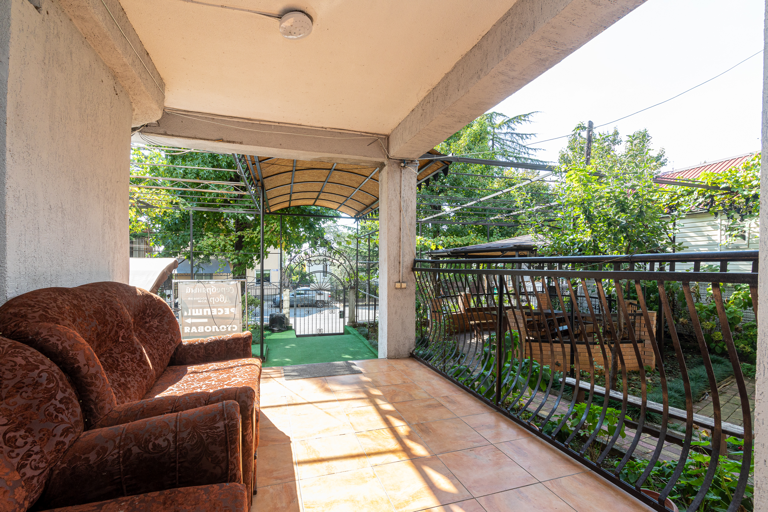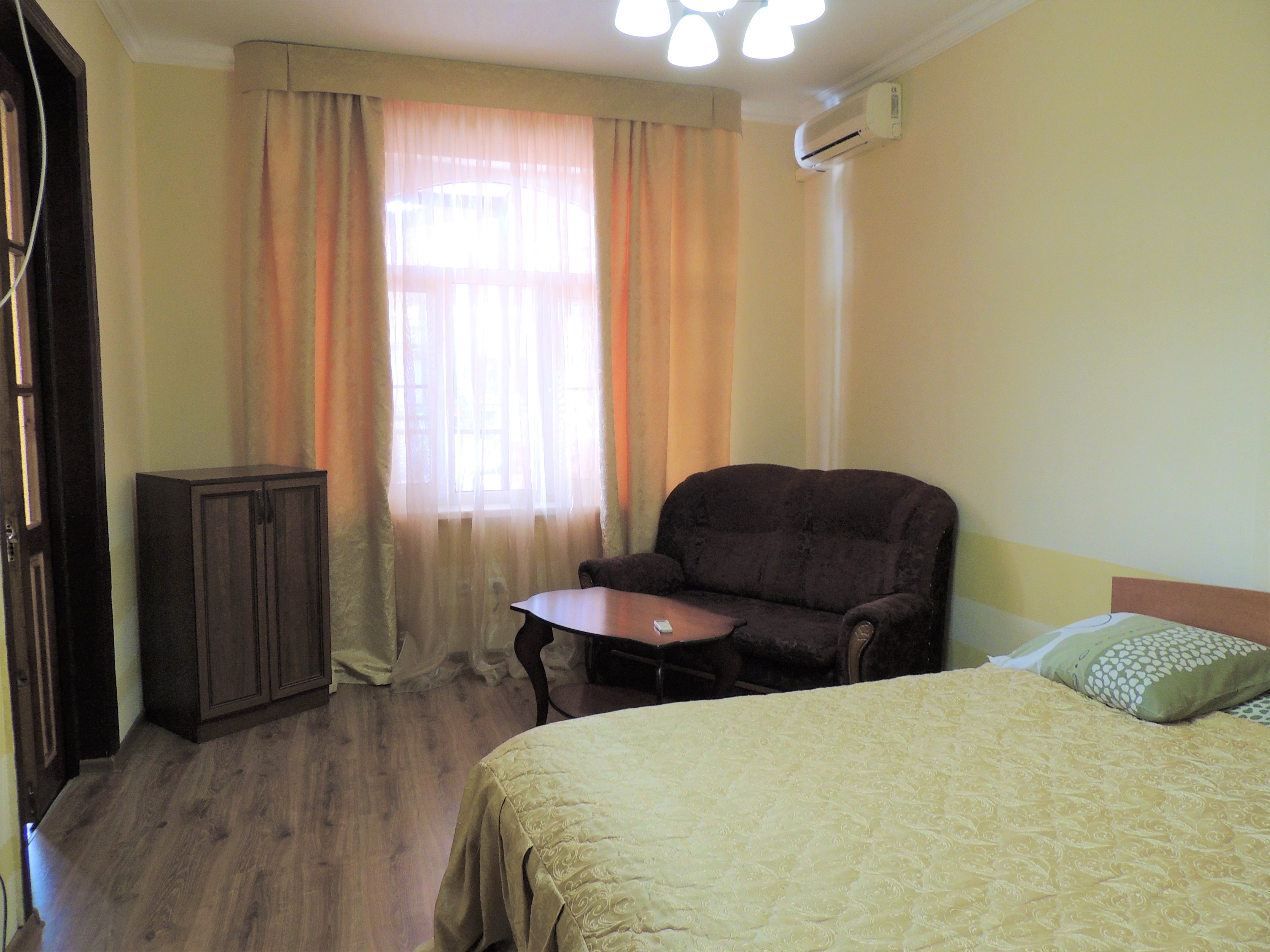Гостиница представляет собой трехэтажный коттедж, способный разместить около 30 человек. Номера жилого фонда категорий «стандарт» снабжены санузлами с душем, для класса «эконом» удобства находятся на этаже. Все номера оборудованы кондиционерами и телевизорами, отдельные холодильники есть в «стандартах», а для «экономов» – также на этаже. Есть мангальная зона для шашлыков во дворе. Дорога к морю отнимает 5 -7 минут и проходит по тенистому Парку Славы или улочке, наполненной магазинчиками и кафе. Кроме ближайшего общественного пляжа, рядом немало пляжей пансионатов и гостиниц, которые можно посещать по договоренности. На берегу работают пункты проката и кафе, есть водные аттракционы для детей и взрослых.