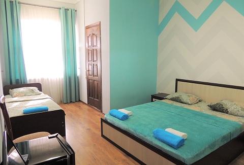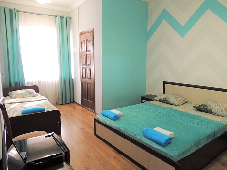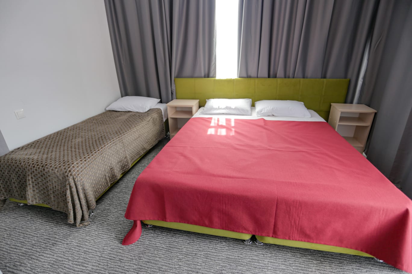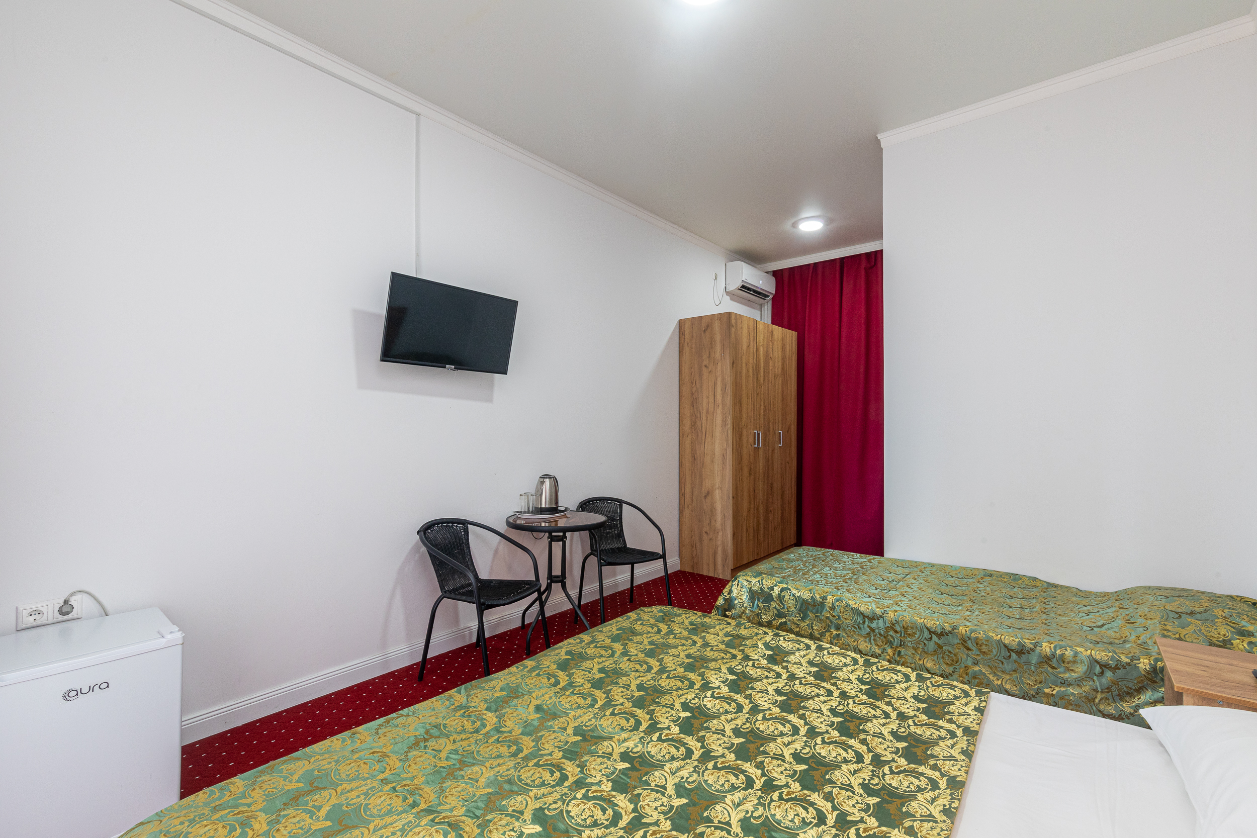 В номере: вешалка, зеркало, кровать двуспальная, кровать односпальная, прикроватные тумбочки, стол, стулья, шкаф, кондиционер, телевизор, холодильник