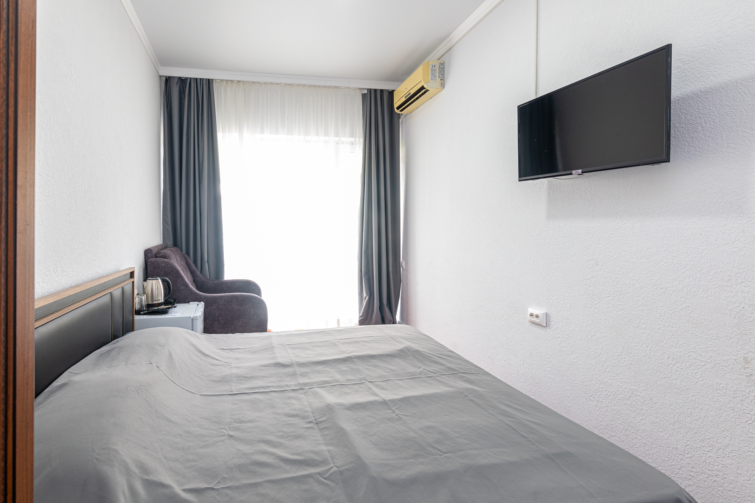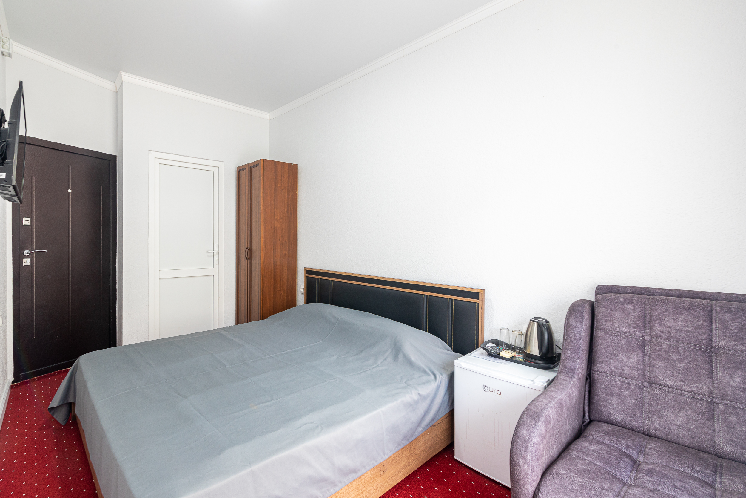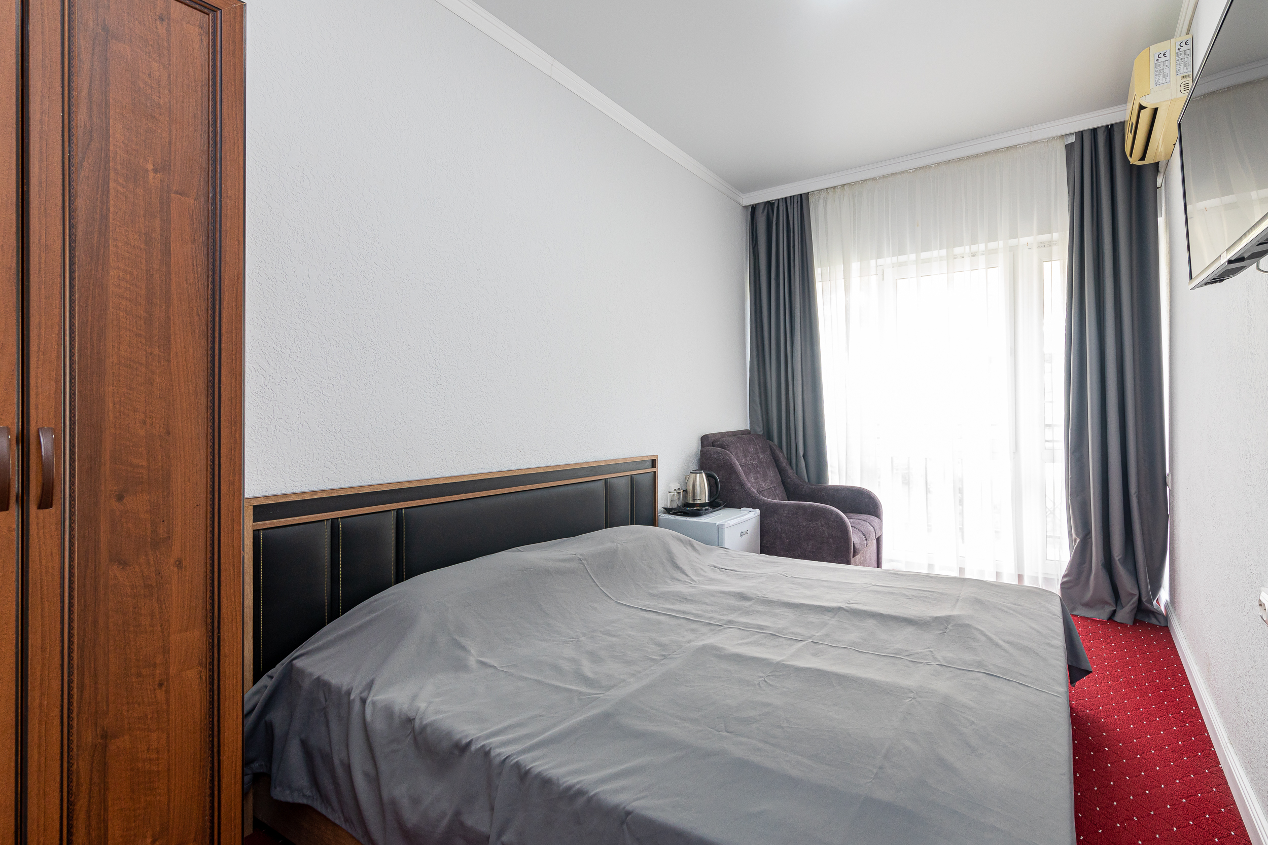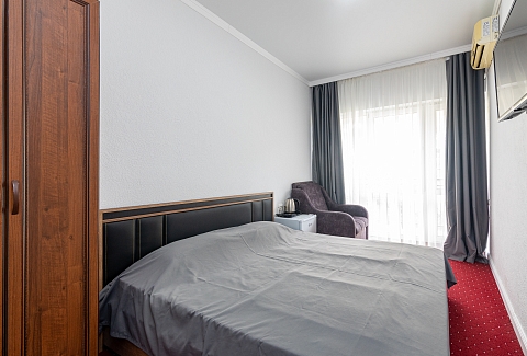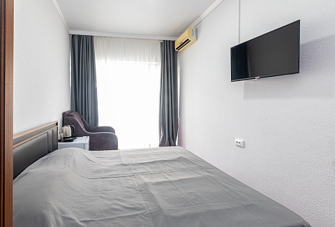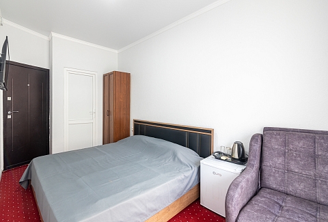 В номере: вешалка, зеркало, кресло, кровать двуспальная, шкаф, кондиционер, телевизор, холодильник