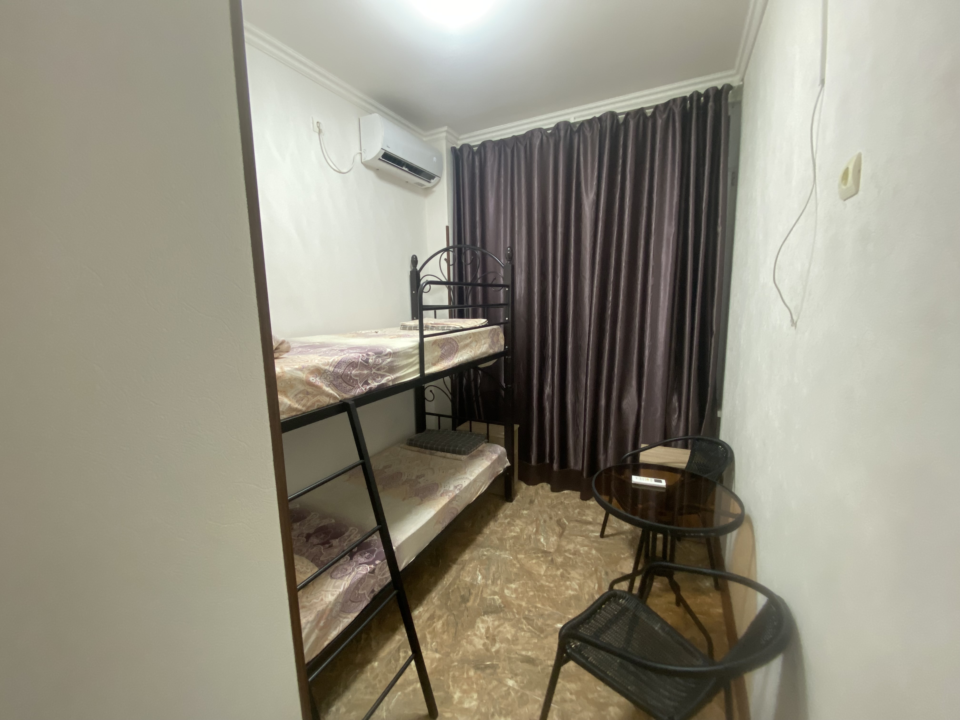 В номере: вешалка, зеркало, кровать двуспальная, кровать двухъярусная, прикроватная тумбочка, стол, стул, шкаф, кондиционер, телевизор, холодильник