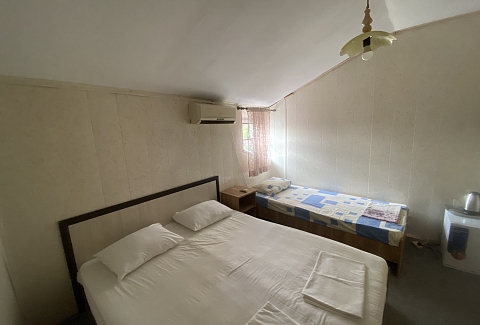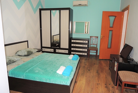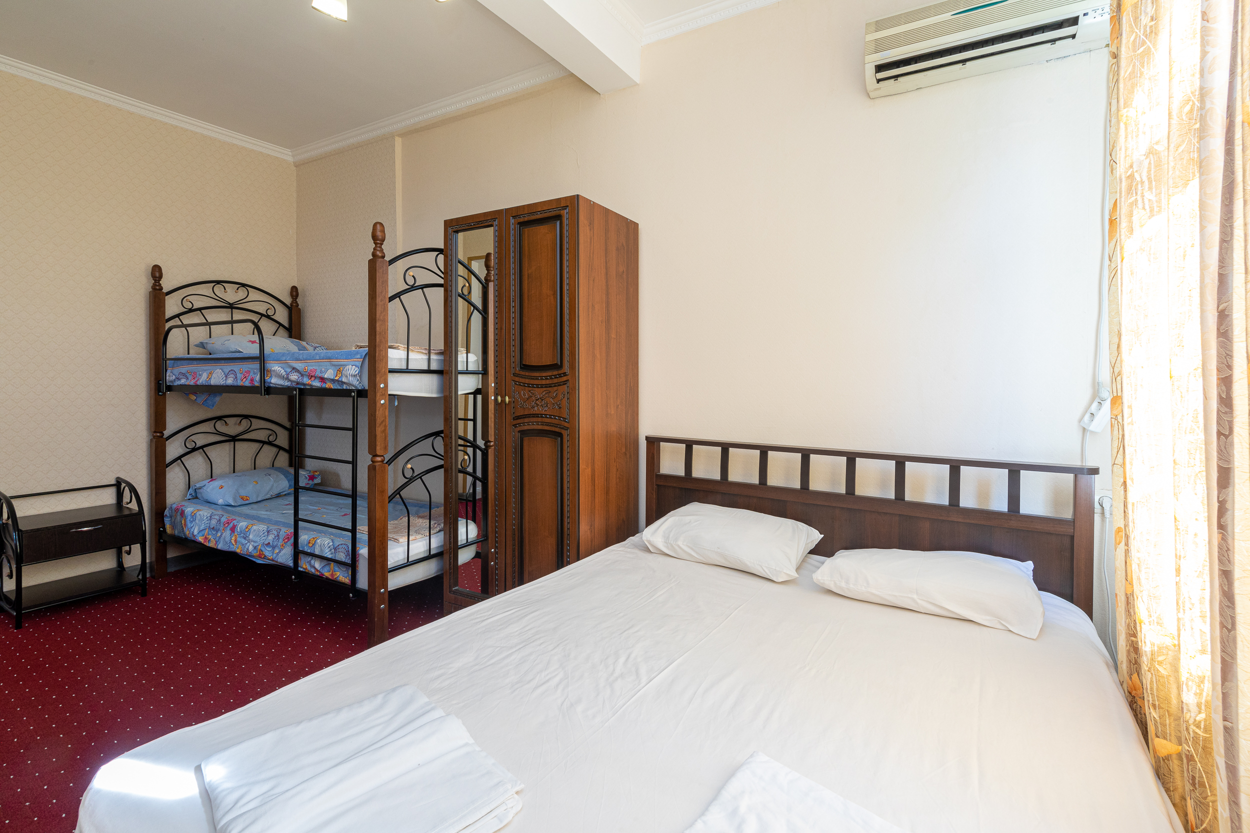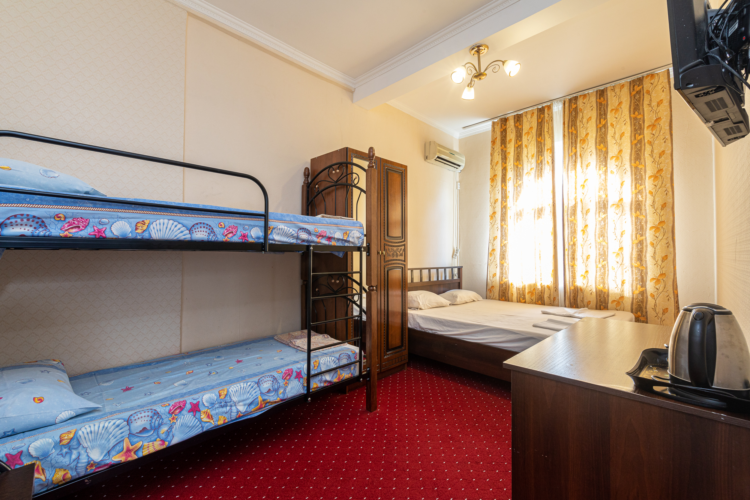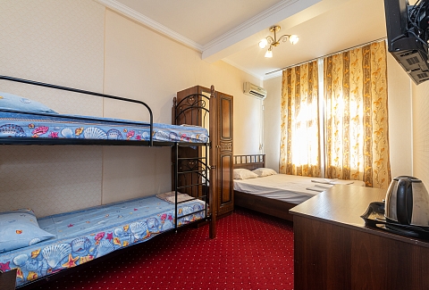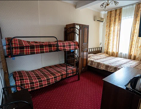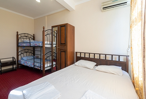 В номере: вешалка, зеркало, кровать двуспальная, кровать двухъярусная, прикроватные тумбочки, стол, стулья, шкаф, кондиционер, телевизор, холодильник, электрочайник