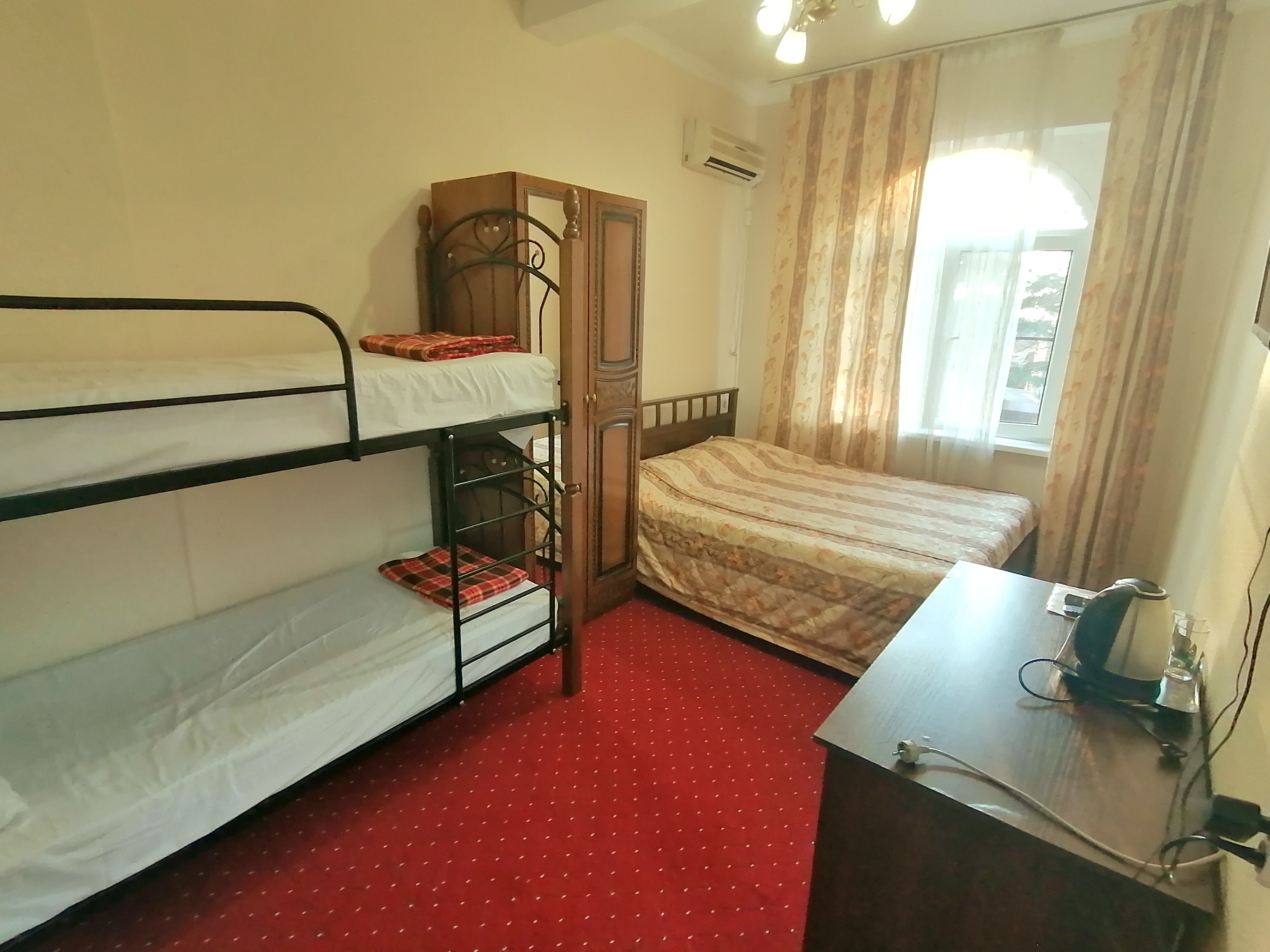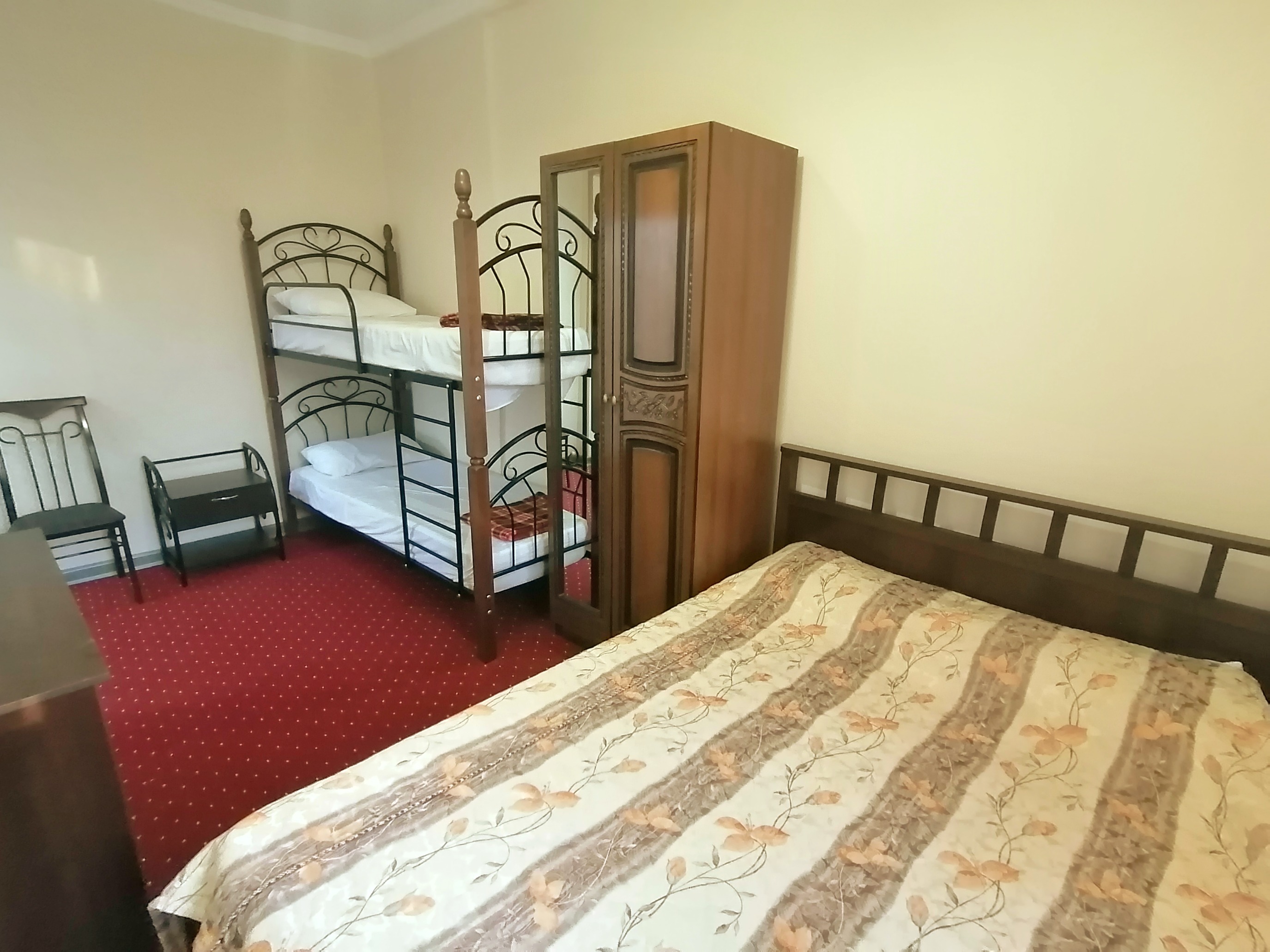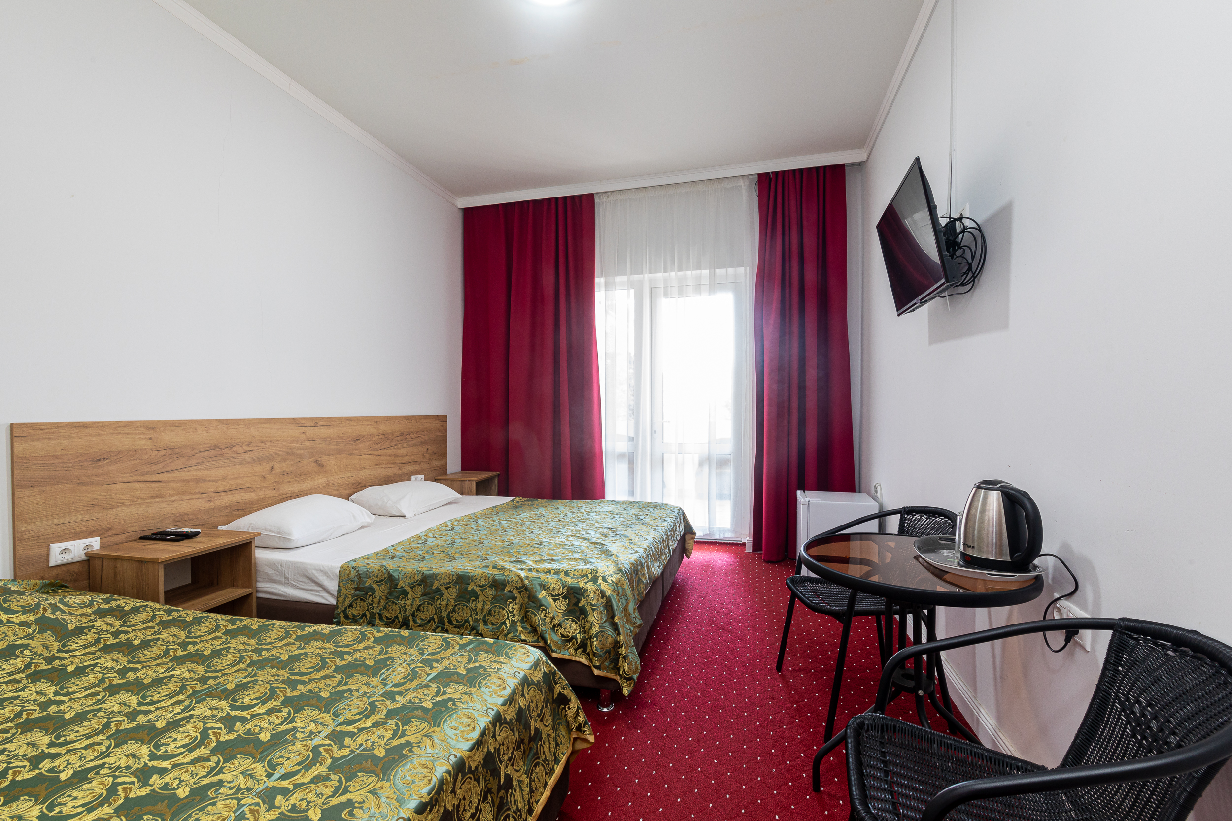 В номере: вешалка, зеркало, кровать двуспальная, кровать двухъярусная, прикроватные тумбочки, стол, стулья, шкаф, кондиционер, телевизор, холодильник, электрочайник