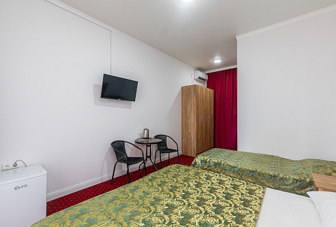 В номере: вешалка, зеркало, кровати односпальные /одна двуспальная кровать, прикроватные тумбочки, стол, стул, шкаф, кондиционер, телевизор, холодильник