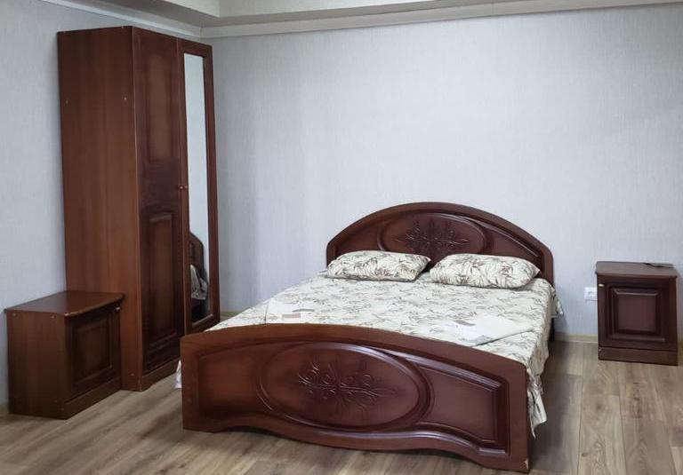 В номере: вешалка, диван раскладной, зеркало, кровать двуспальная, прикроватные тумбочки, стол, стулья, шкаф, гладильная доска, кондиционер, телевизор, утюг, холодильник, электрочайник