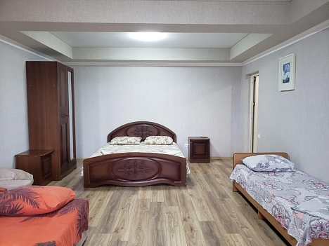 В номере: вешалка, диван раскладной, зеркало, кровать двуспальная, кровать односпальная, прикроватные тумбочки, шкаф, гладильная доска, кондиционер, мини-холодильник, телевизор, утюг, электрочайник
