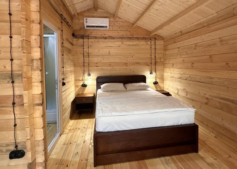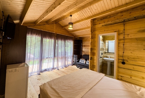 В номере: вешалка, диван, зеркало, кровать двуспальная, прикроватные тумбочки, стол, стул, шкаф, кондиционер, мини-холодильник, телевизор