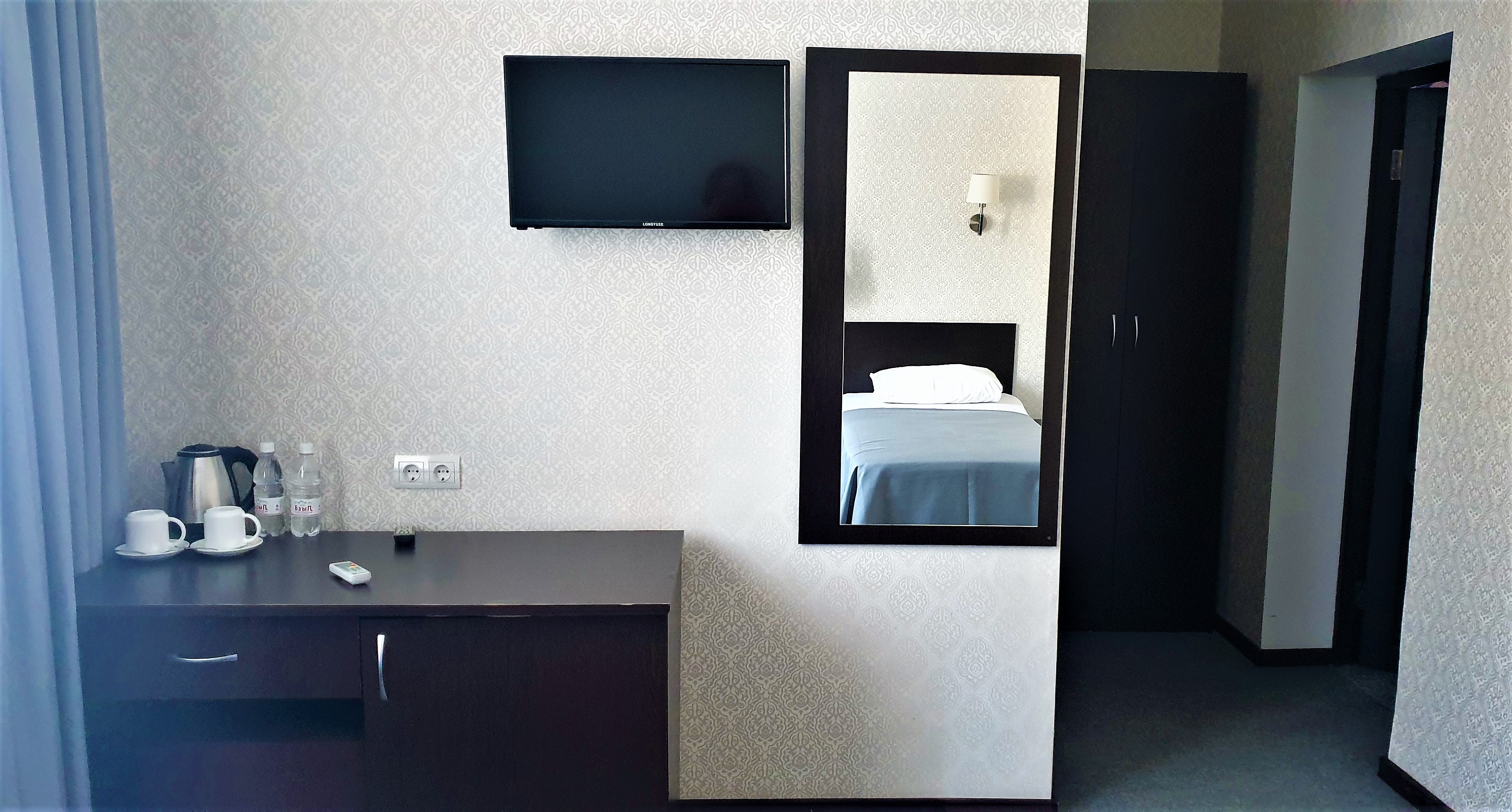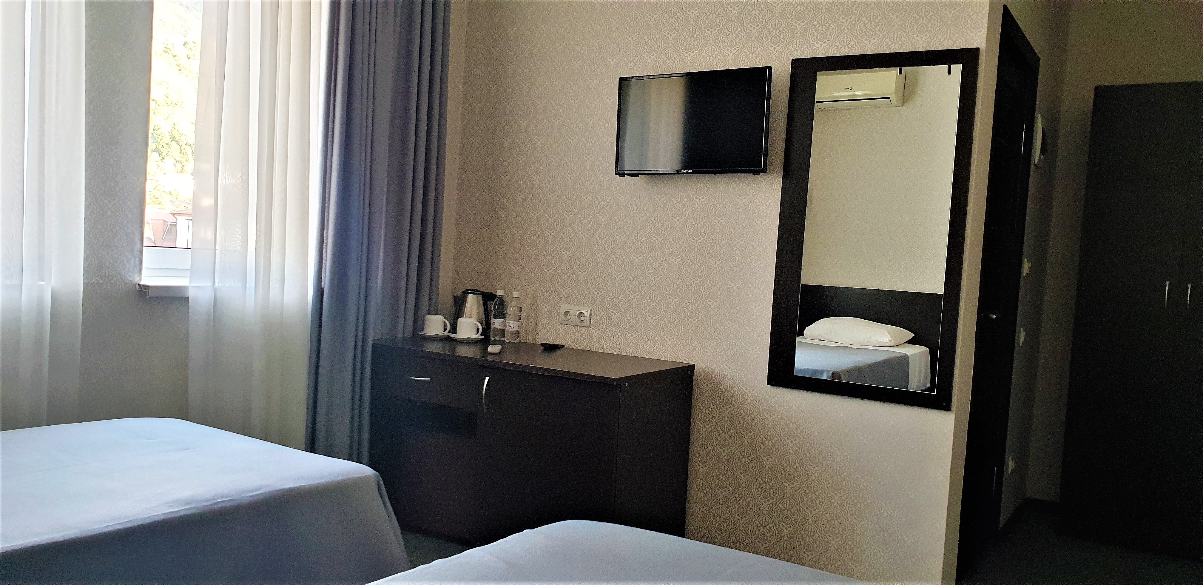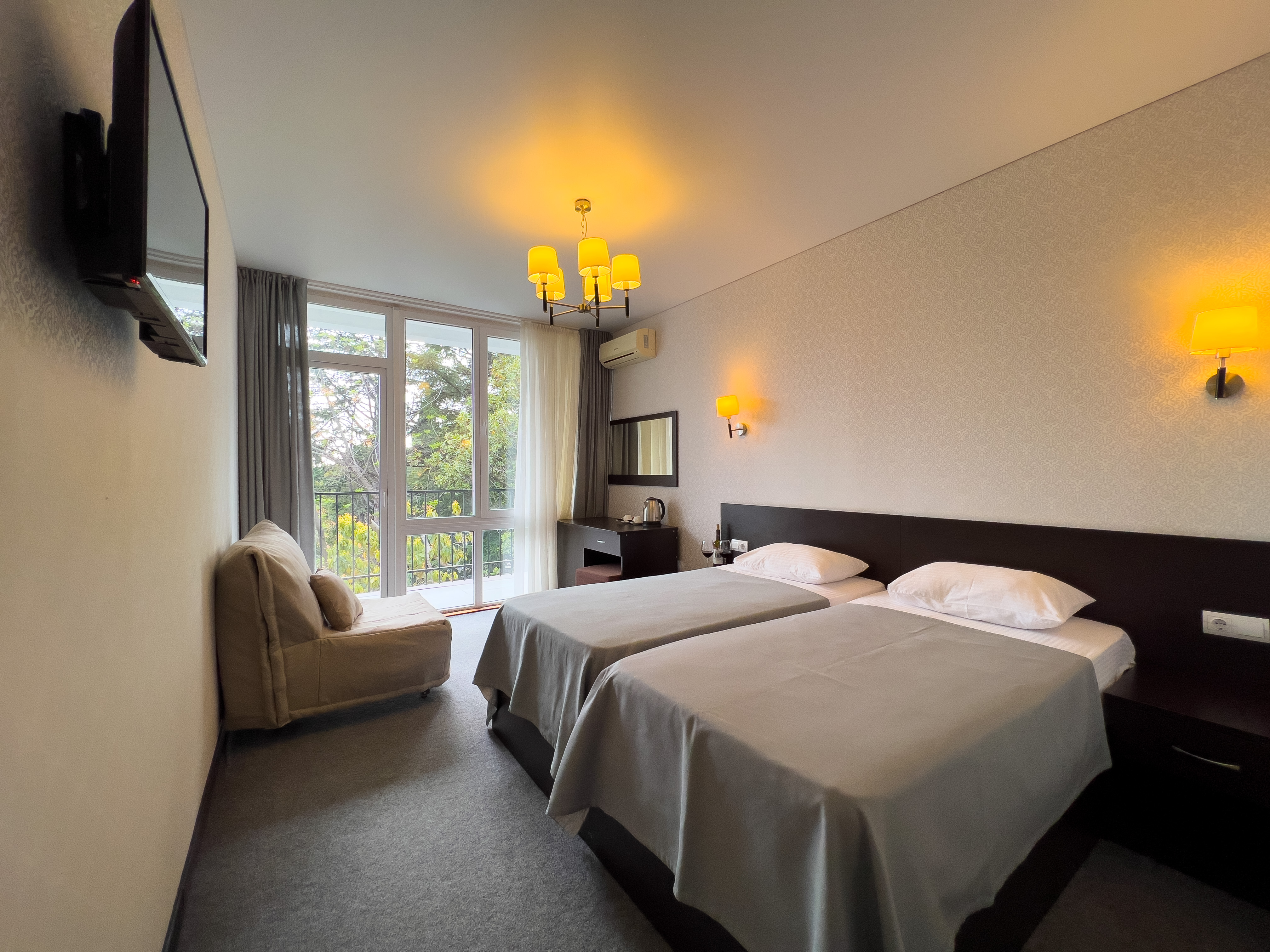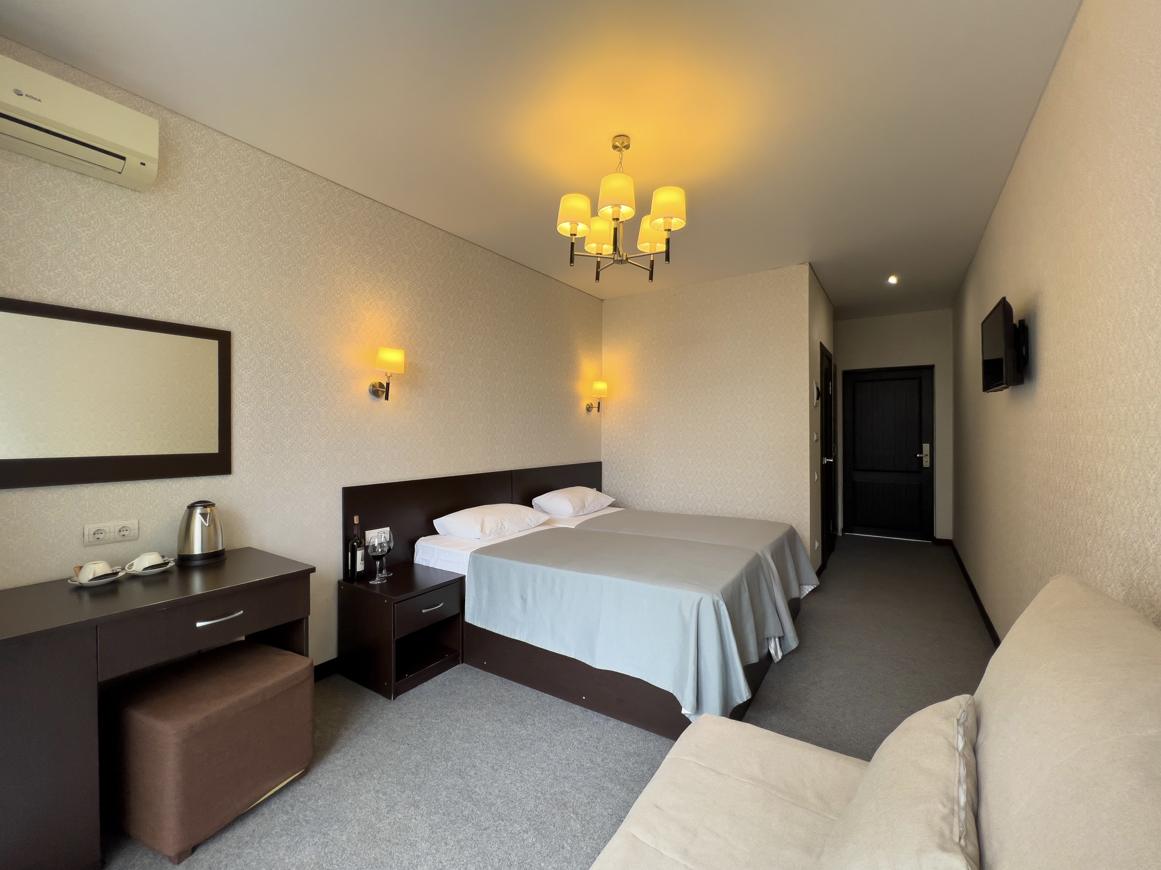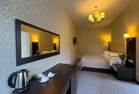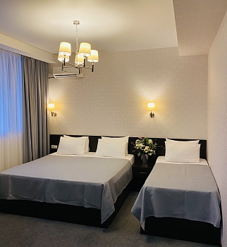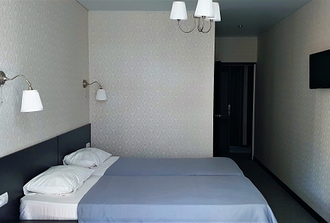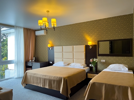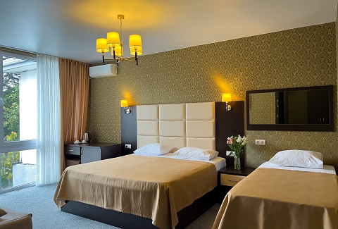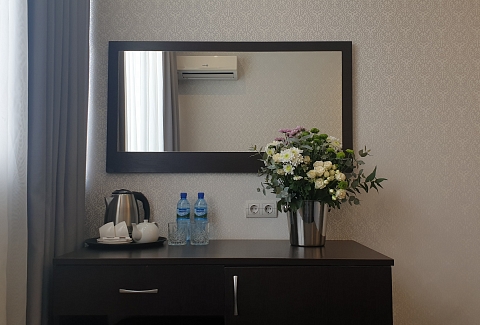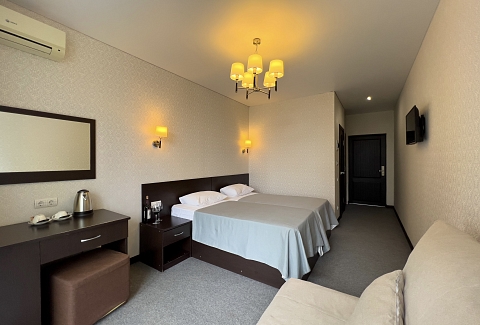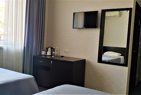 В номере: вешалка, зеркало, кровать двуспальная, кровать односпальная, прикроватные тумбочки, стол, стул, шкаф, кондиционер, сейф, телевизор, холодильник, чайный набор посуды, электрочайник