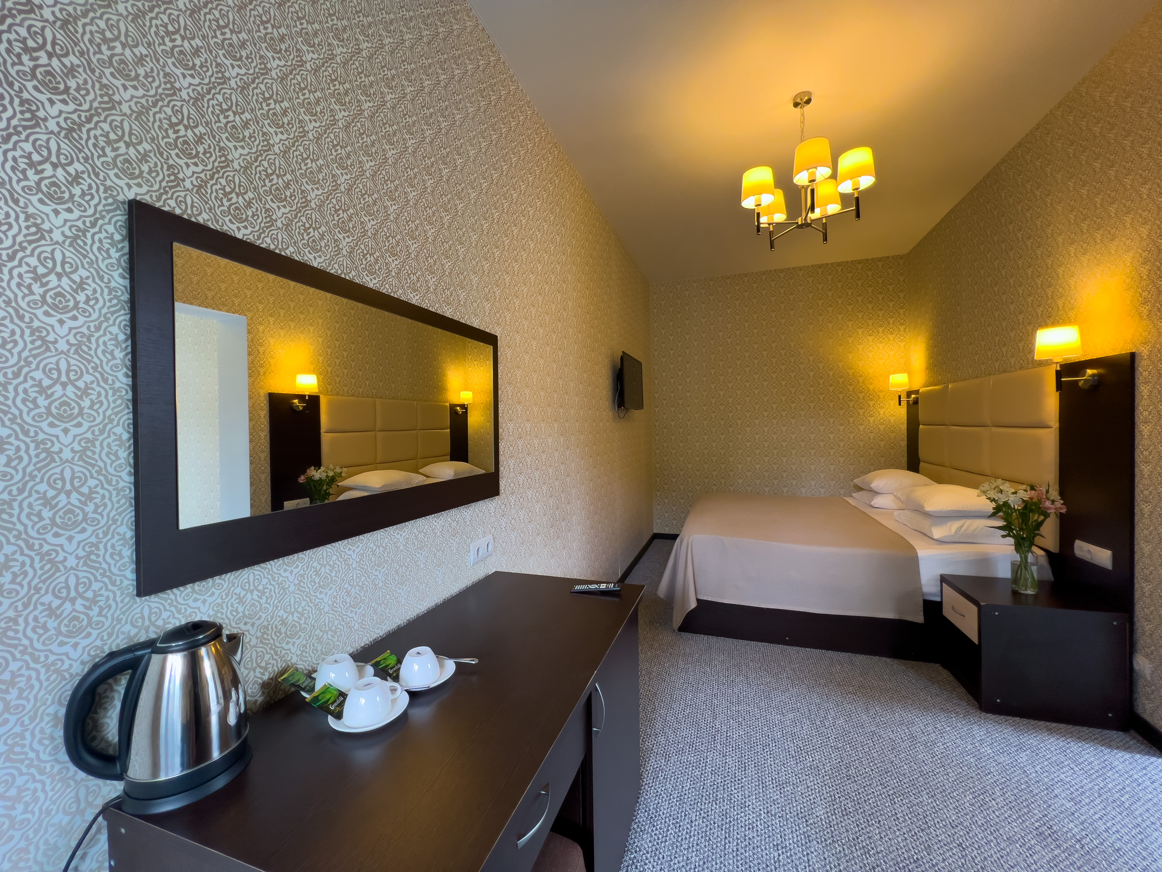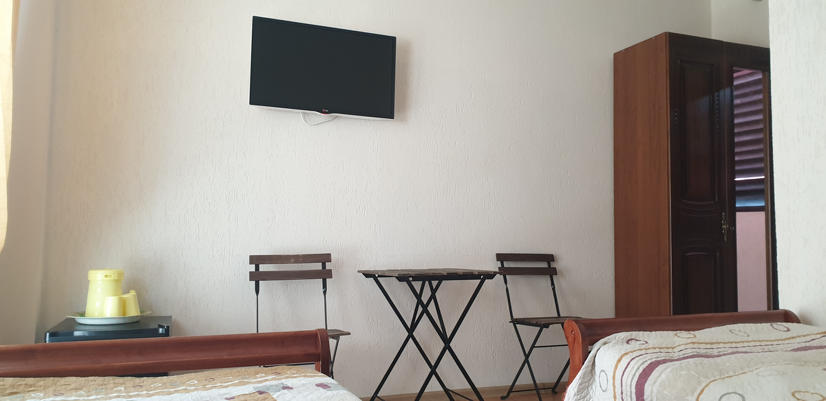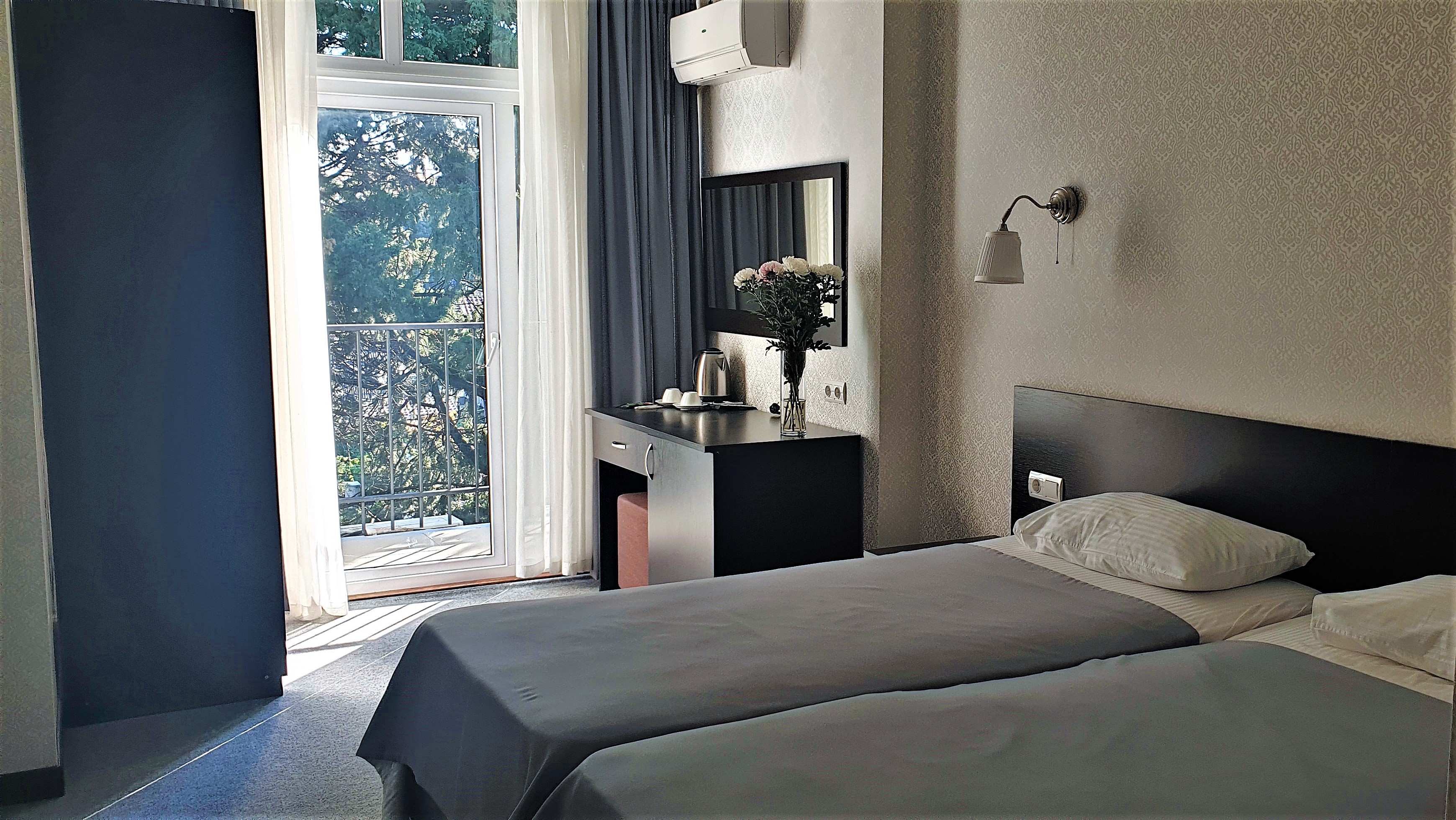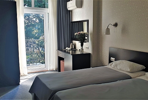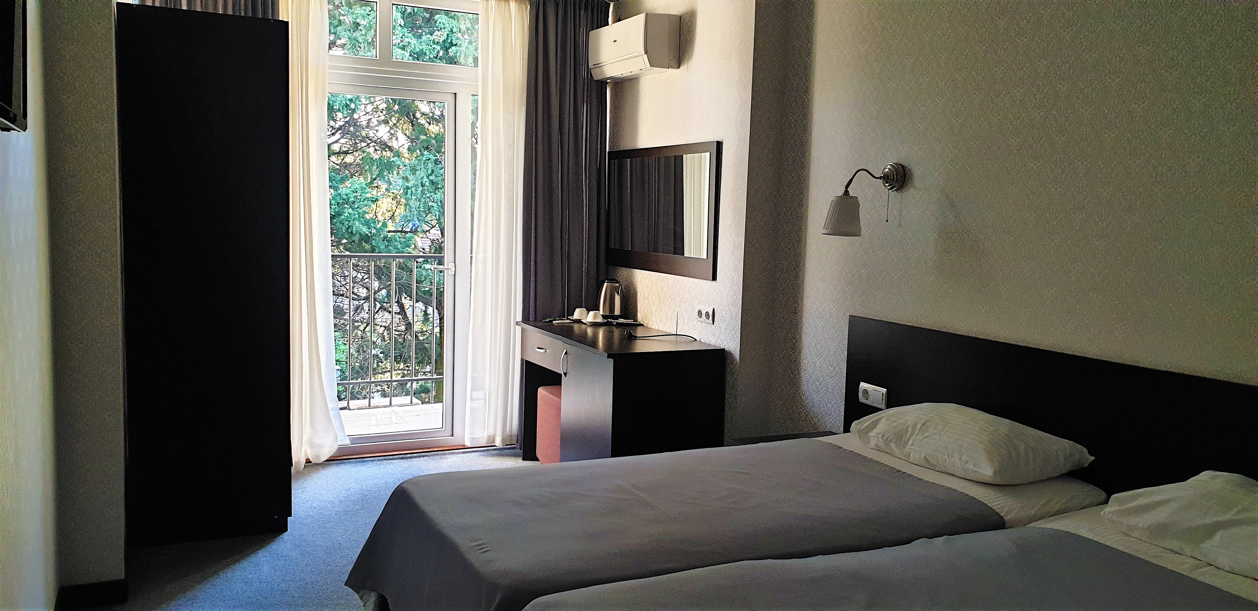 В номере: вешалка, зеркало, кровать двуспальная, кровать односпальная, прикроватные тумбочки, стол, стул, шкаф, кондиционер, сейф, телевизор, холодильник, чайный набор посуды, электрочайник