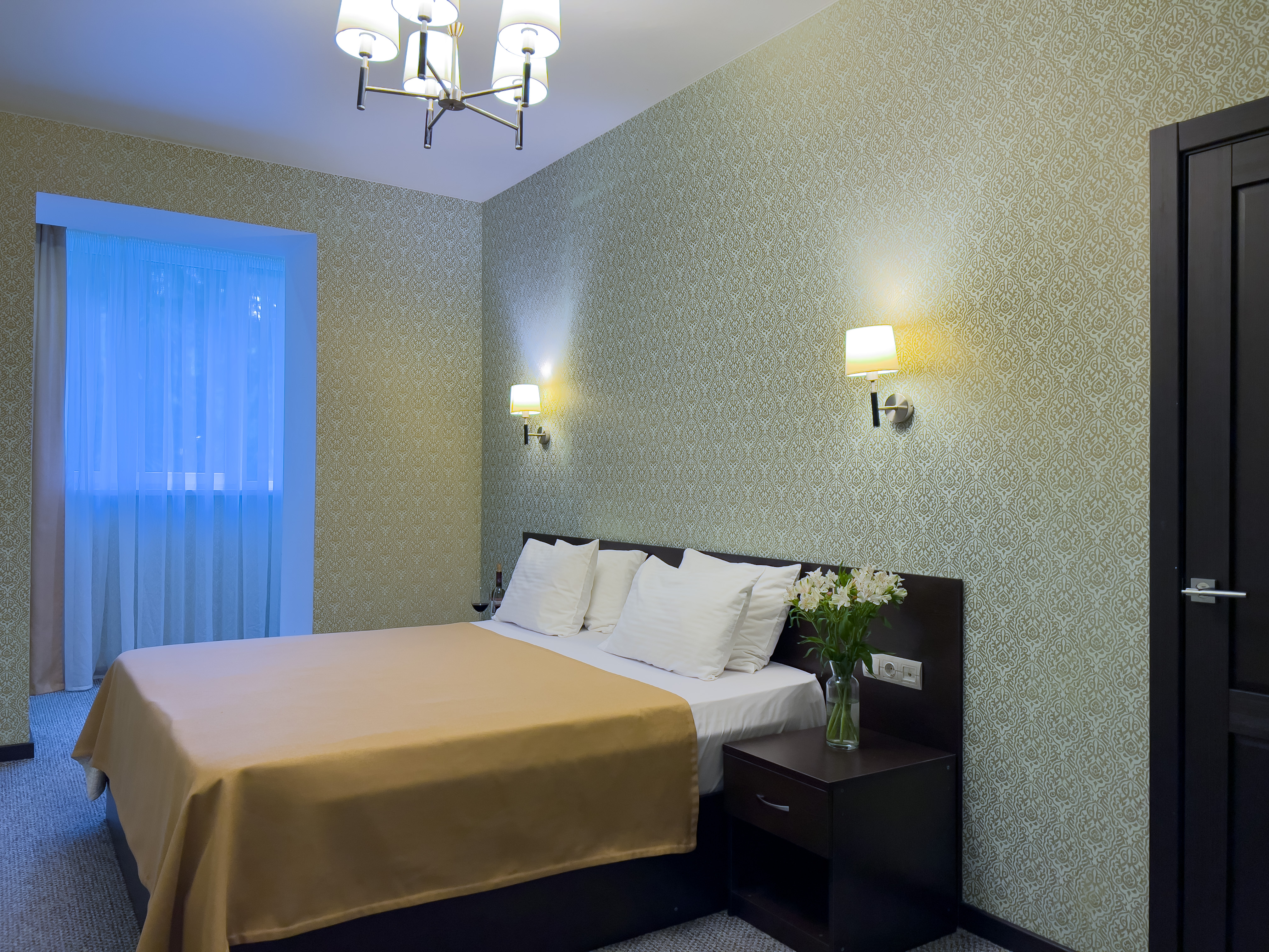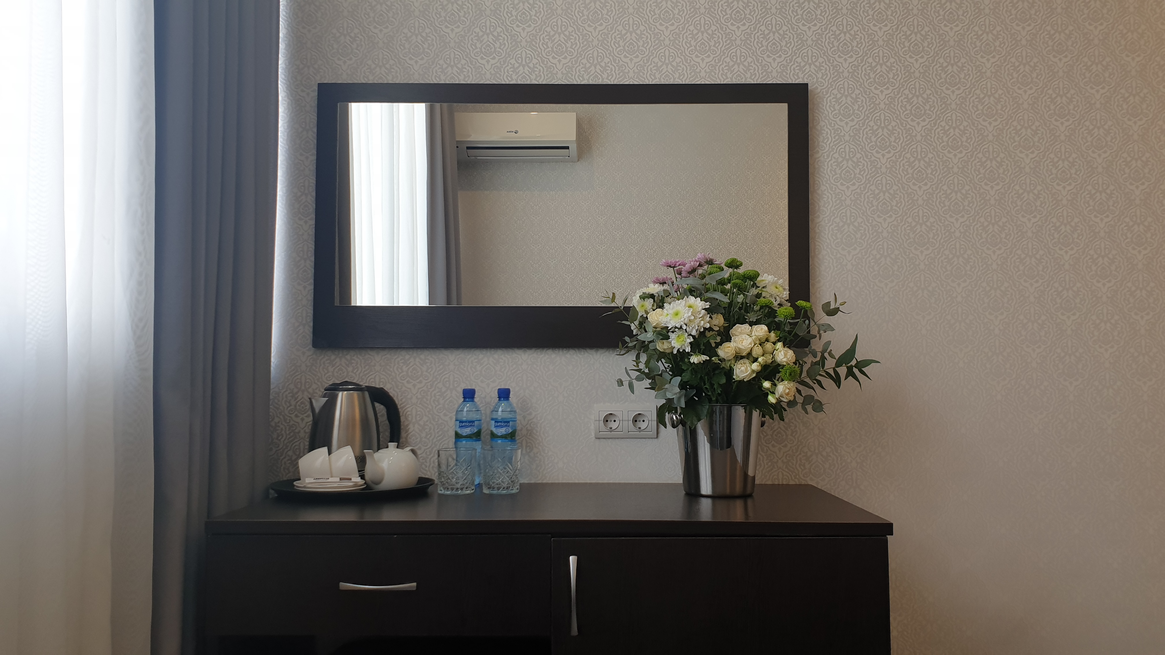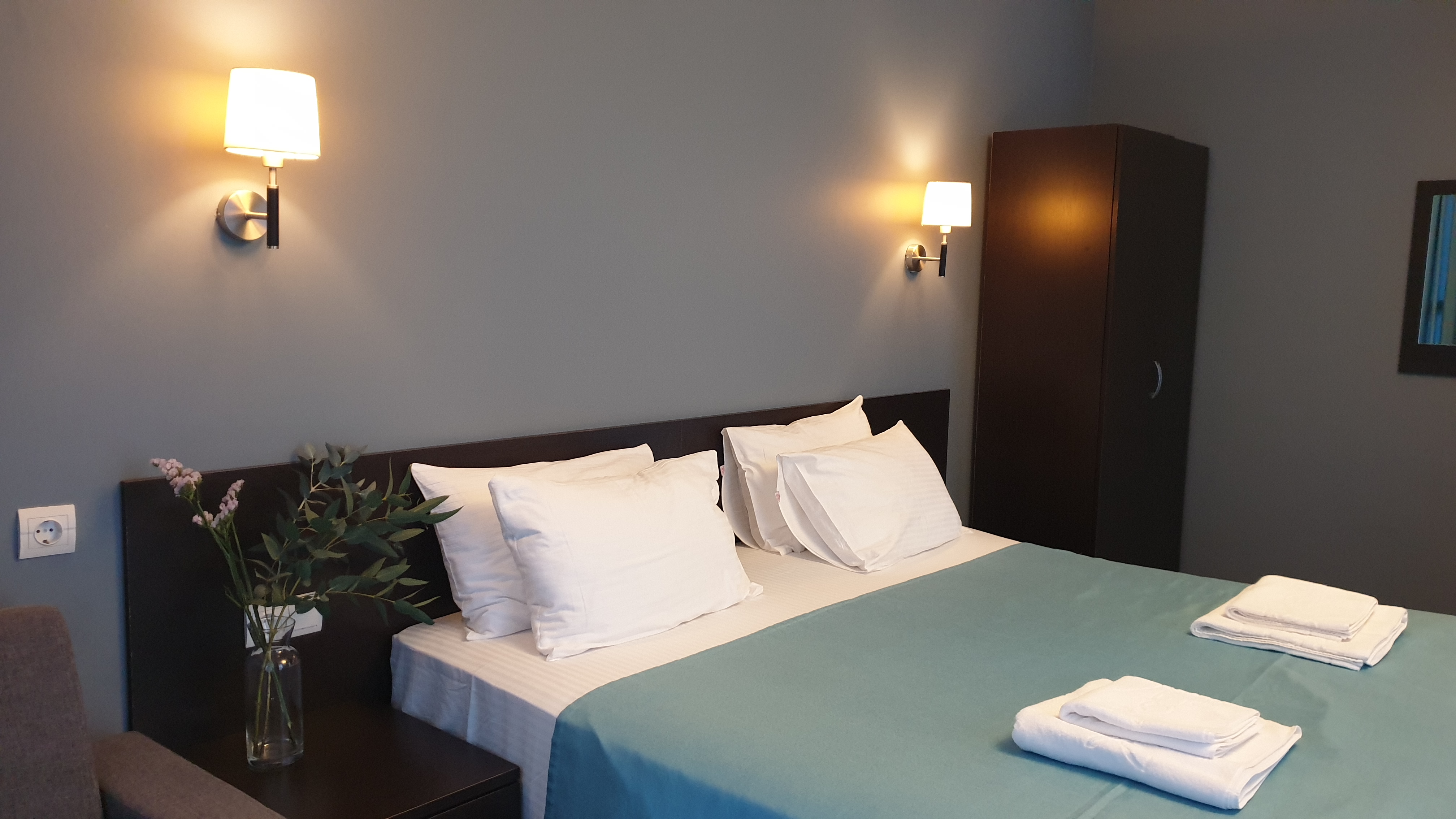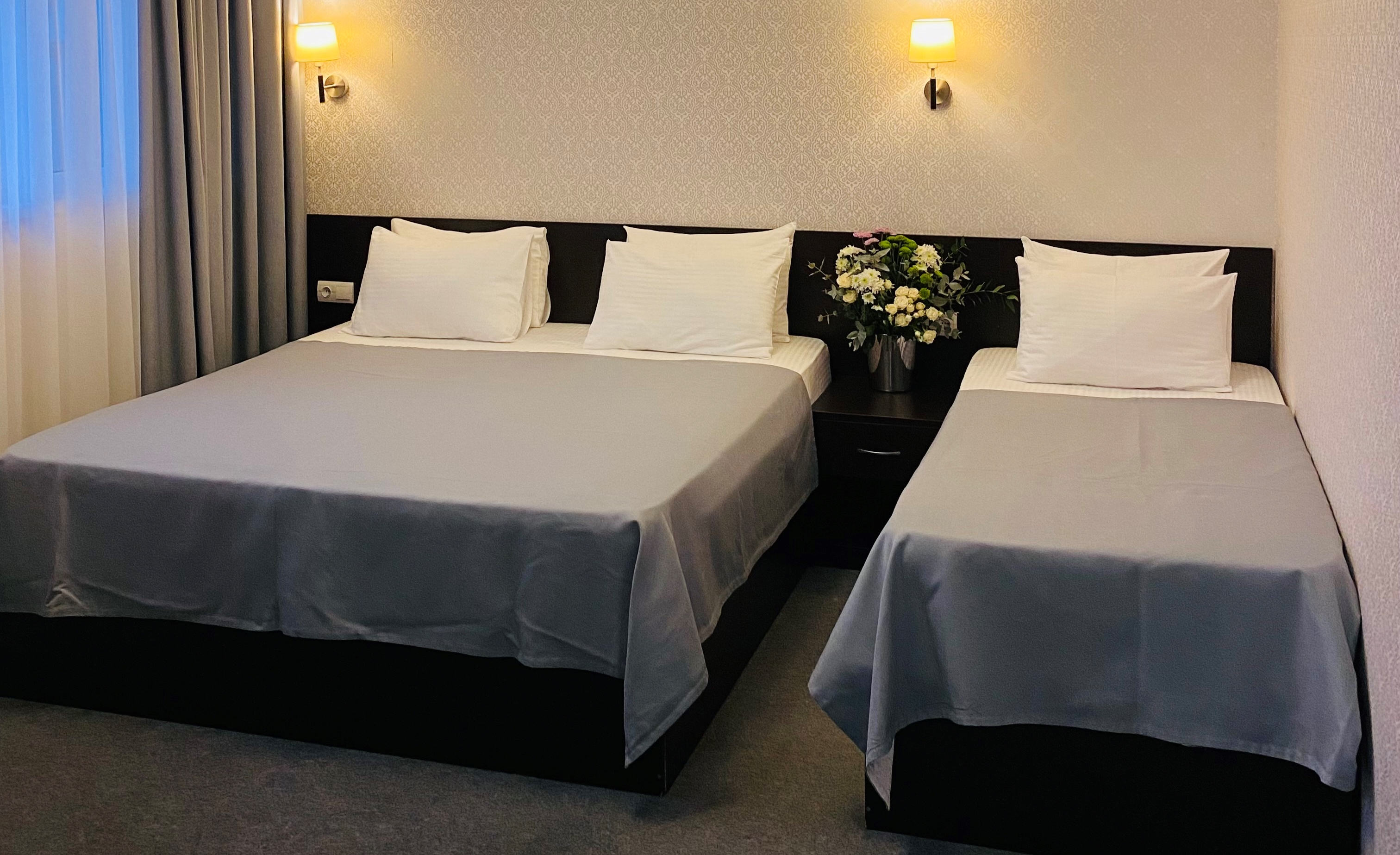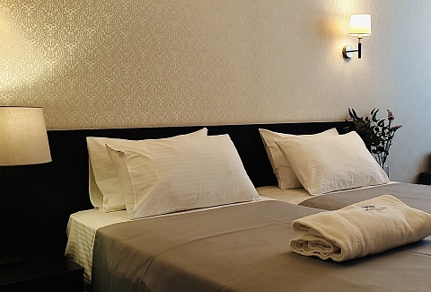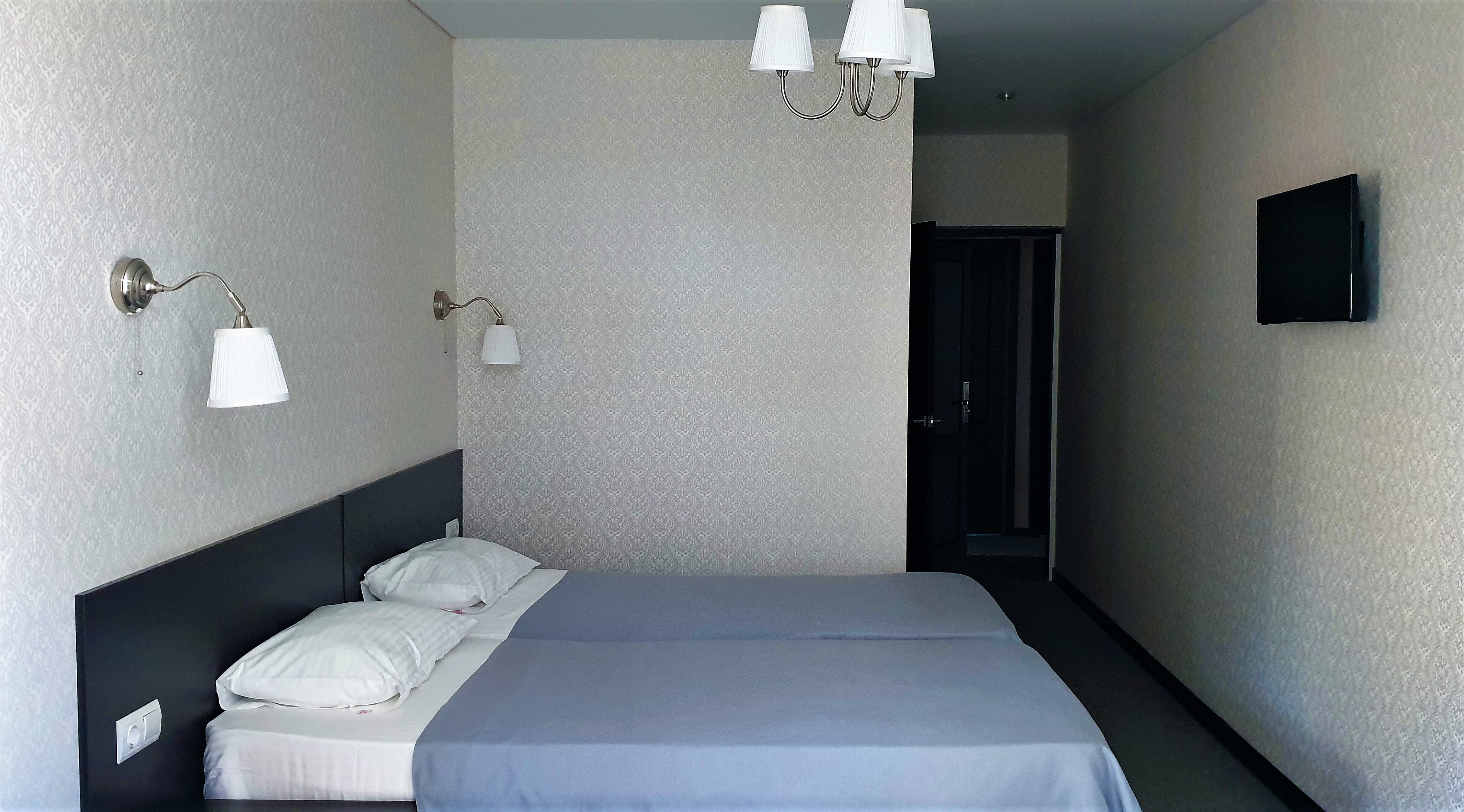 В номере: вешалка, зеркало, кровать двуспальная, кровать односпальная, прикроватные тумбочки, стол, стул, шкаф, кондиционер, сейф, телевизор, холодильник, чайный набор посуды, электрочайник