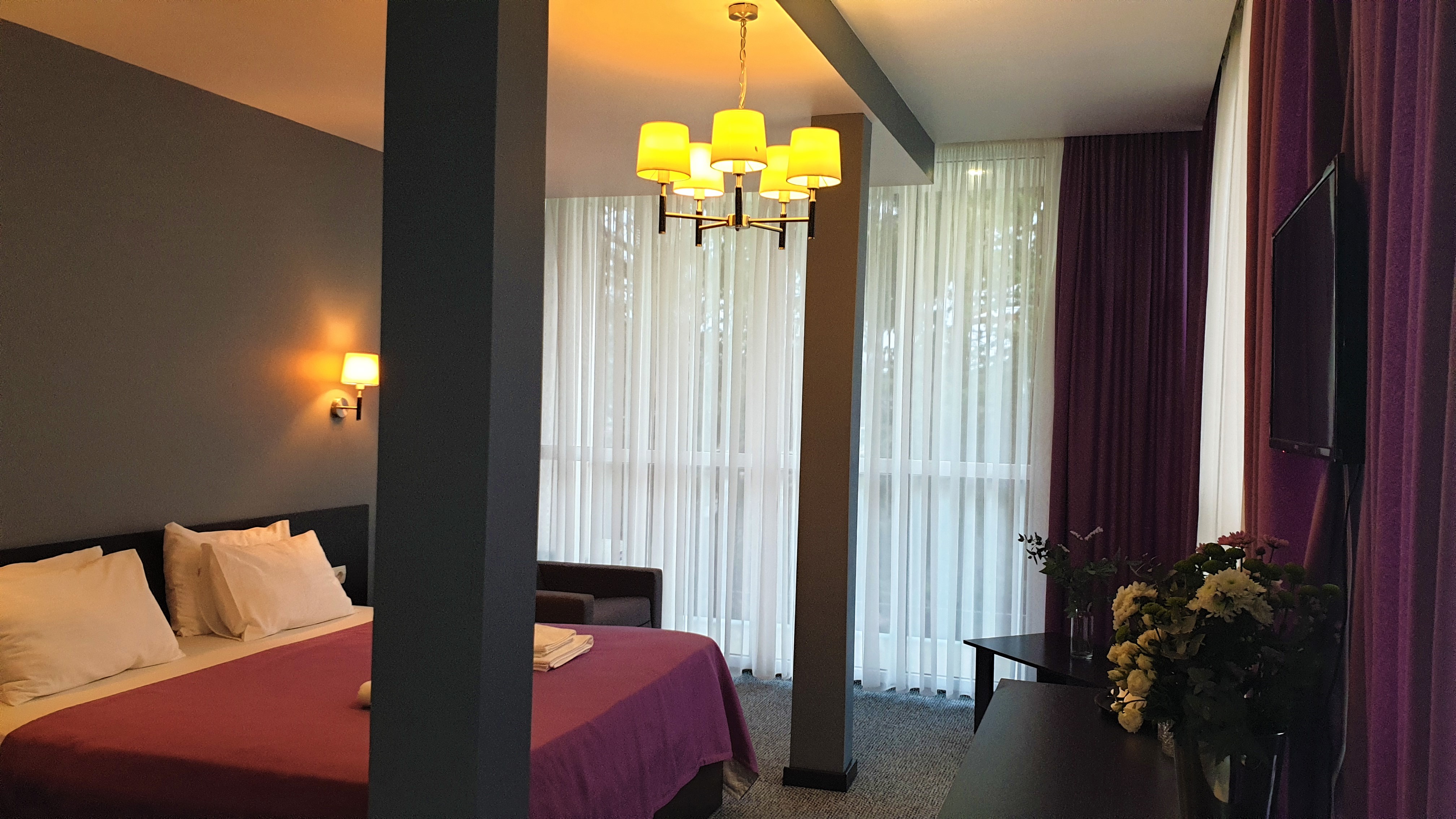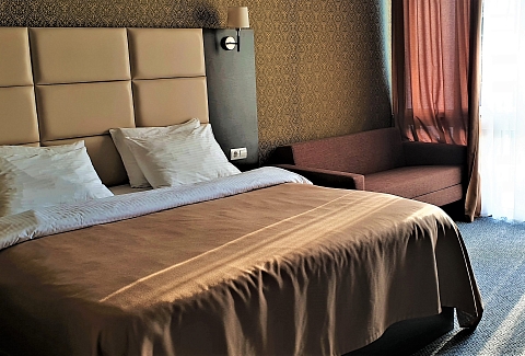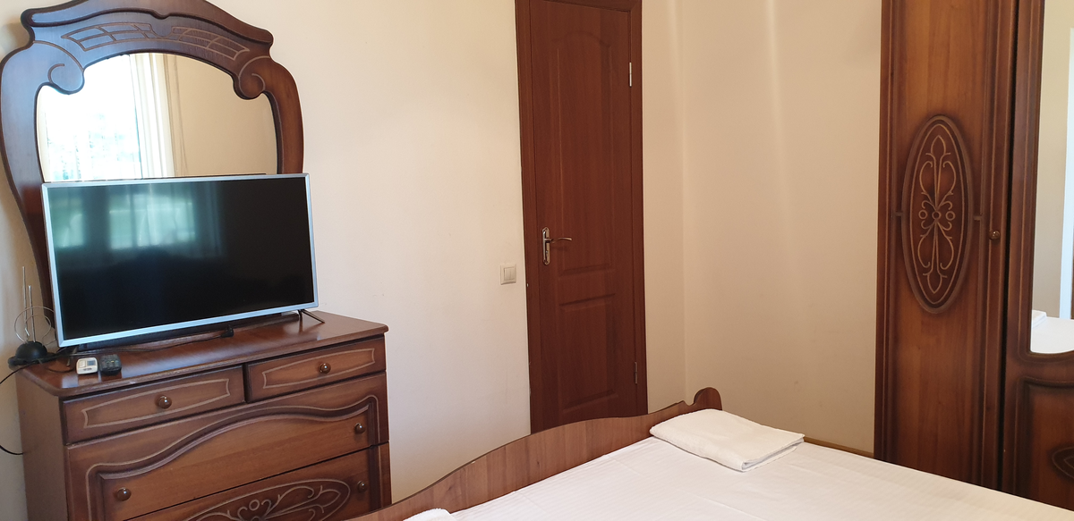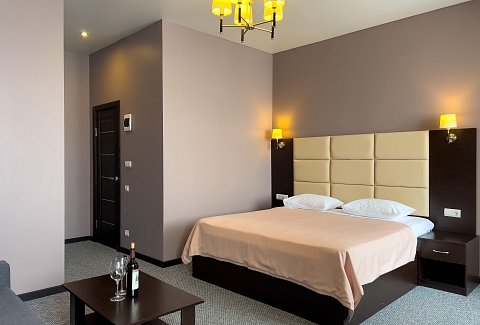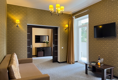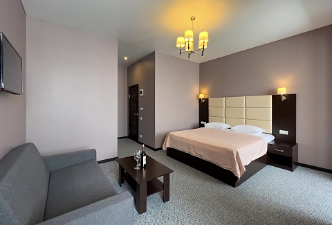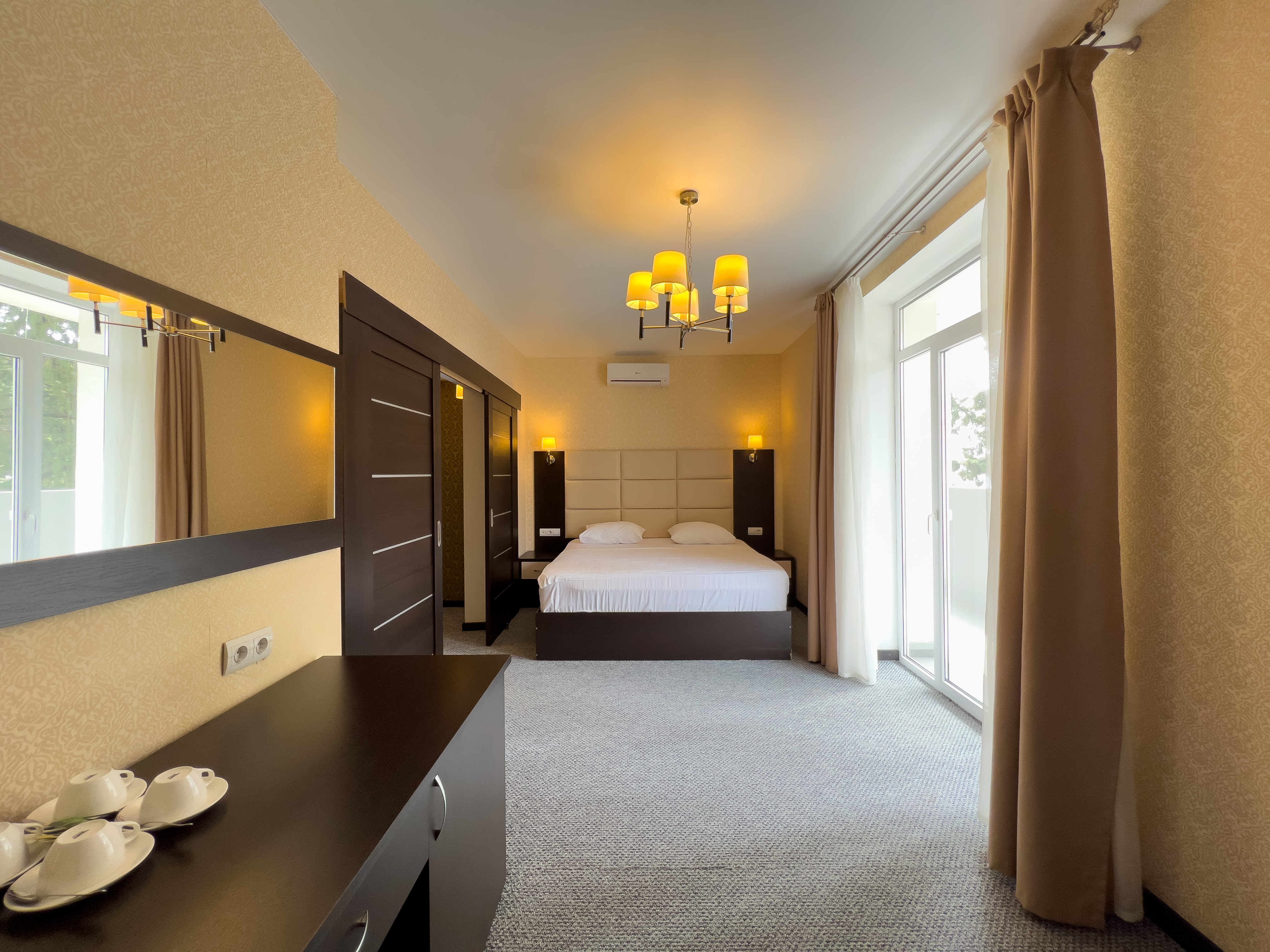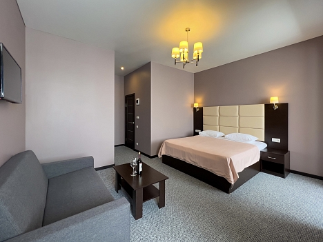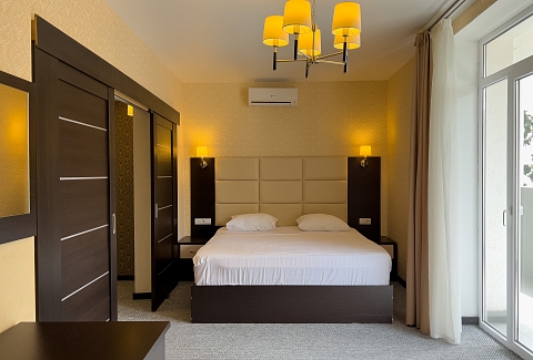 В номере: вешалка, диван раскладной, зеркало, кровать двуспальная, прикроватные тумбочки, стол, стулья, шкаф, кондиционер, сейф, телевизор, холодильник, чайный набор посуды, электрочайник