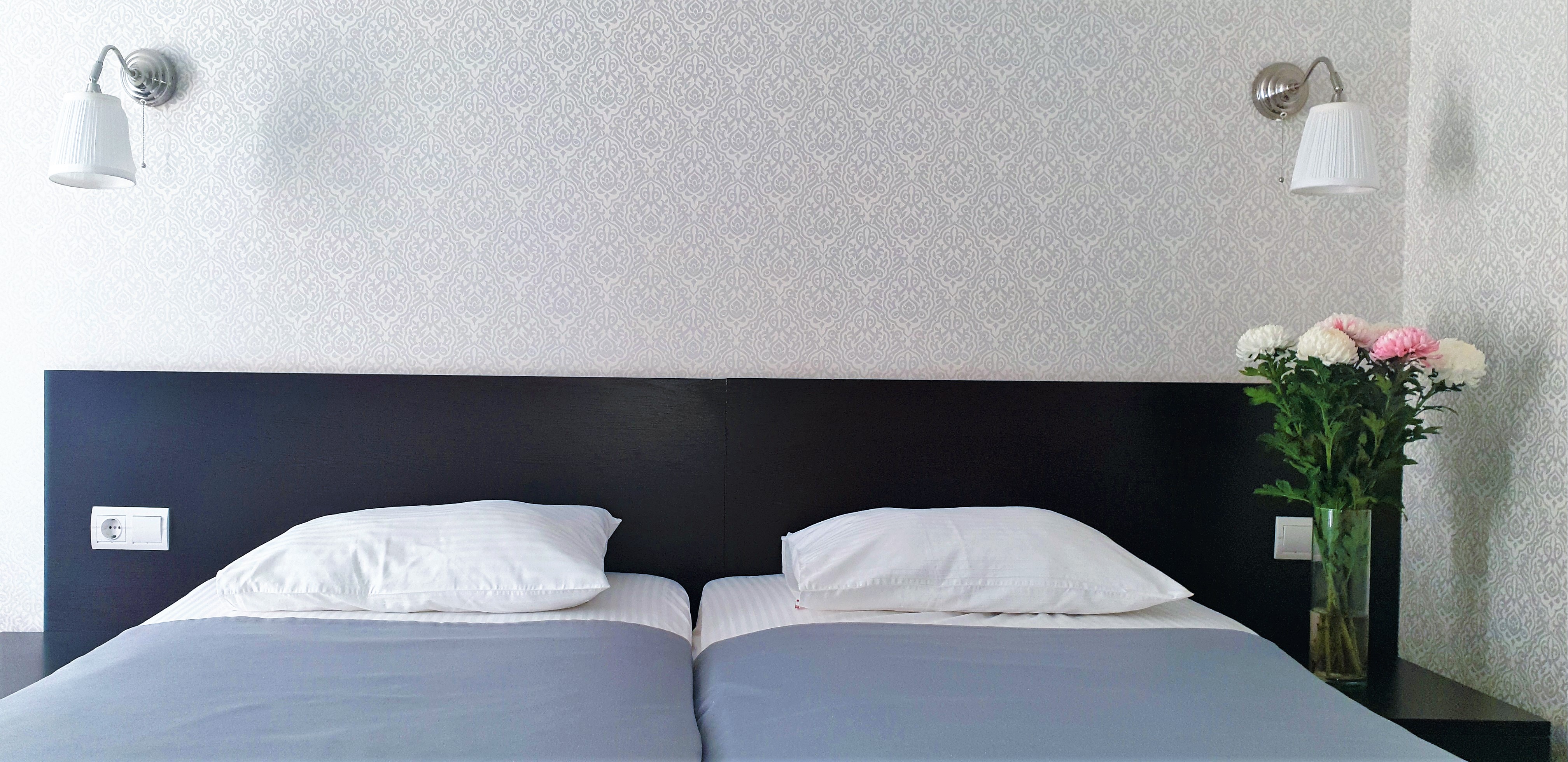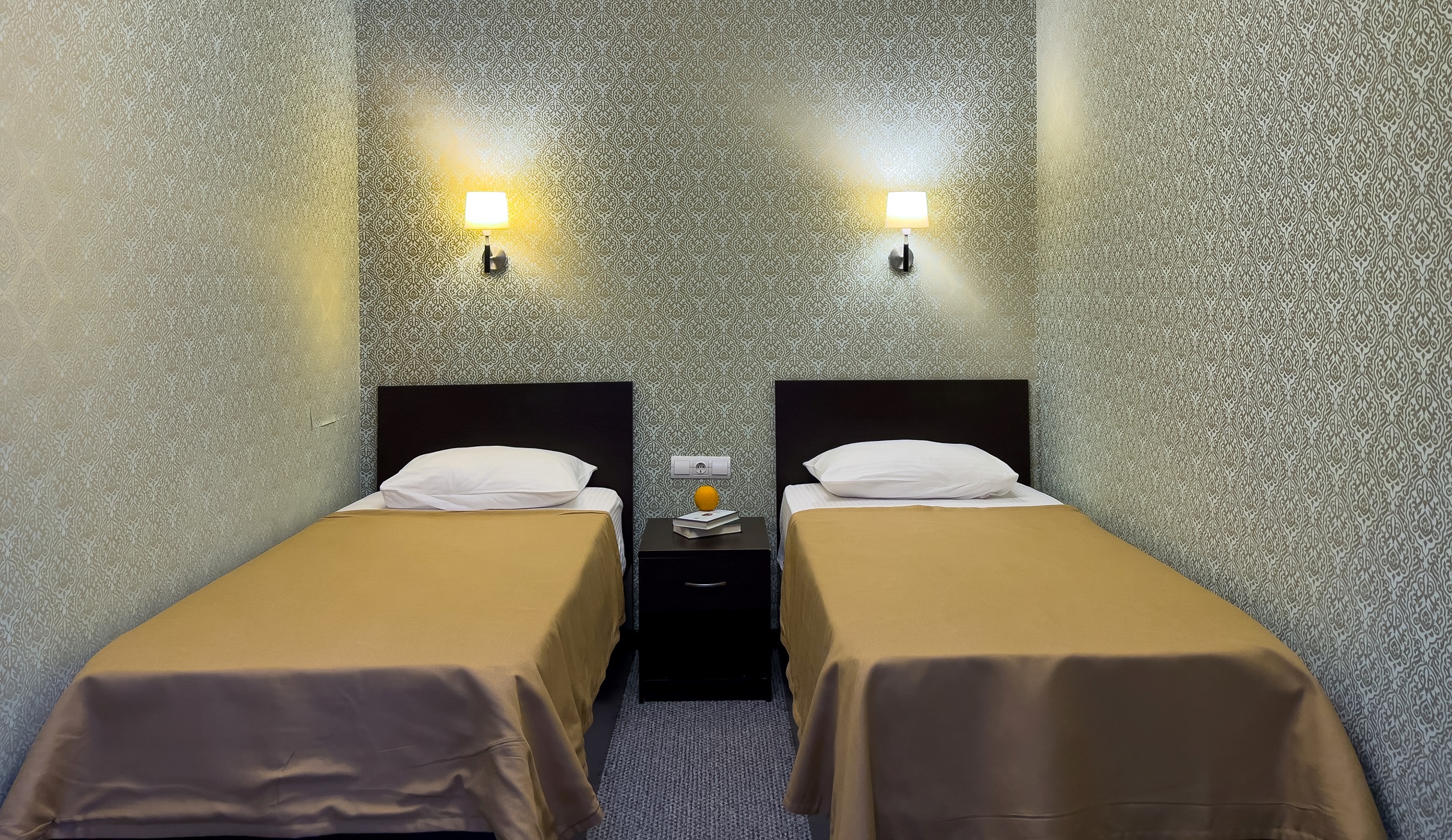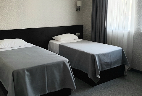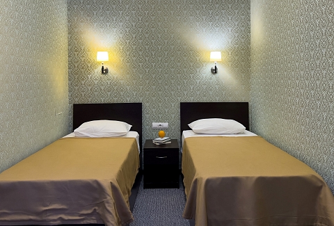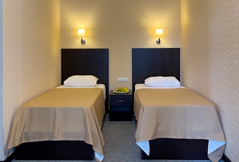 В номере: вешалка, зеркало, кровати односпальные, прикроватные тумбочки, стол, стул, шкаф, кондиционер, телевизор, холодильник