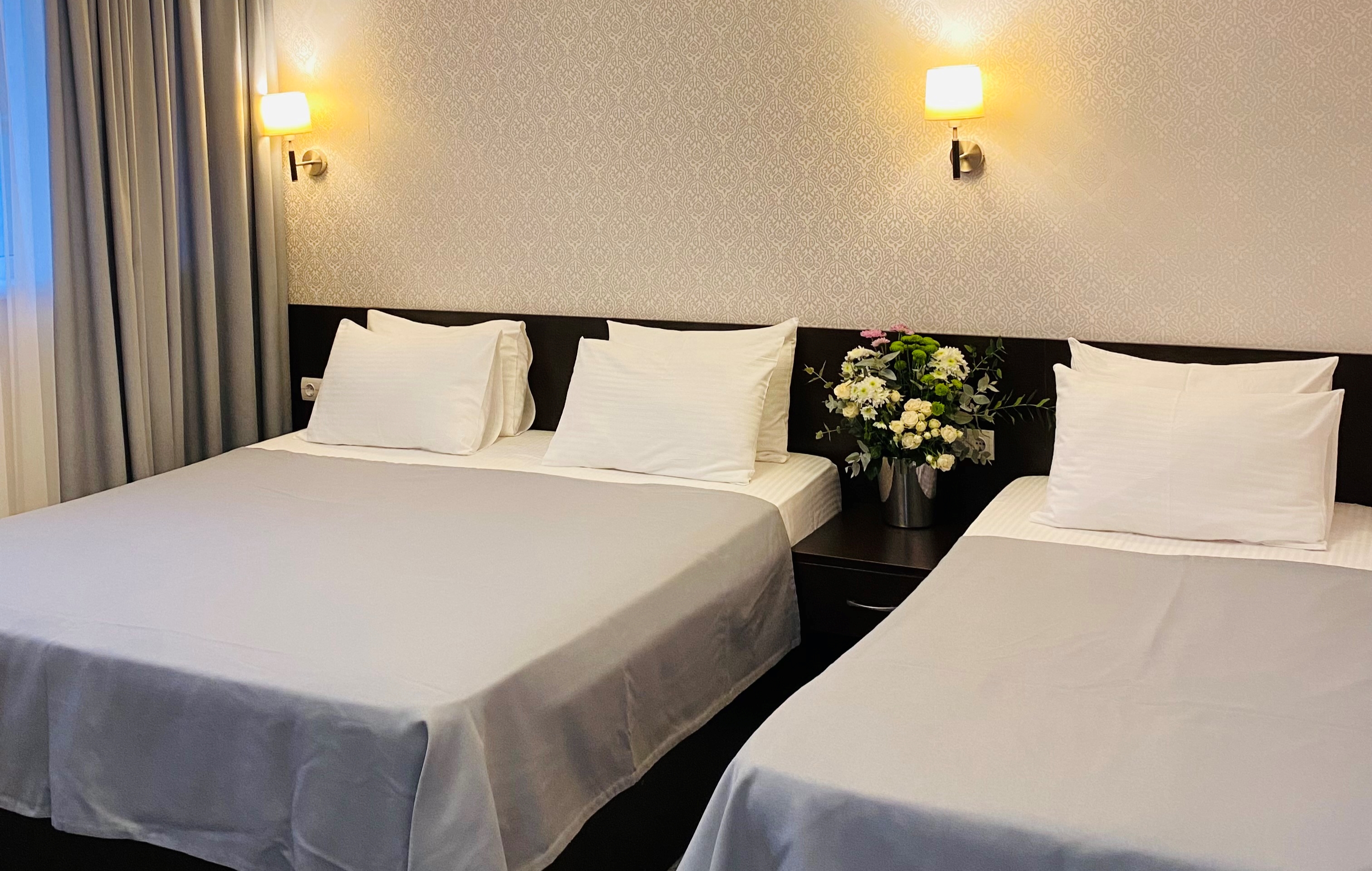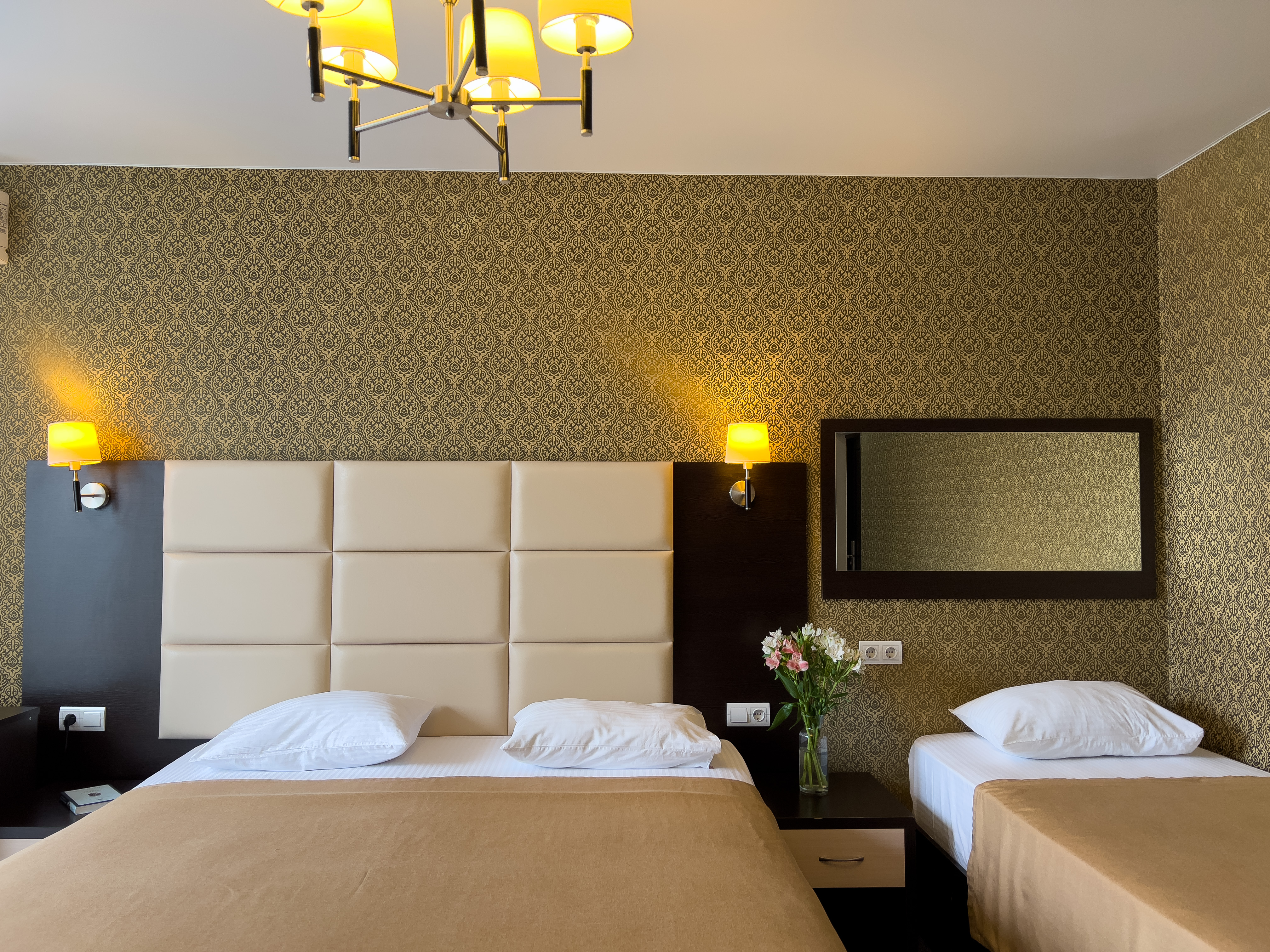 В номере: вешалка, зеркало, кровати односпальные, кровать двуспальная, прикроватные тумбочки, стол, стул, шкаф, кондиционер, телевизор, холодильник