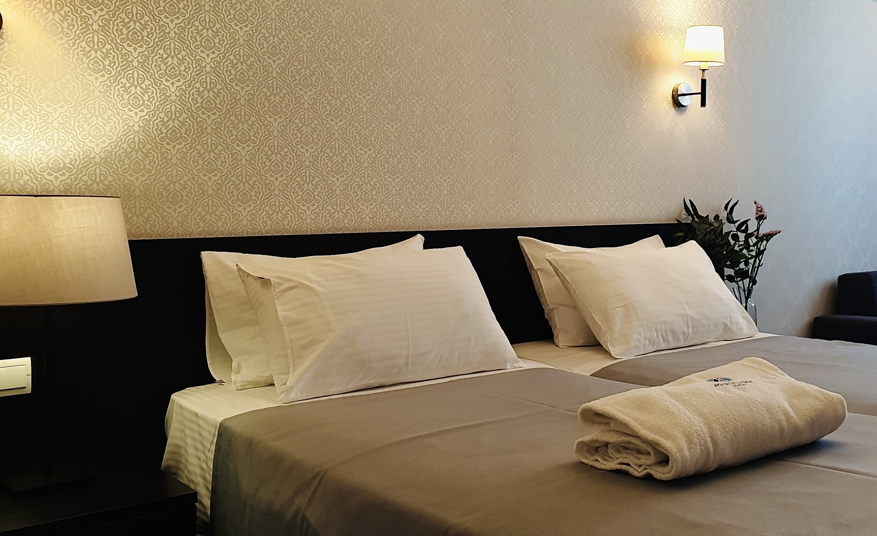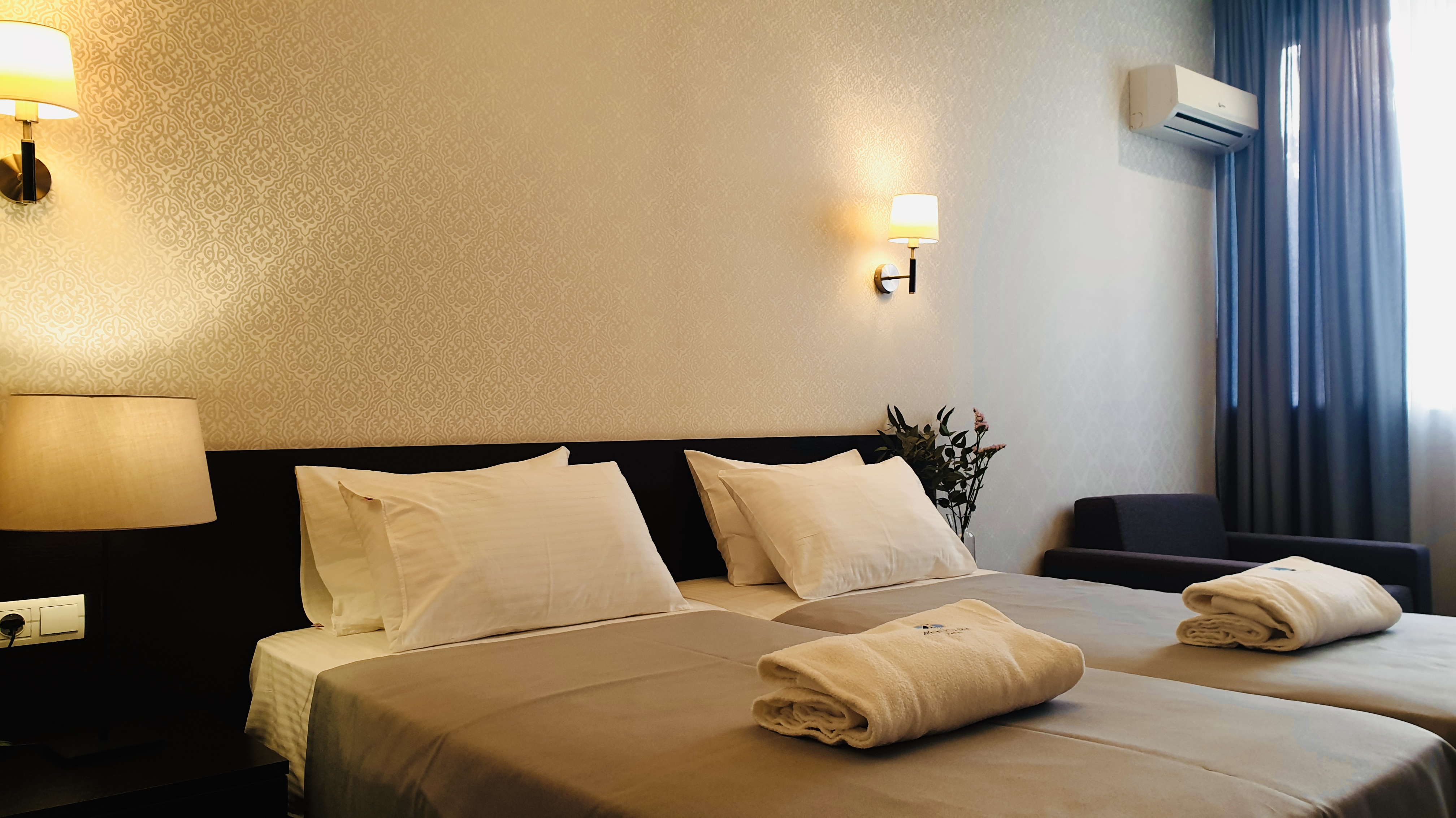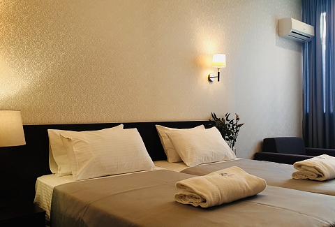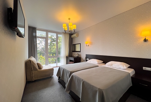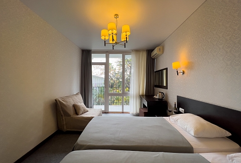 В номере: вешалка, зеркало, кресло-кровать, кровати односпальные /одна двуспальная кровать, прикроватные тумбочки, стол, стул, шкаф, кондиционер, сейф, телевизор, холодильник, чайный набор посуды, электрочайник
