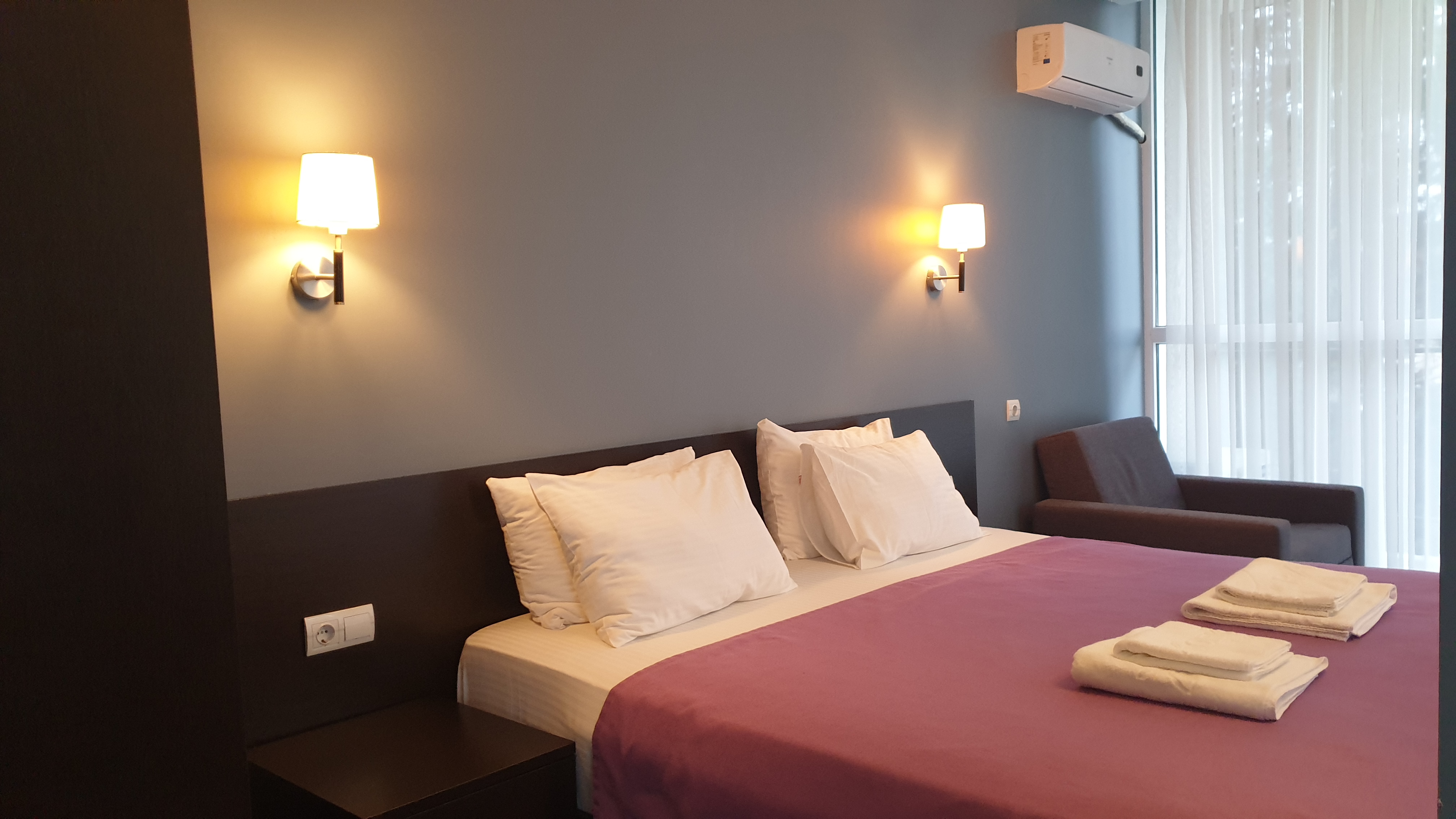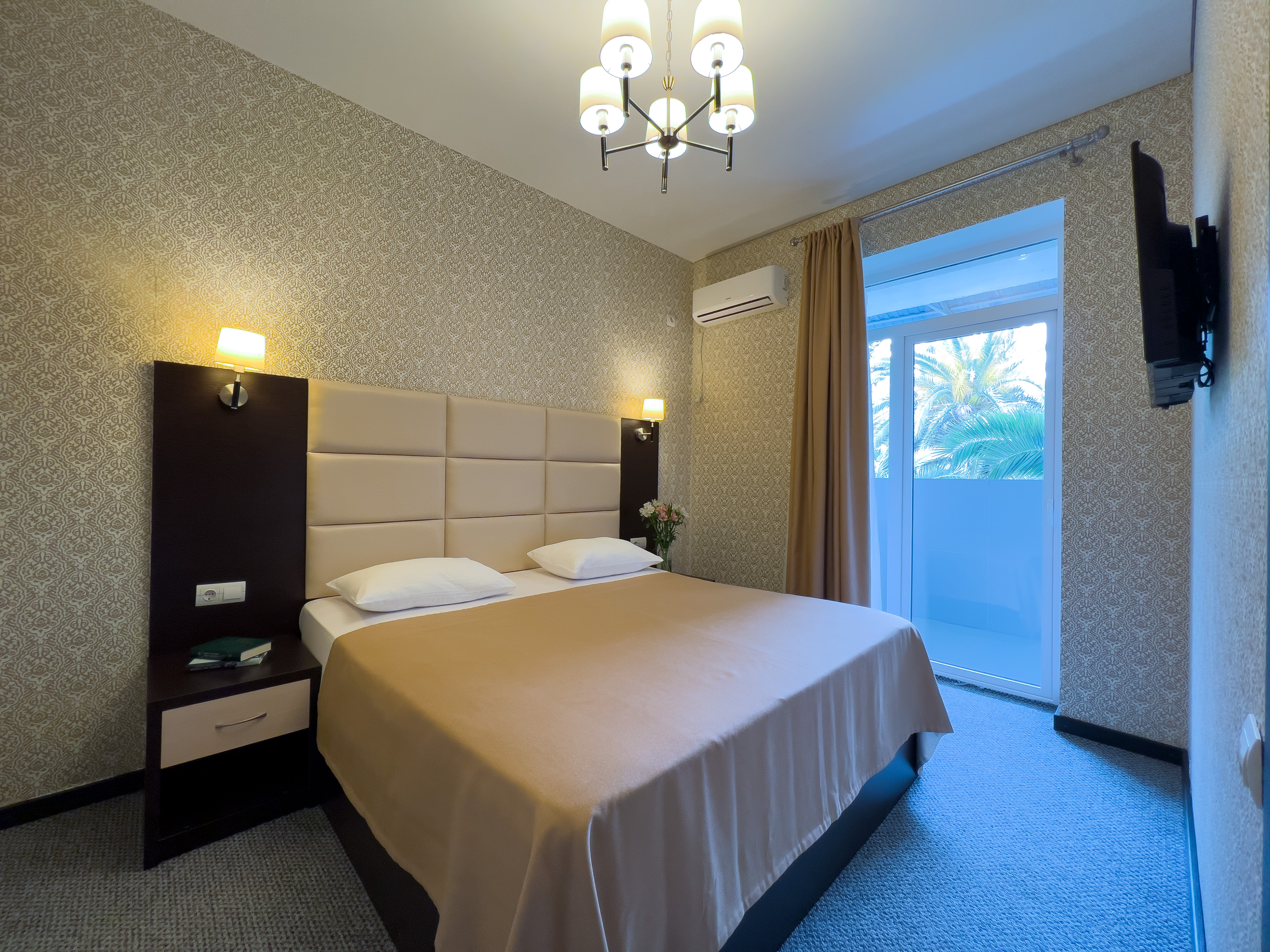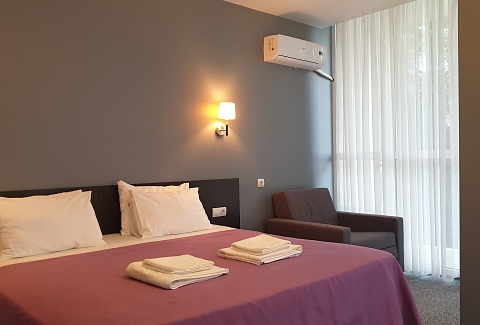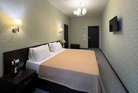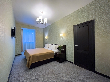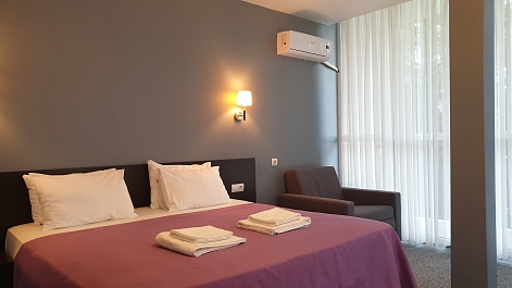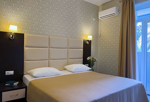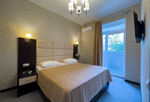 В номере: вешалка, зеркало, кресло-кровать, кровать двуспальная, прикроватные тумбочки, стол, стулья, шкаф, кондиционер, сейф, телевизор, холодильник, чайный набор посуды, электрочайник
