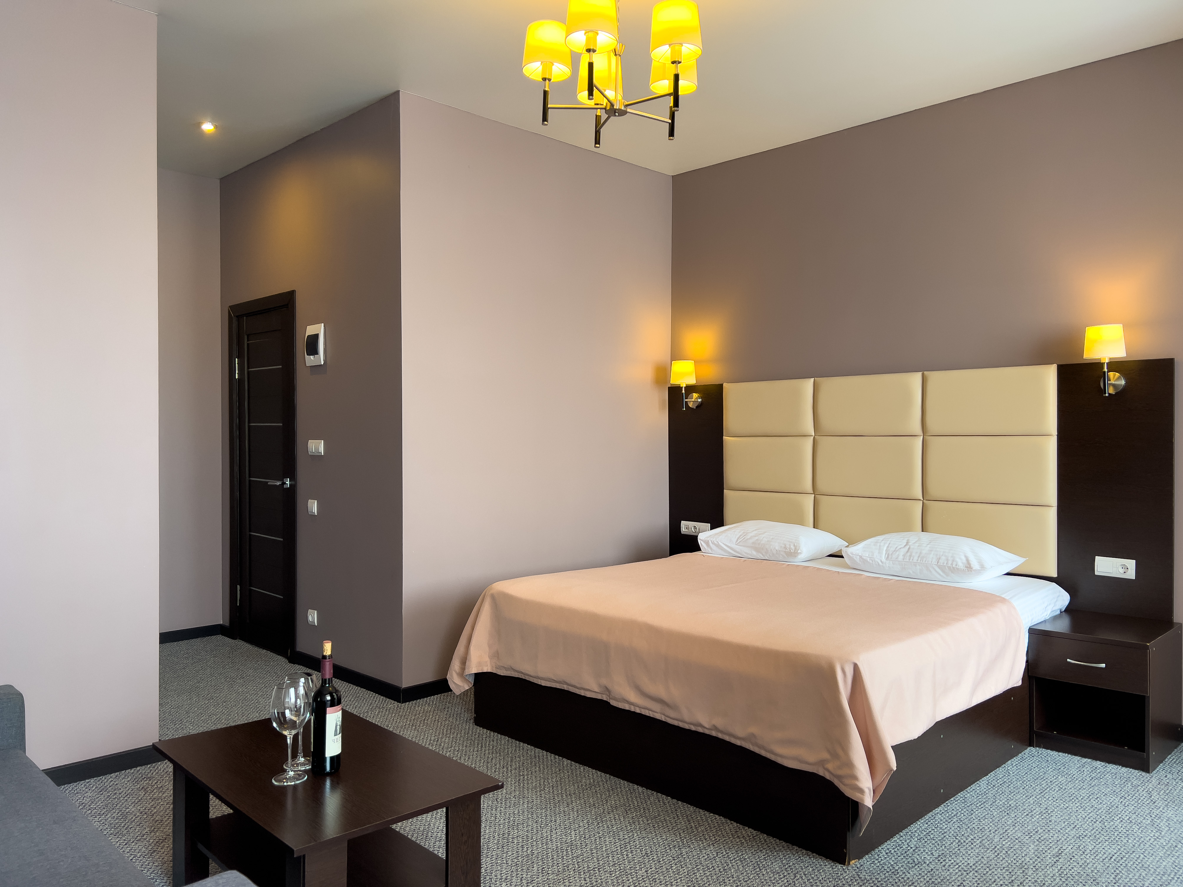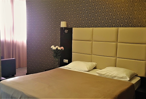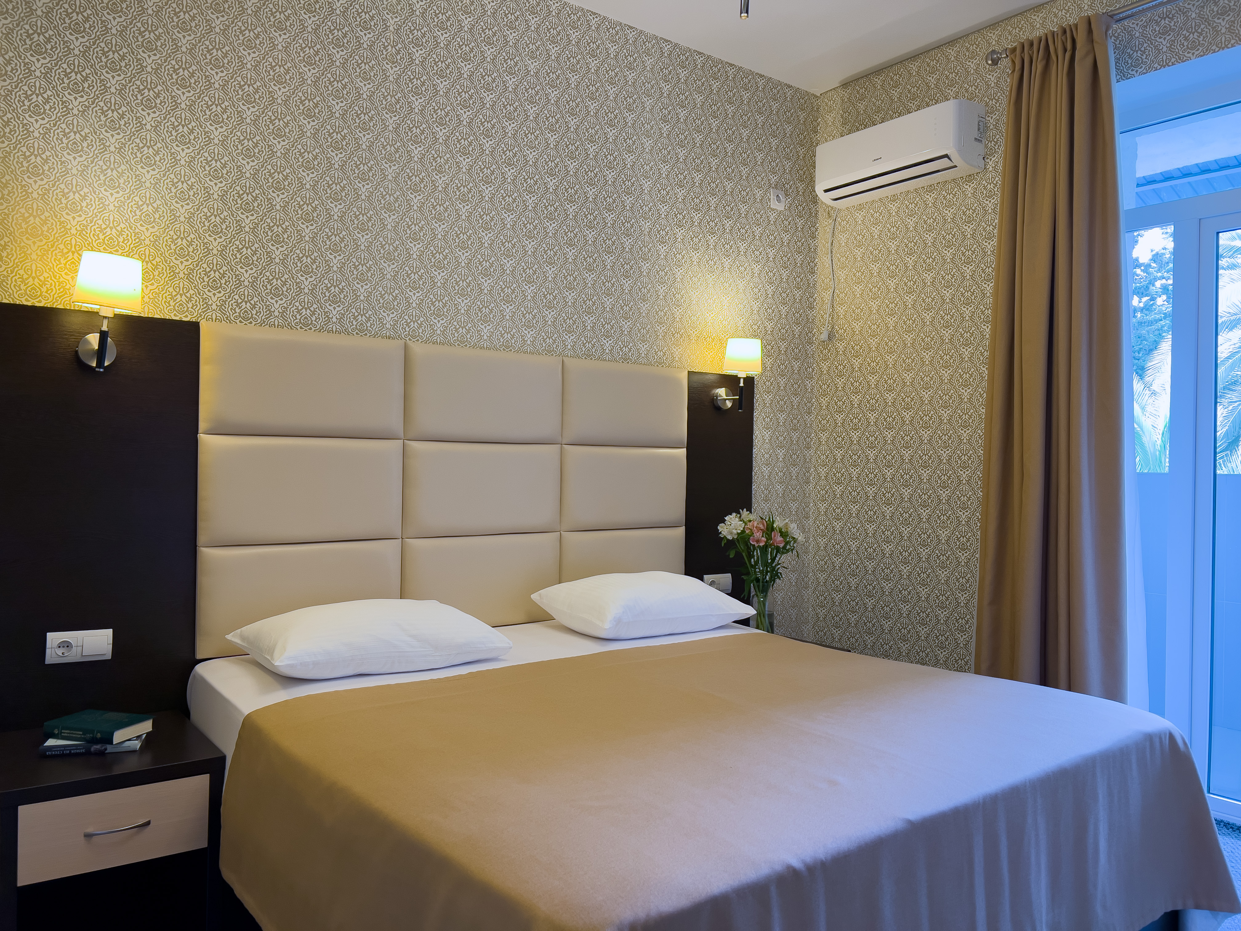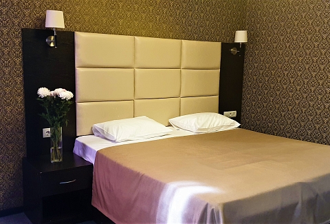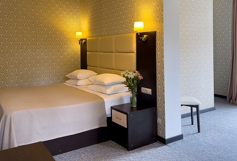 В номере: вешалка, зеркало, кресло-кровать, кровать двуспальная, прикроватные тумбочки, стол, стулья, шкаф, кондиционер, сейф, телевизор, холодильник, чайный набор посуды, электрочайник
