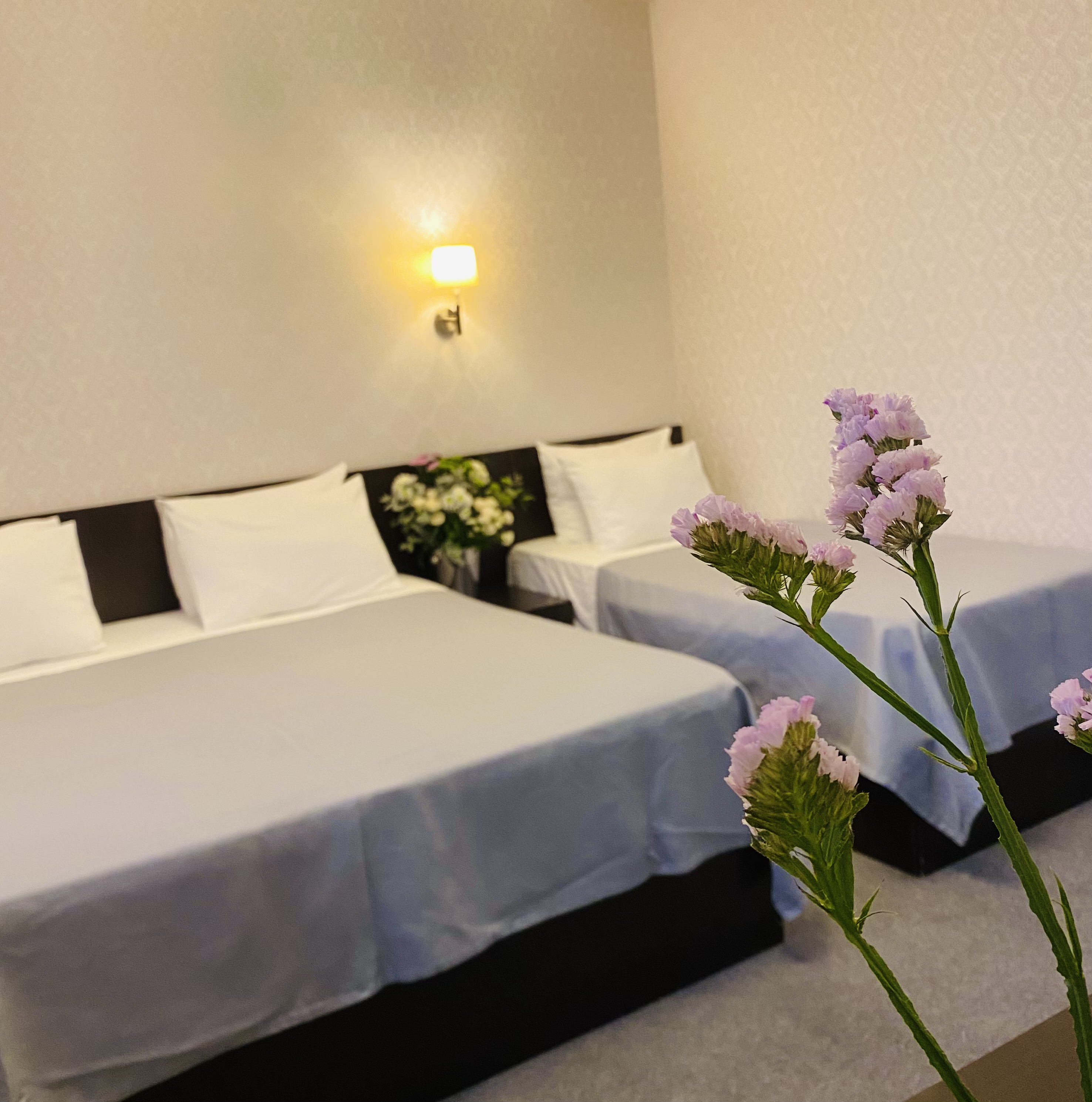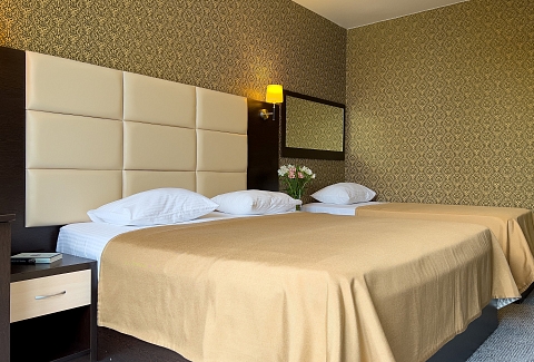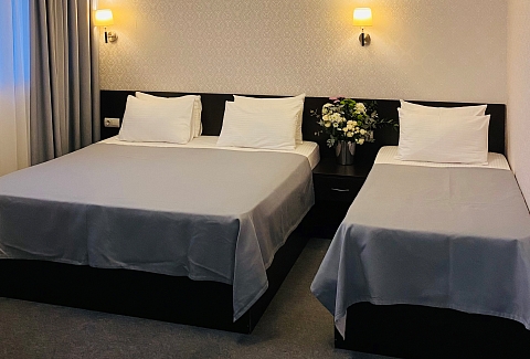 В номере: вешалка, зеркало, кровати односпальные, кровать двуспальная, прикроватные тумбочки, стол, стул, шкаф, кондиционер, сейф, телевизор, холодильник, чайный набор посуды, электрочайник