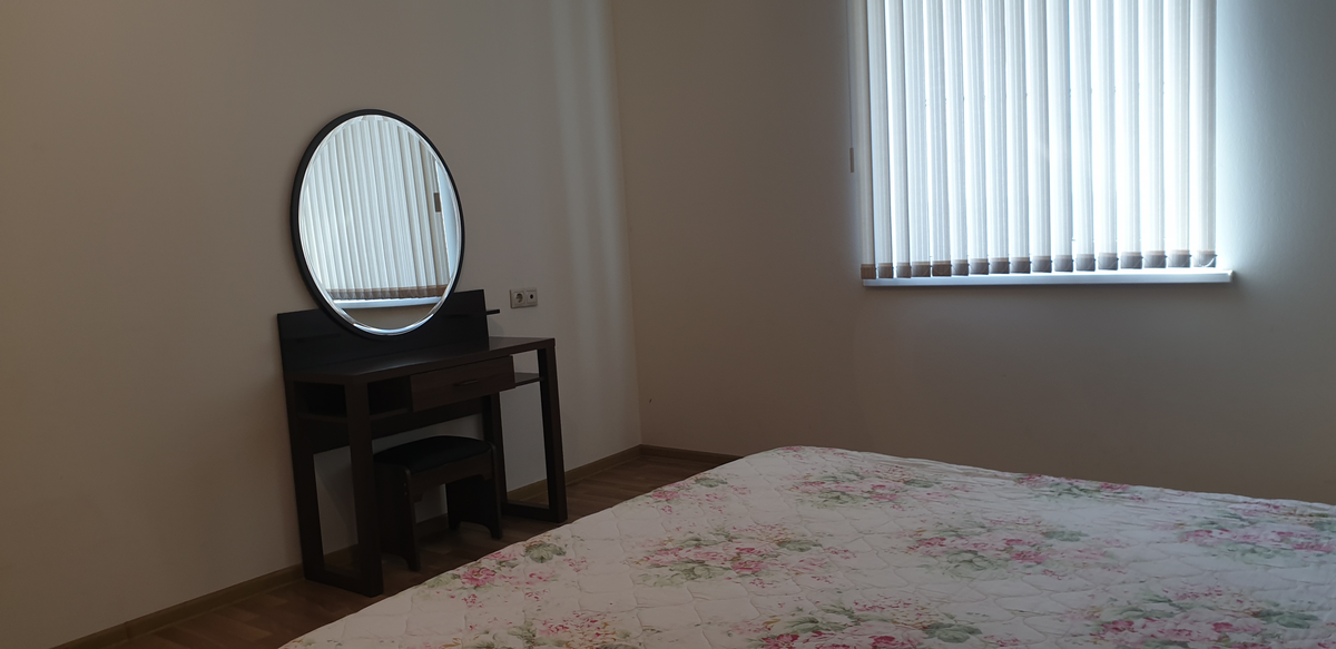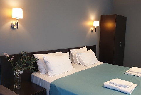 В номере: вешалка, зеркало, кровать двуспальная, прикроватные тумбочки, стол, стул, шкаф, кондиционер, телевизор, холодильник
