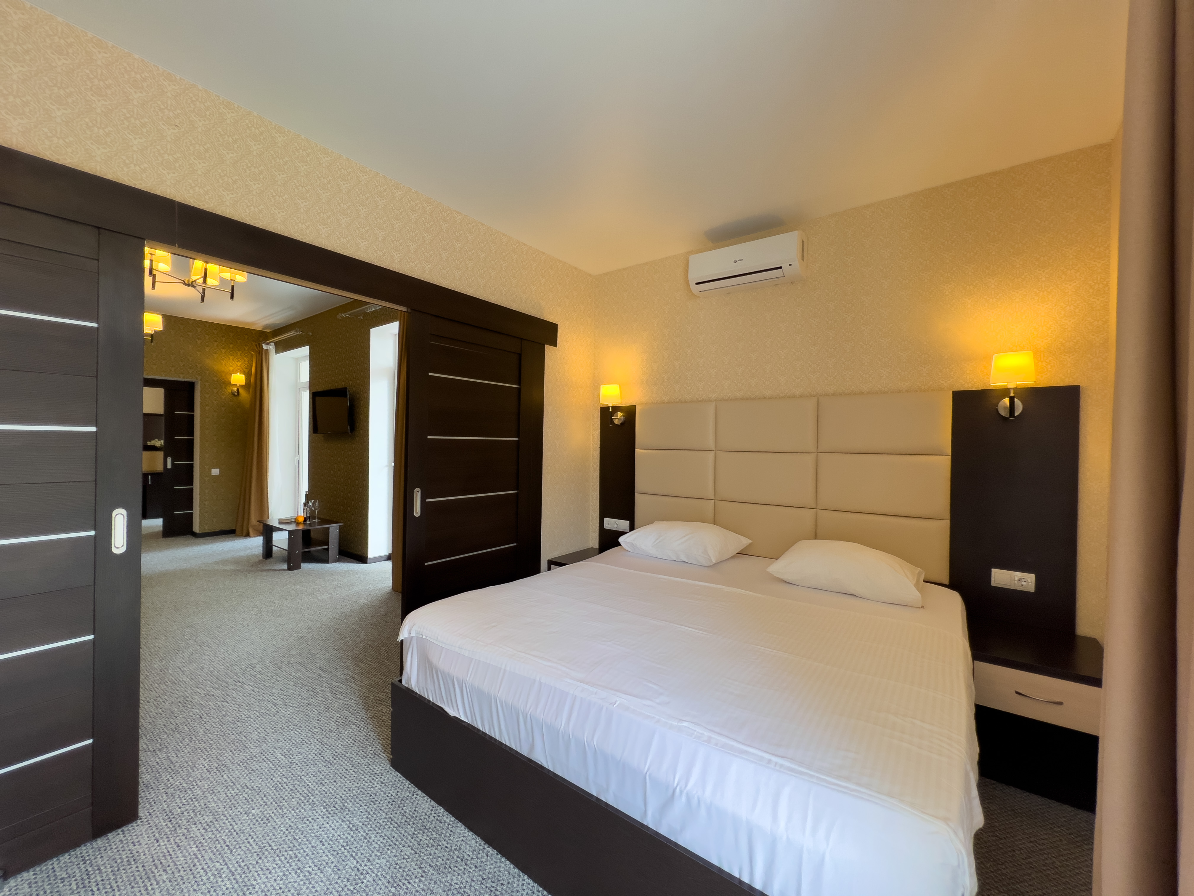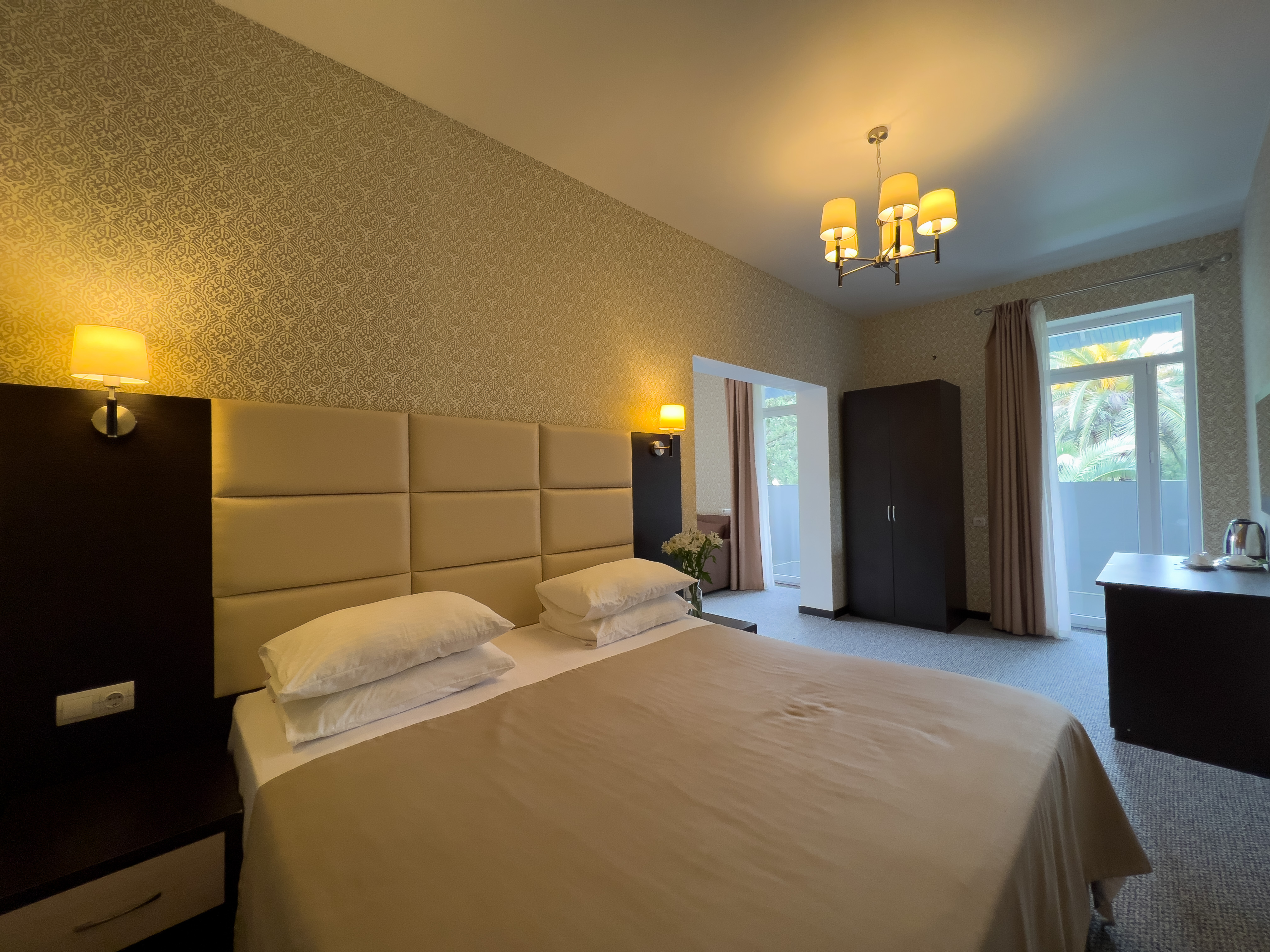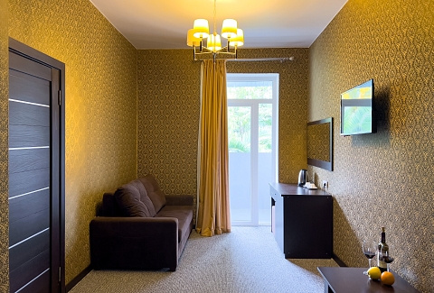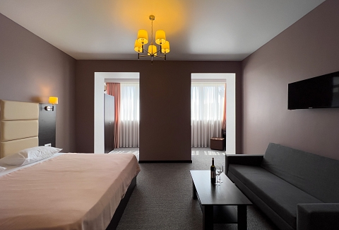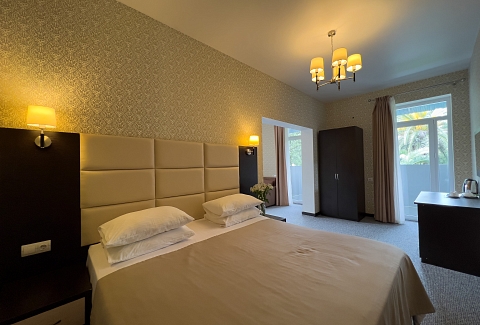 В номере: вешалка, диван раскладной, зеркало, кресло-кровать, кровать двуспальная, прикроватные тумбочки, стол, стулья, шкаф, кондиционер, сейф, телевизор, холодильник, чайный набор посуды, электрочайник