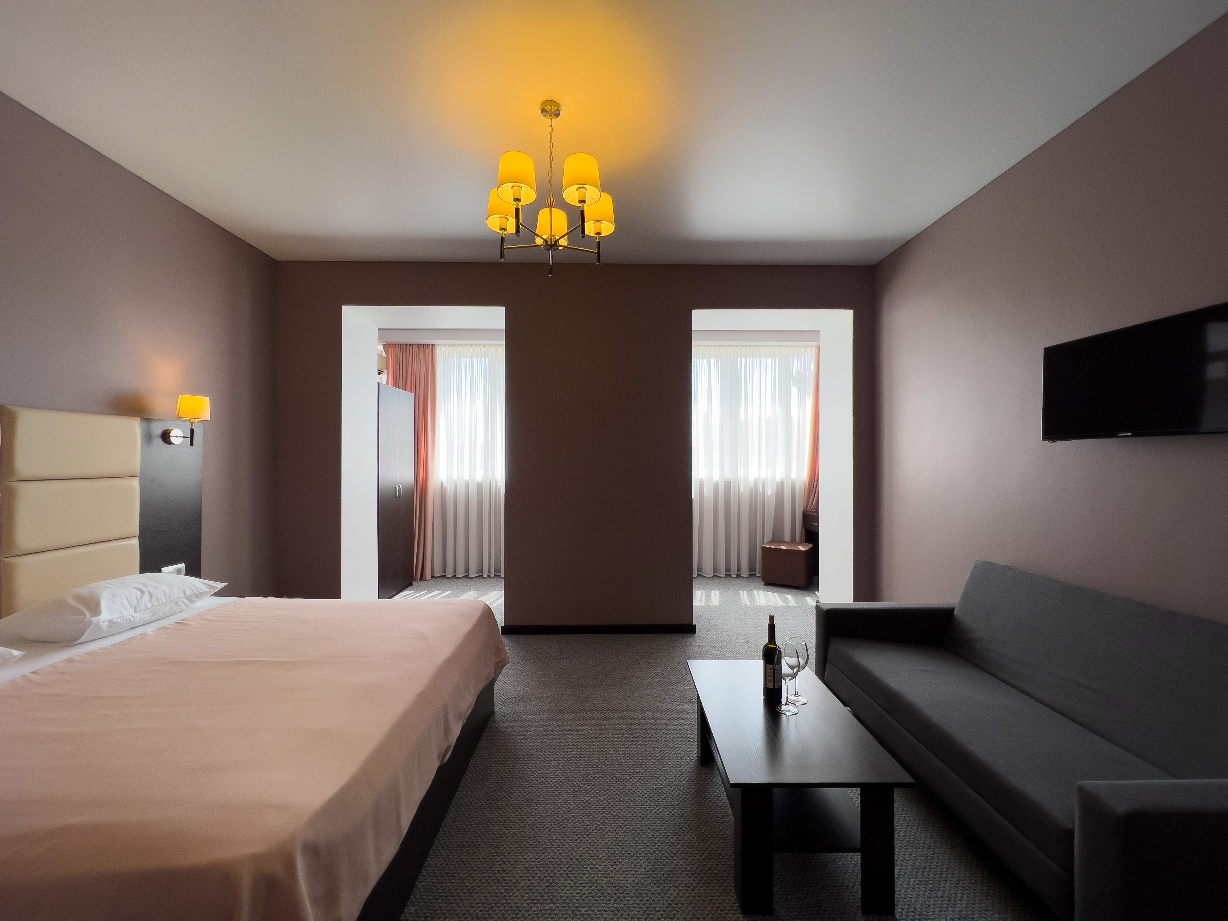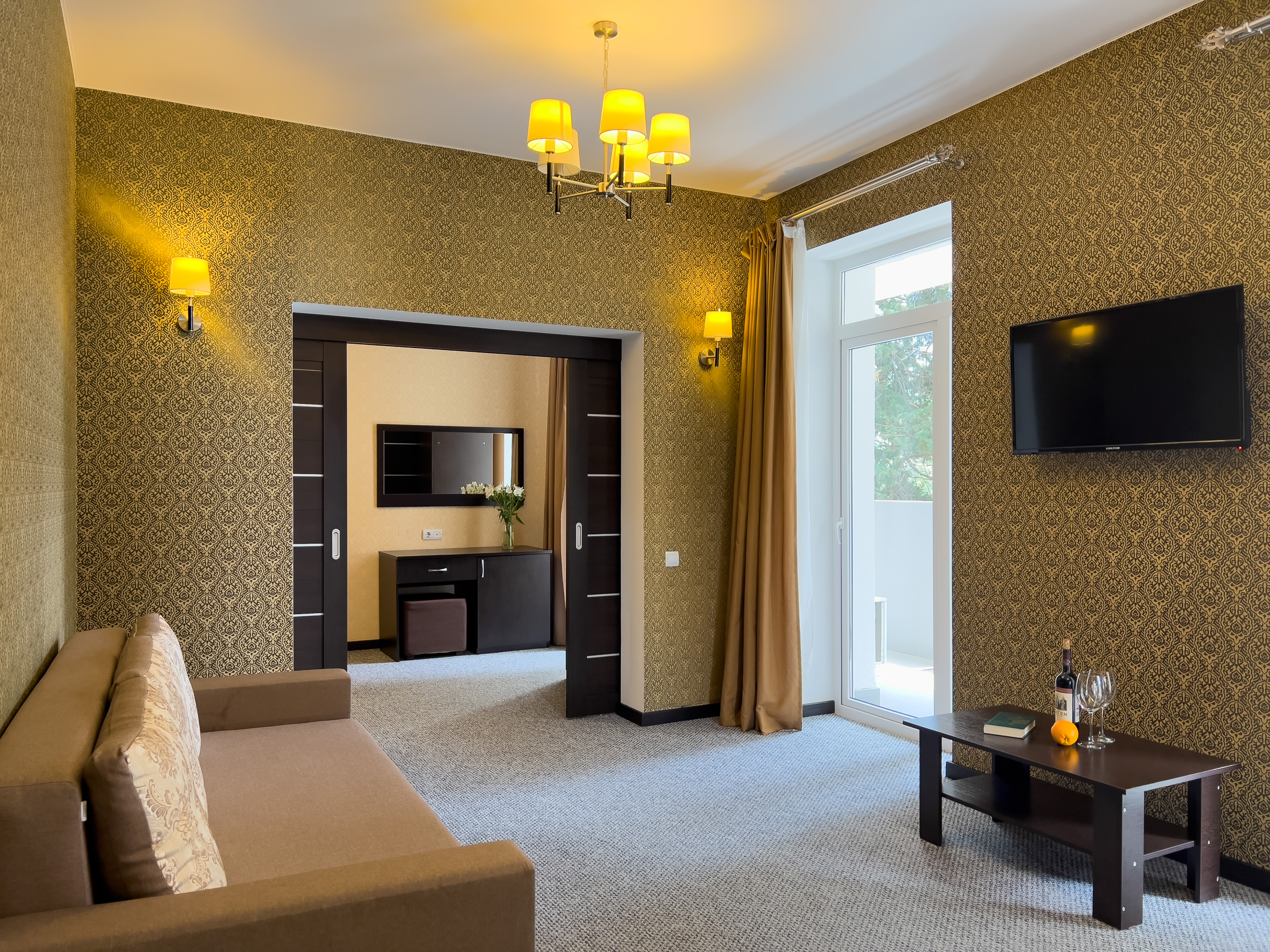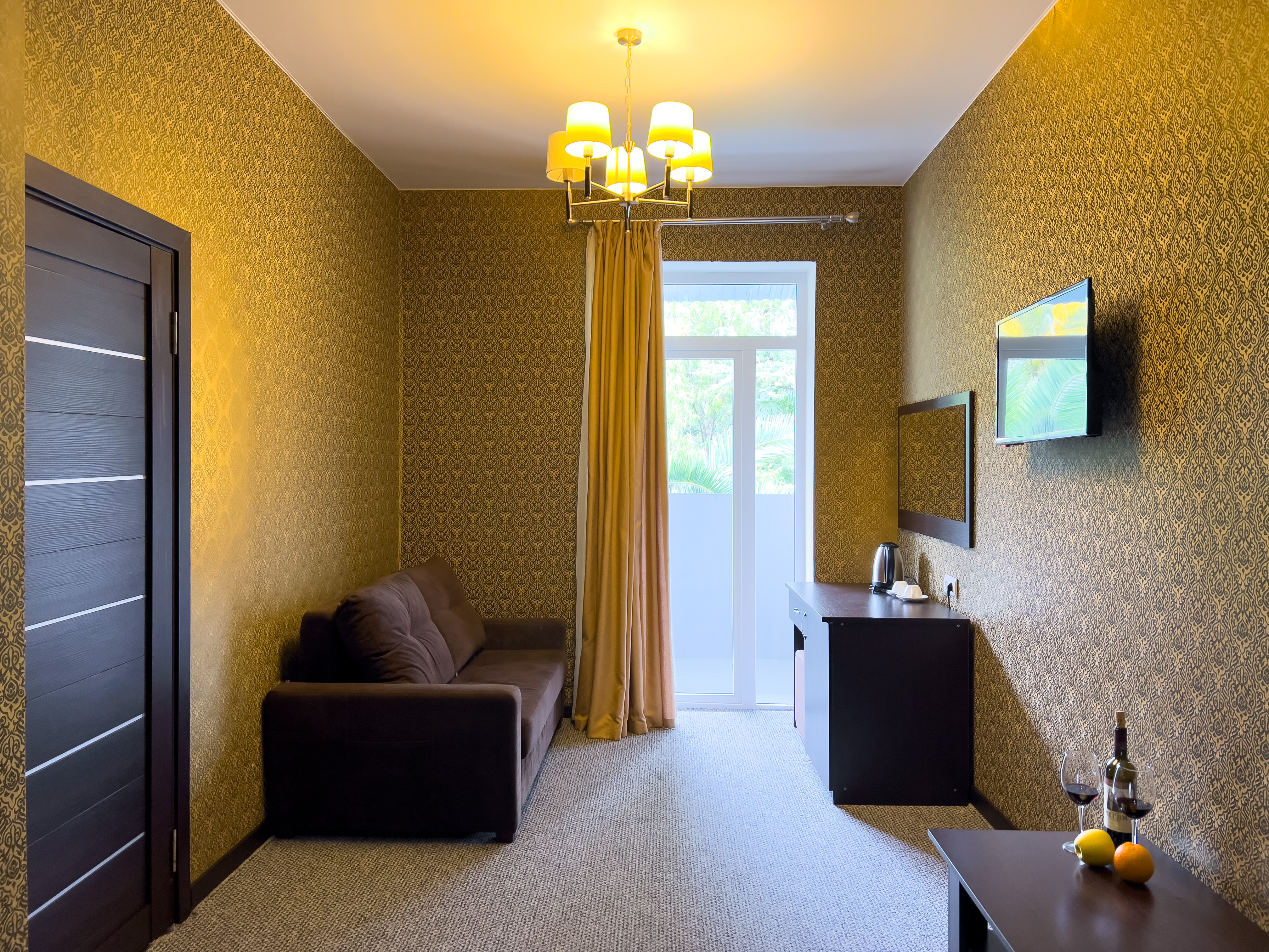 В номере: вешалка, диван раскладной, зеркало, кресло-кровать, кровать двуспальная, прикроватные тумбочки, стол, стулья, шкаф, кондиционер, сейф, телевизор, холодильник, чайный набор посуды, электрочайник