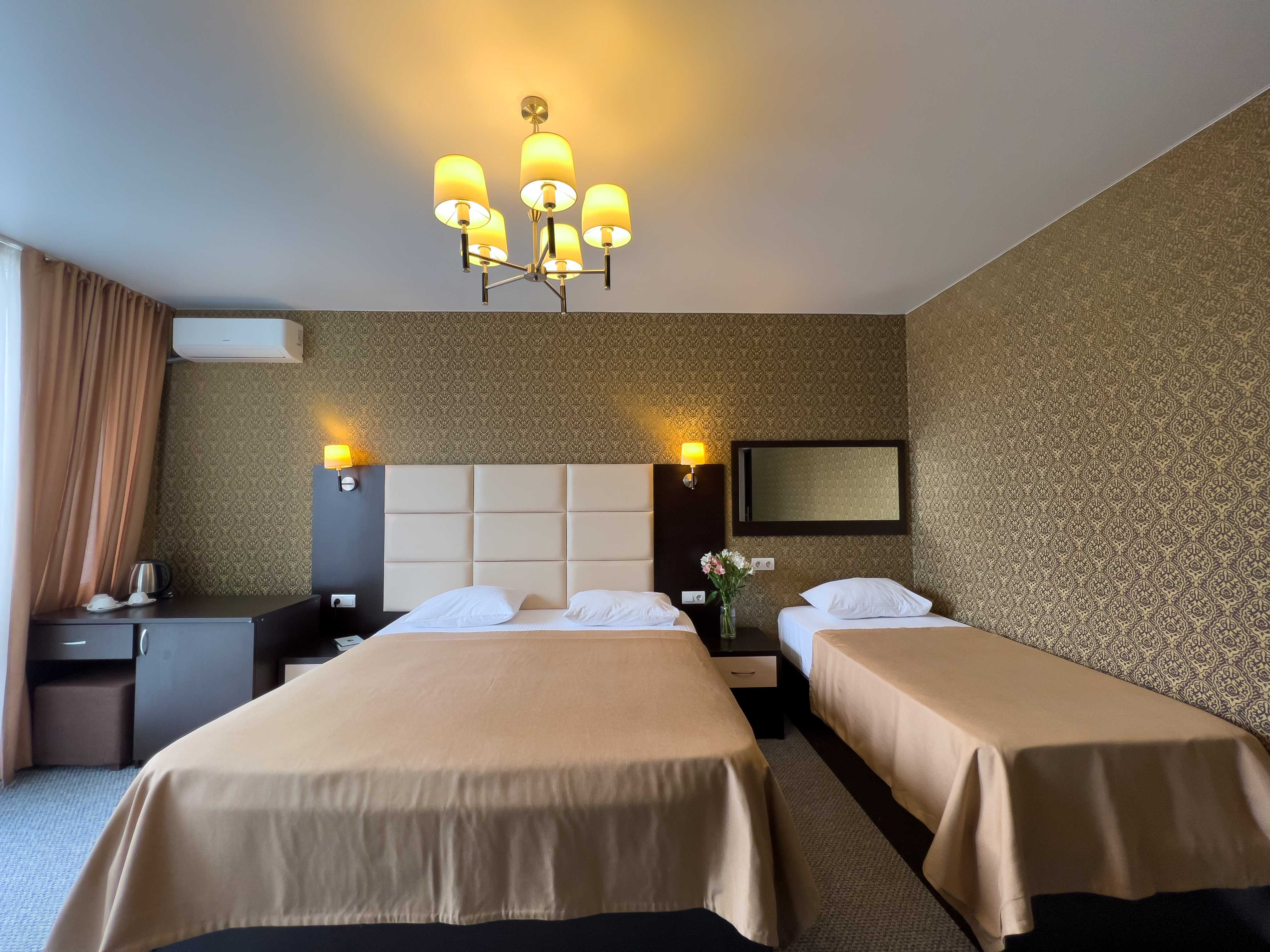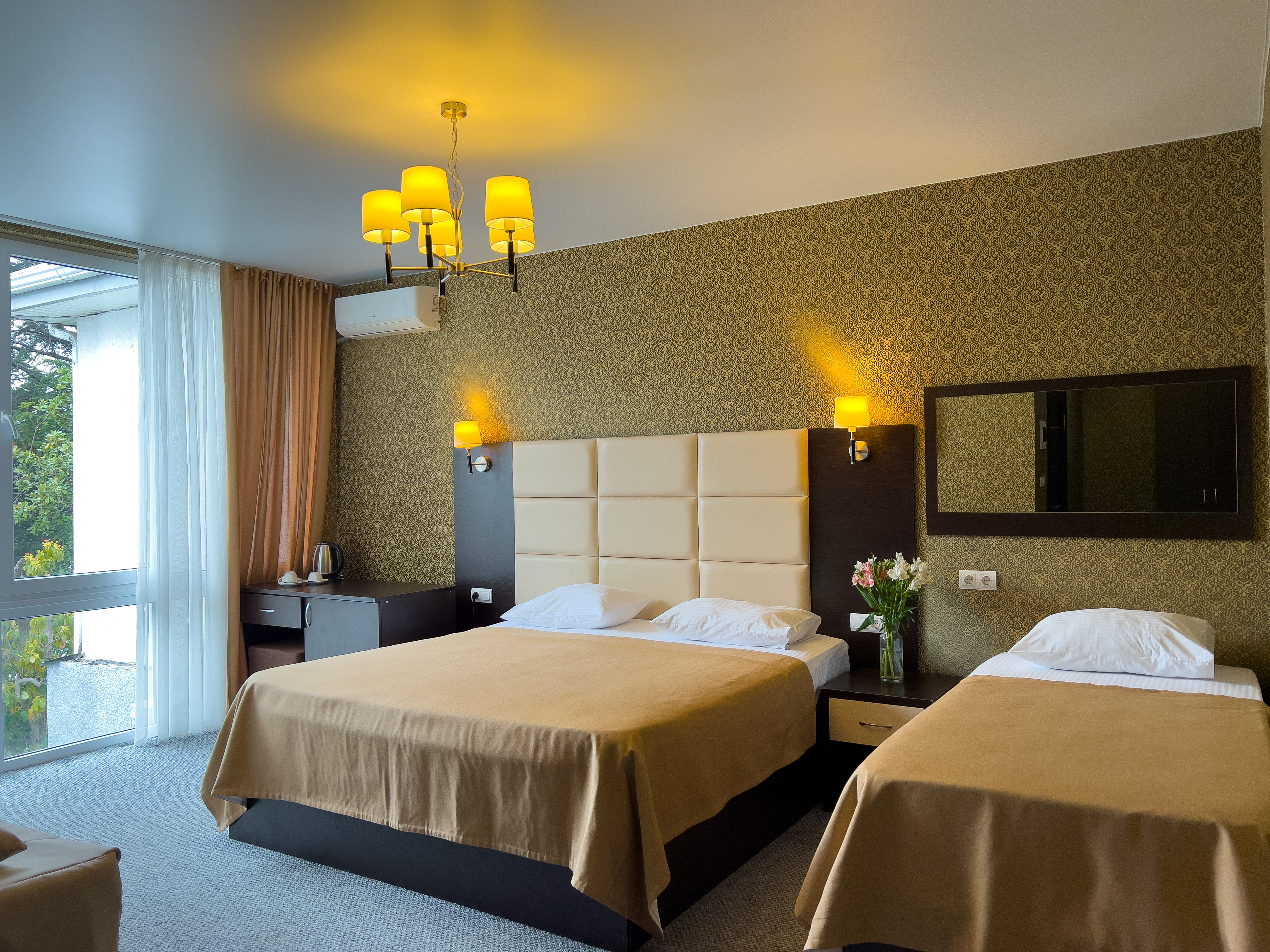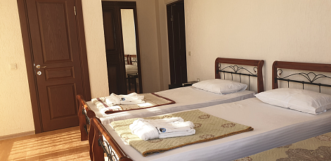 В номере: вешалка, диван раскладной, зеркало, кровати односпальные, кровать двуспальная, прикроватные тумбочки, стол, стулья, шкаф, кондиционер, сейф, телевизор, холодильник, чайный набор посуды, электрочайник
