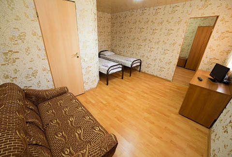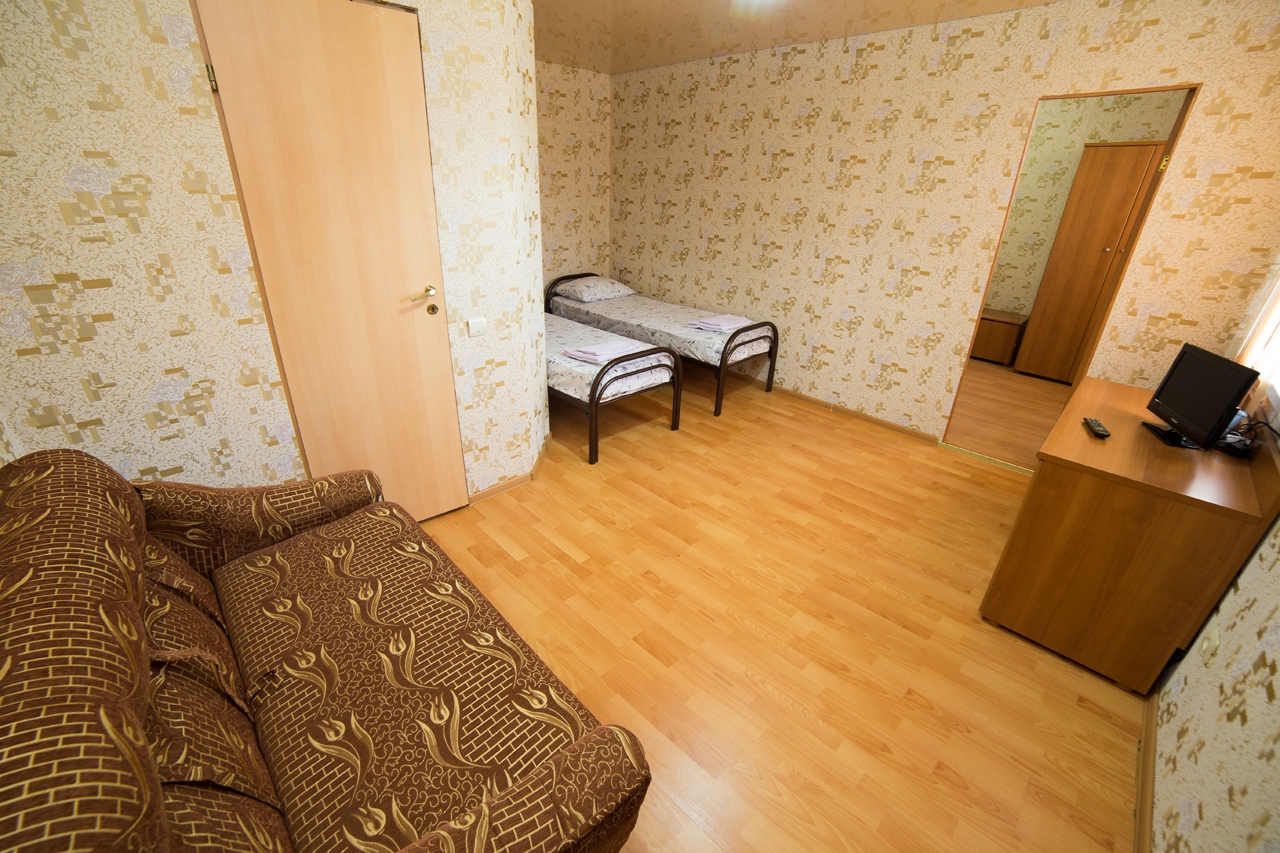 В номере: вешалка, зеркало, кровати односпальные, кровать двуспальная, прикроватные тумбочки, стол, стул, шкаф, кондиционер, телевизор, холодильник
