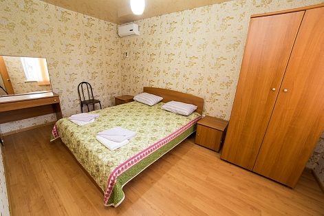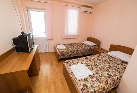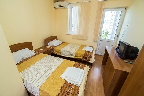 В номере: вешалка, зеркало, кровати односпальные /одна двуспальная кровать, прикроватные тумбочки, стол, стул, шкаф, кондиционер, телевизор, холодильник