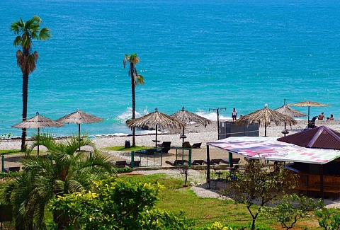 Поездом или самолетом до г. Сочи (Адлер), далее на общественном транспорте или на такси до «Казачьего рынка» (8 км от ж/д вокзала, 15 км от аэропорта), затем пройти пешком около 500 м до пограничного поста на р.Псоу до границы России и Абхазии. После самостоятельного прохождения паспортного и таможенного контроля до места отдыха можно доехать на автобусе, маршрутном такси или воспользоваться услугами частных водителей.