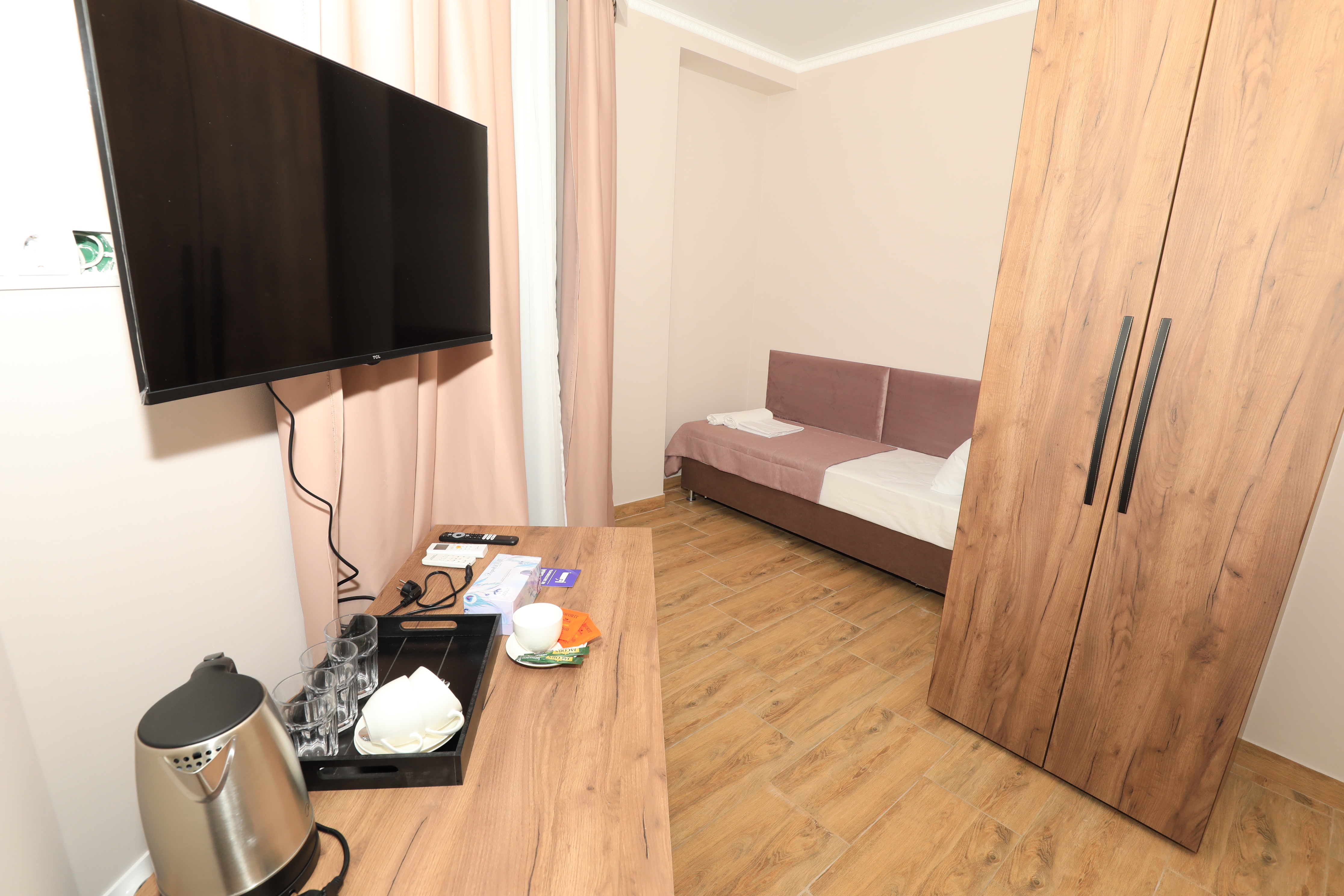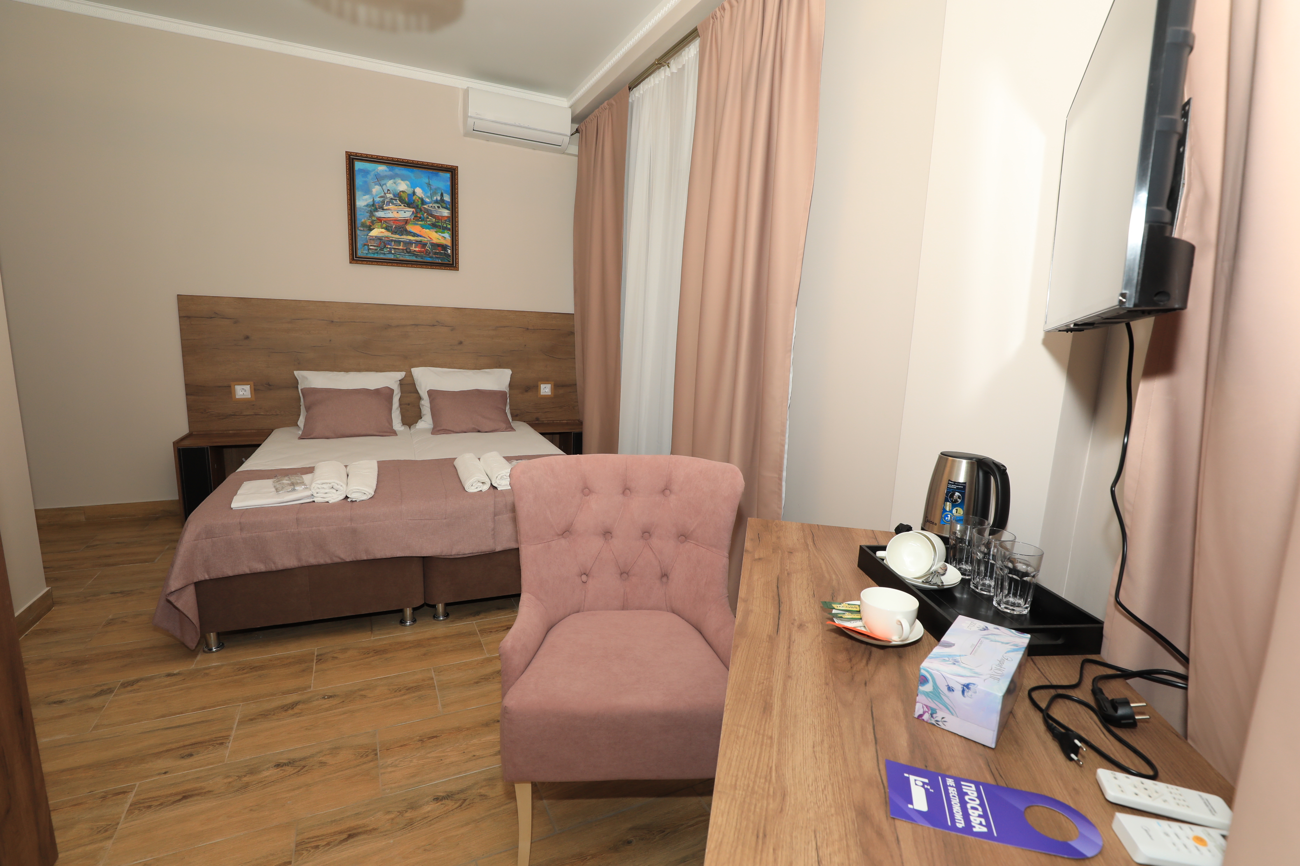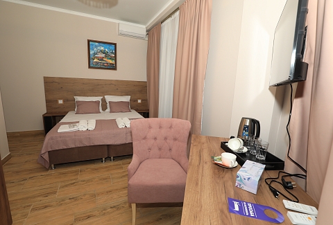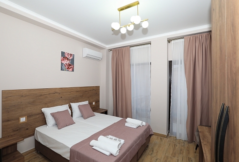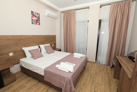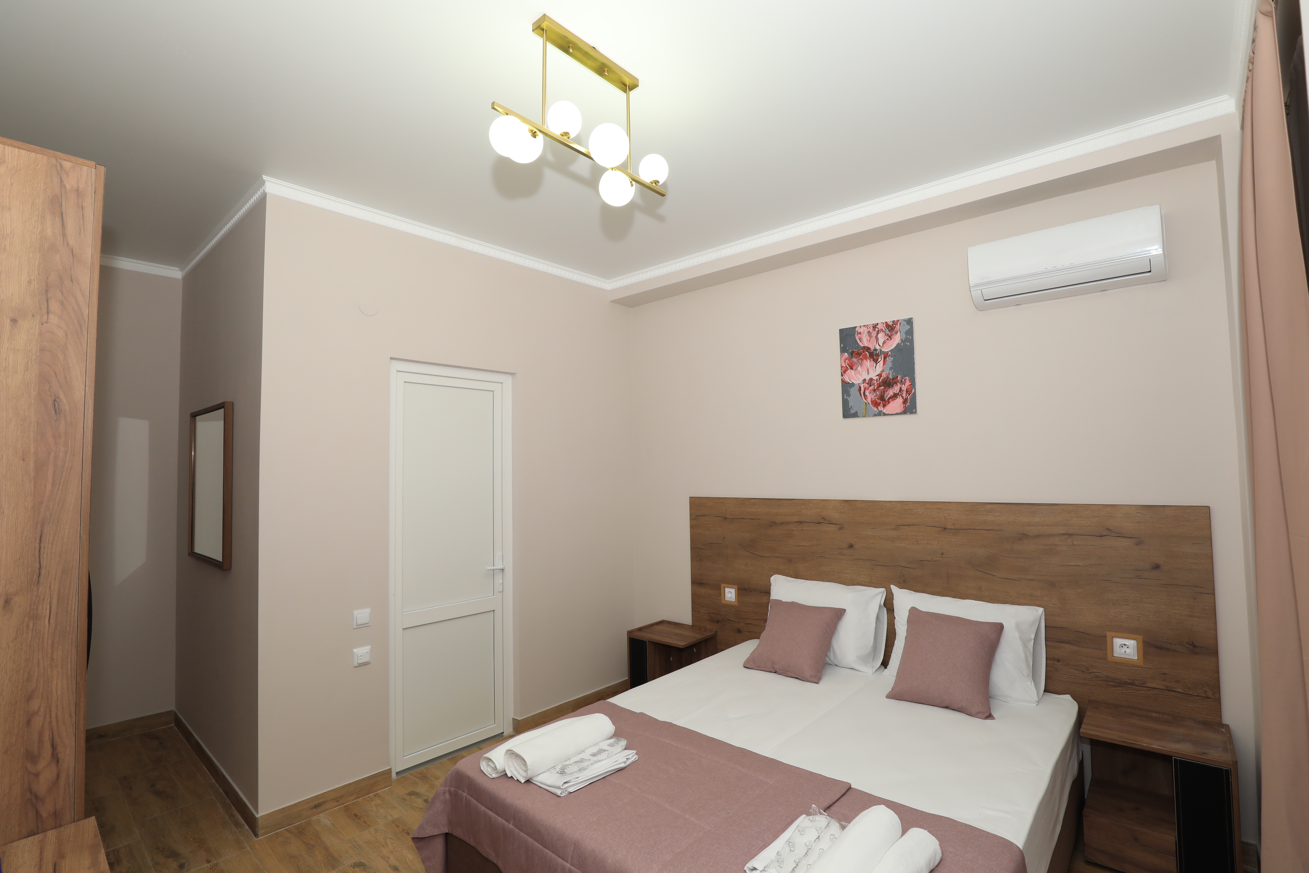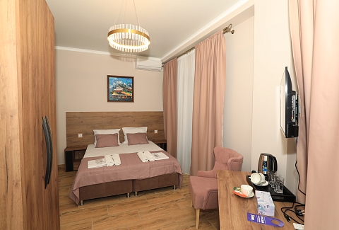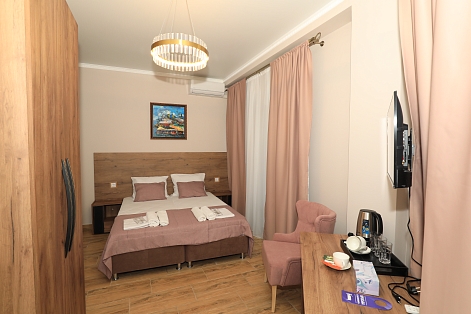 В номере: вешалка, зеркало, кровати односпальные /одна двуспальная кровать, прикроватные тумбочки, стол, стул, шкаф, кондиционер, телевизор, холодильник, чайная станция