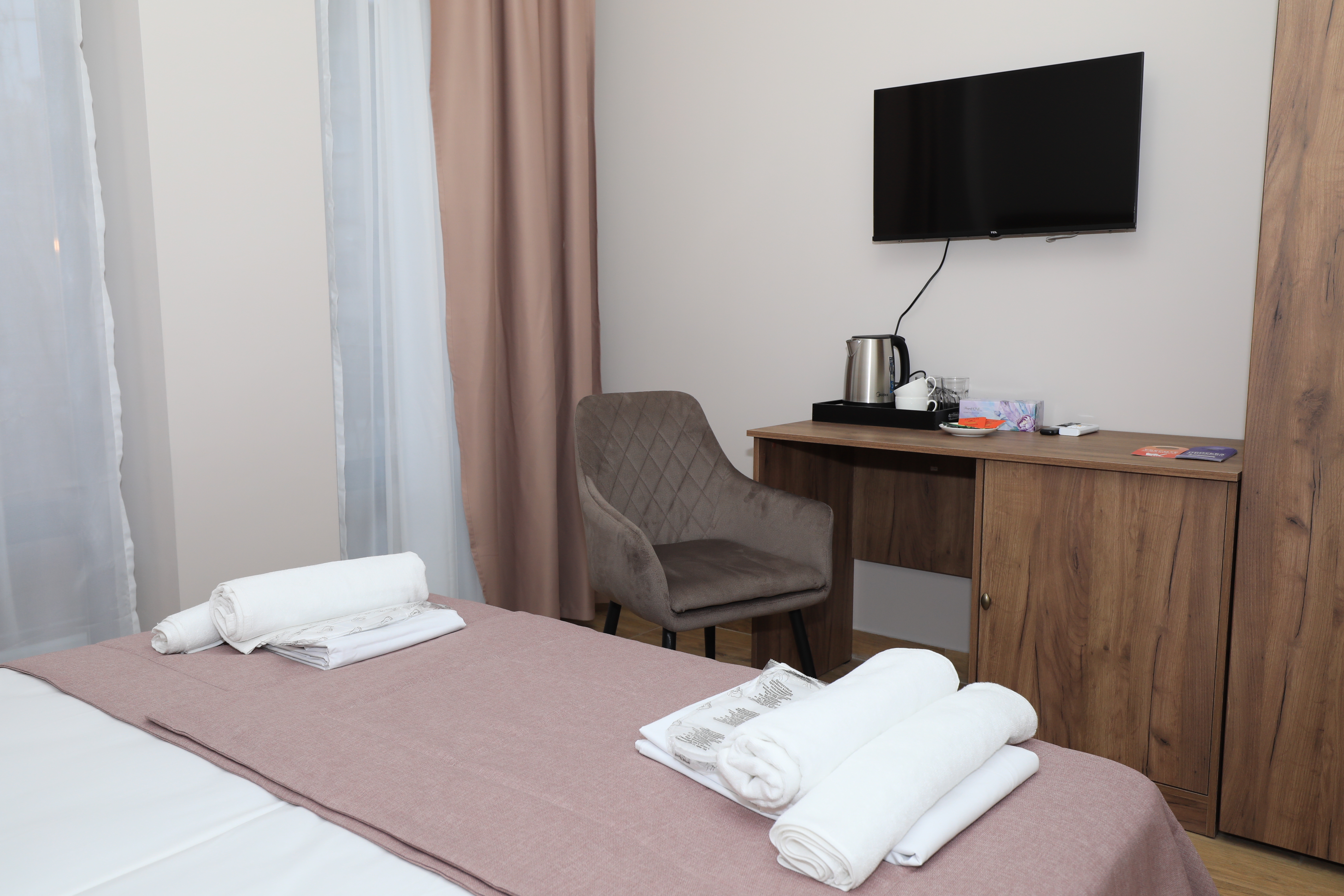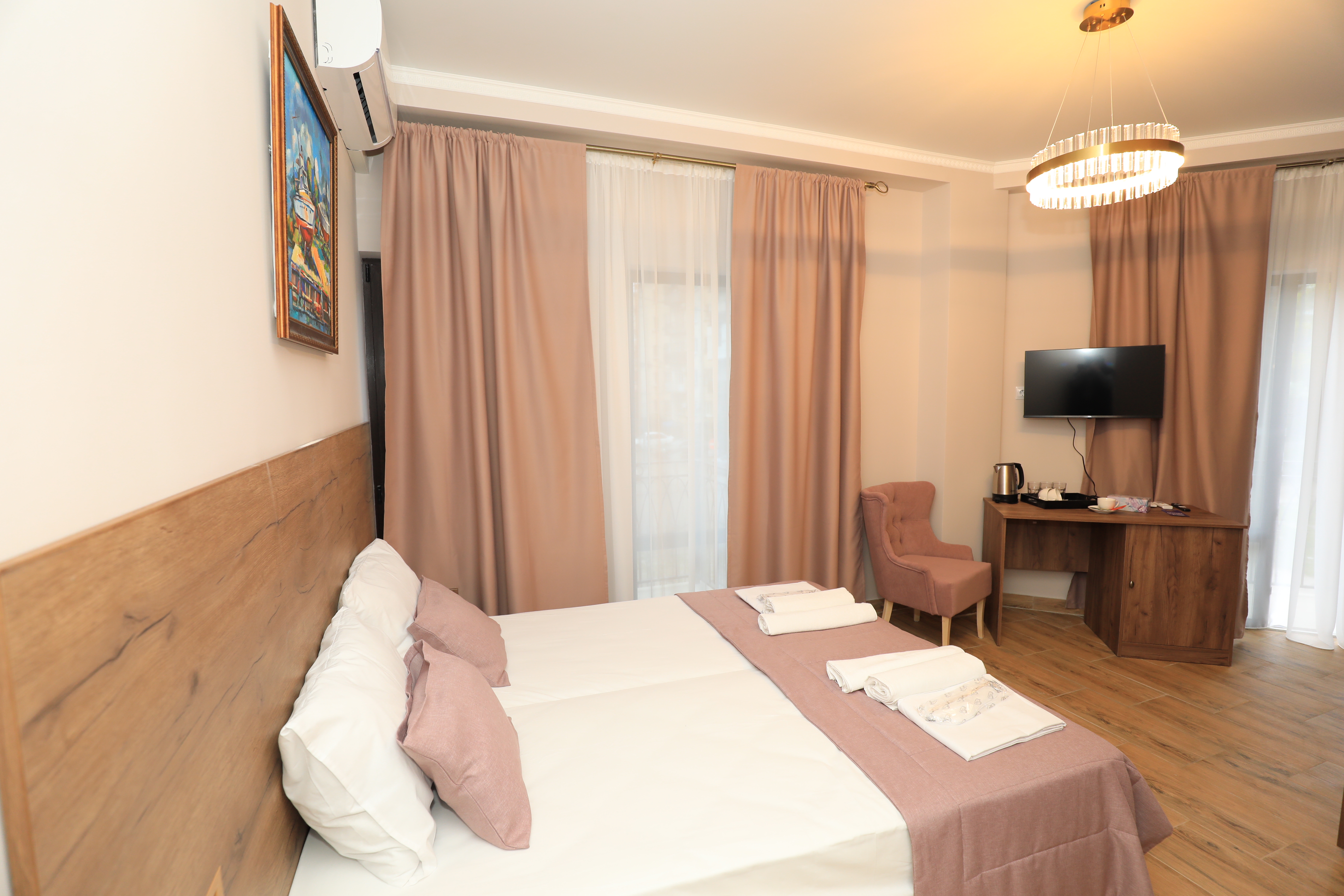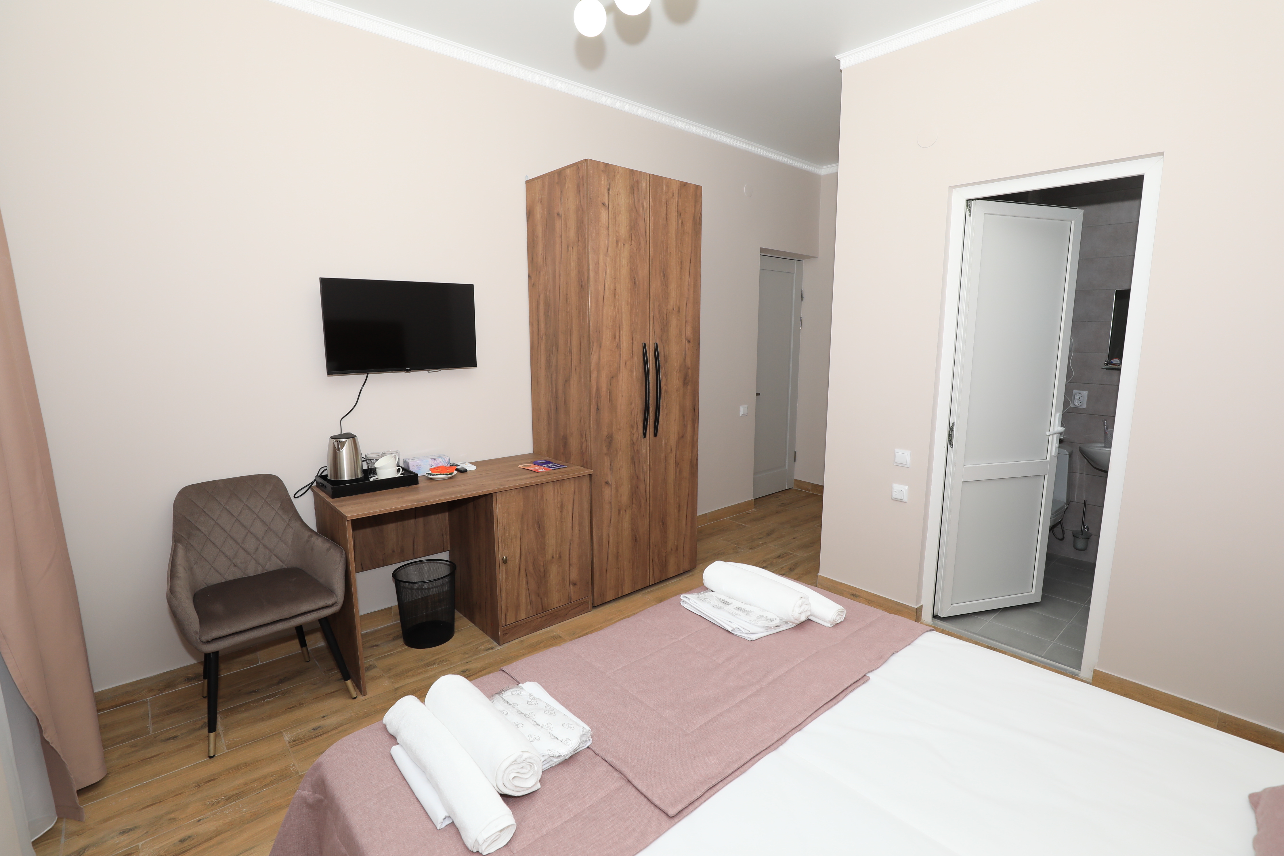 В номере: вешалка, зеркало, кровати односпальные /одна двуспальная кровать, прикроватные тумбочки, стол, стул, шкаф, кондиционер, телевизор, холодильник, чайная станция
