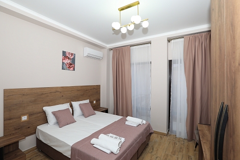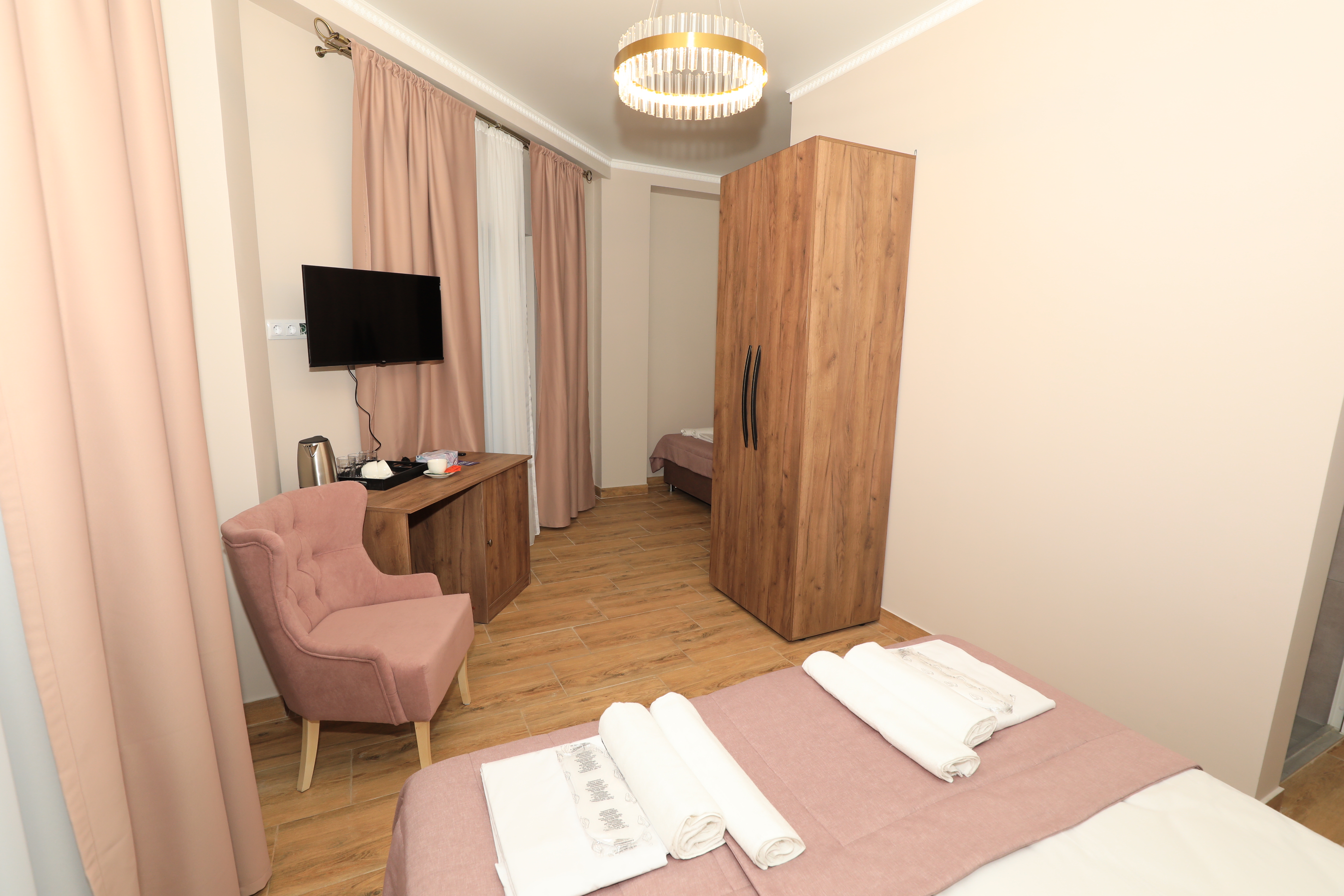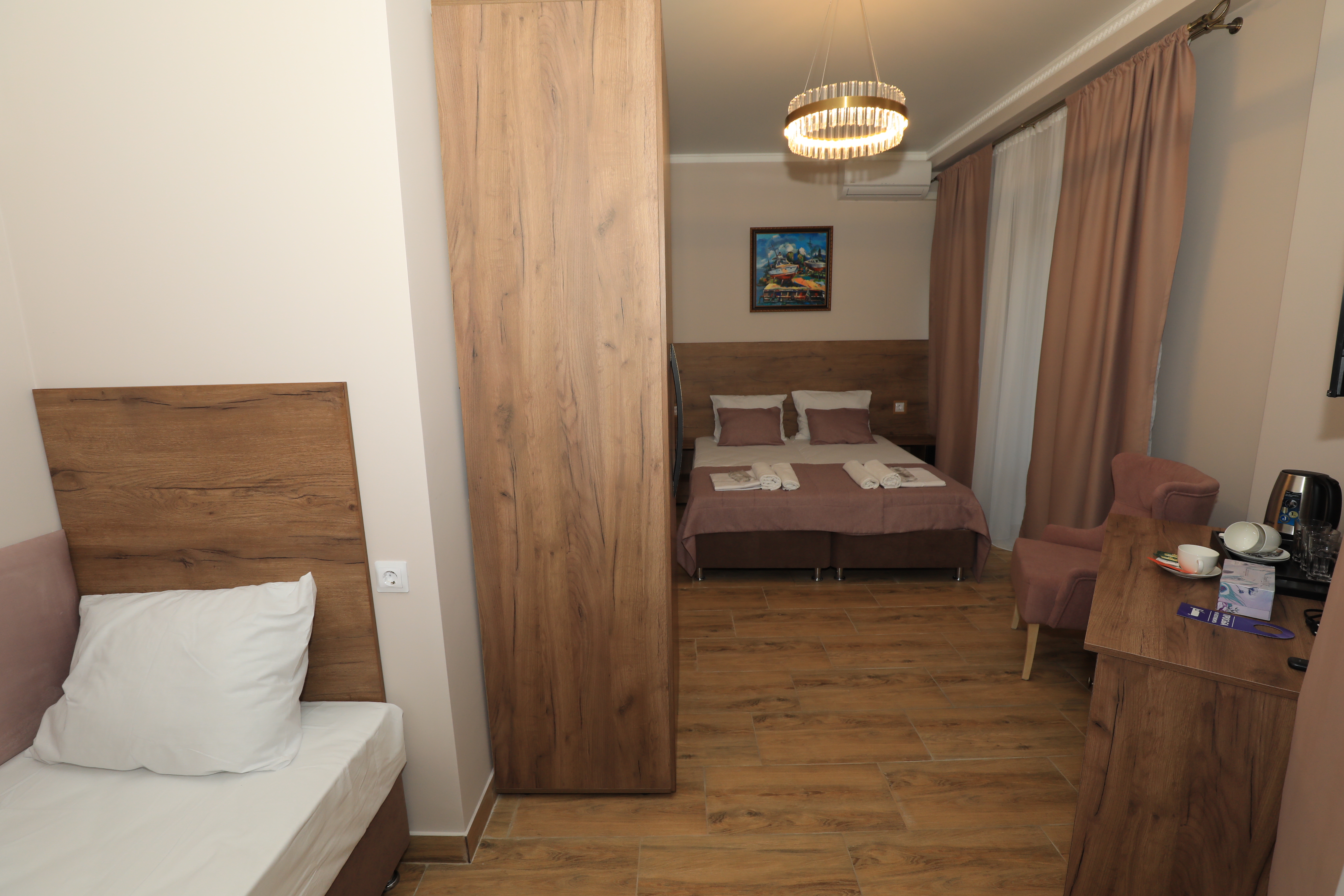 В номере: вешалка, зеркало, кровати односпальные /одна двуспальная кровать, кровать односпальная, прикроватные тумбочки, стол, стул, шкаф, кондиционер, телевизор, холодильник, чайная станция