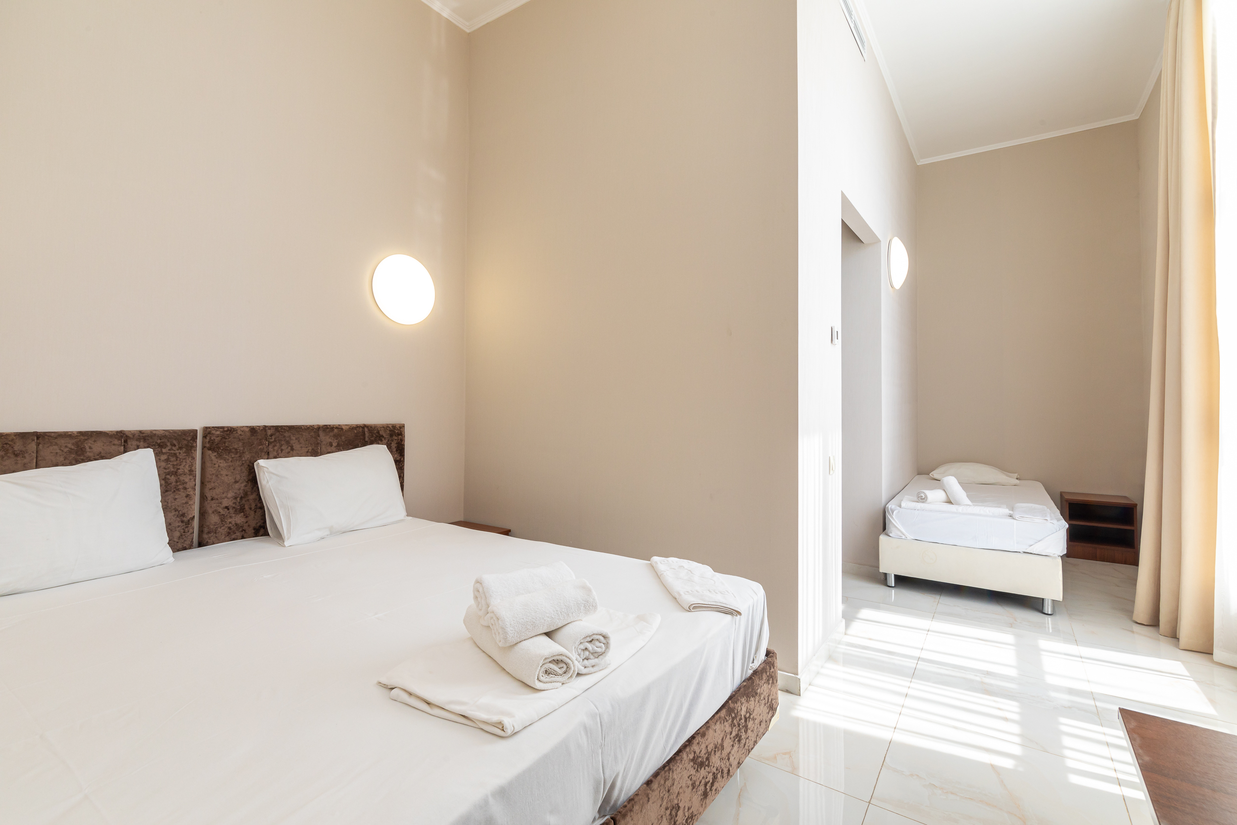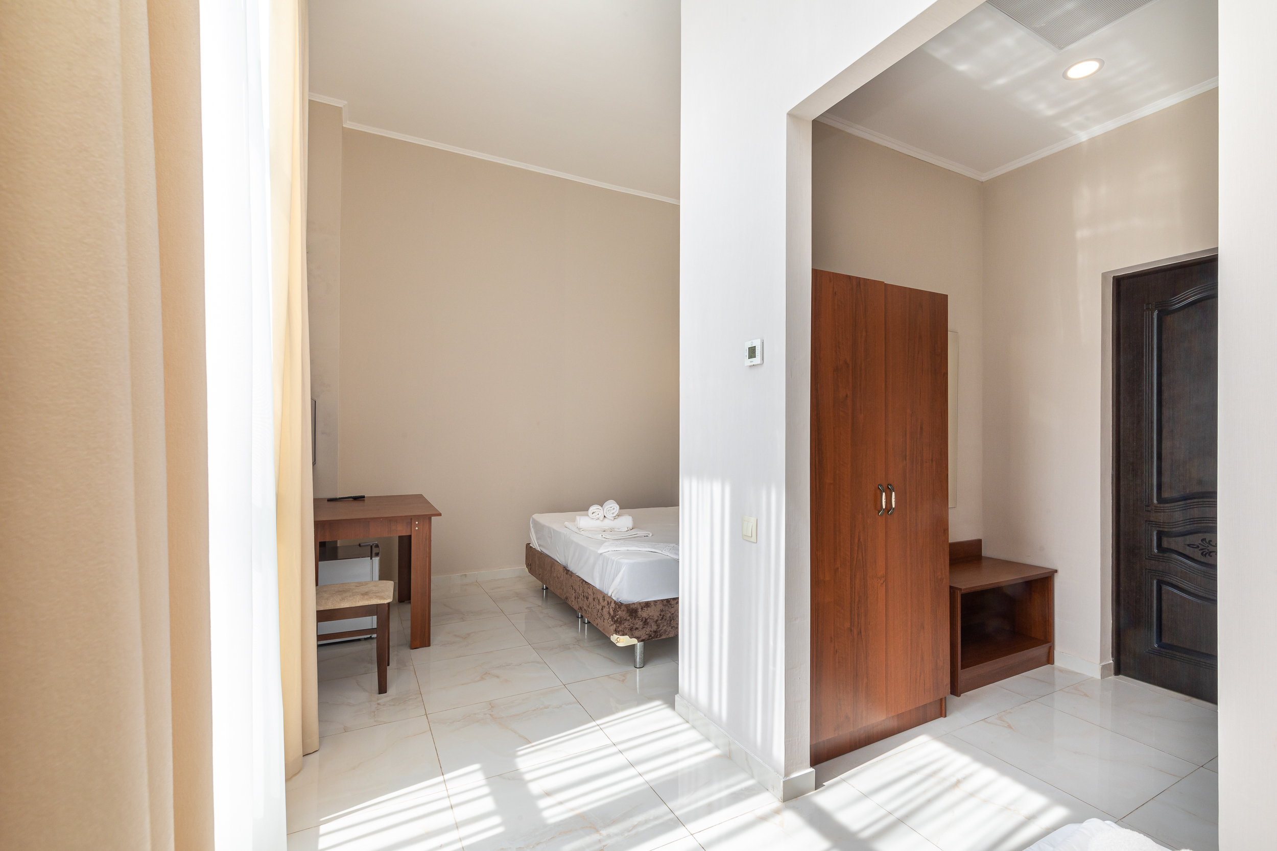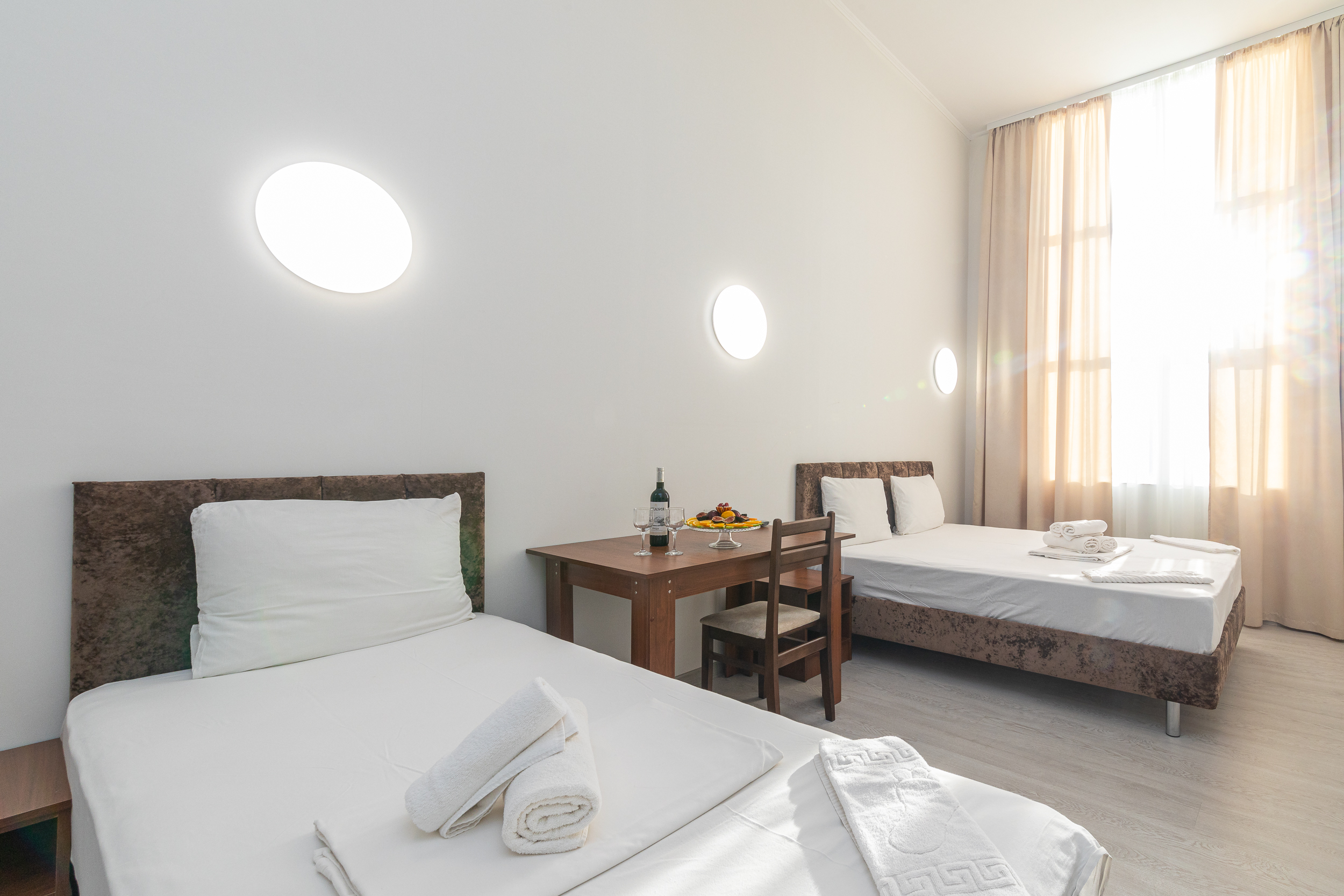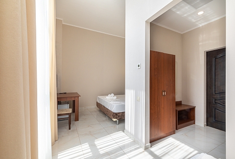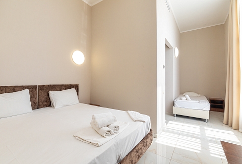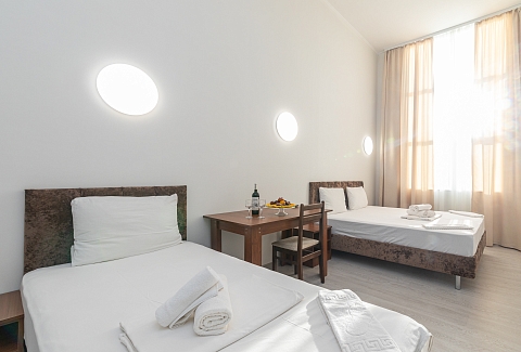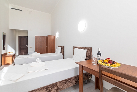 В номере: вешалка, зеркало, кровати односпальные /одна двуспальная кровать, прикроватные тумбочки, стол, стул, шкаф, кондиционер, телевизор, холодильник