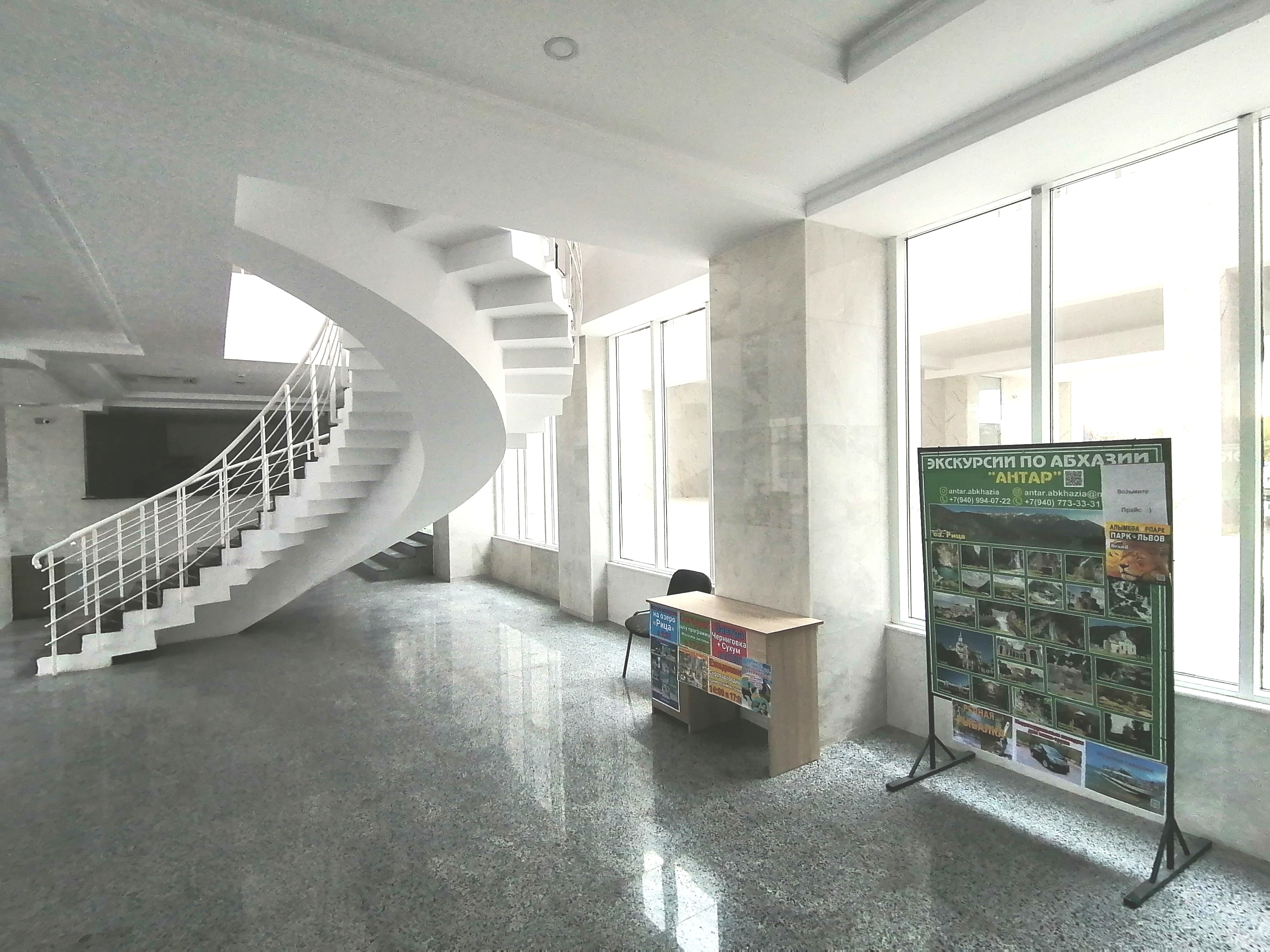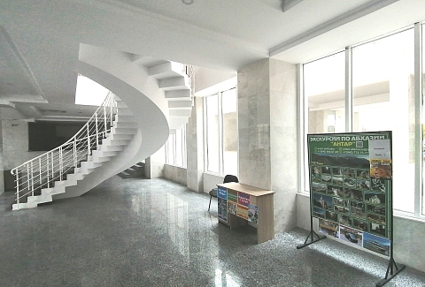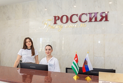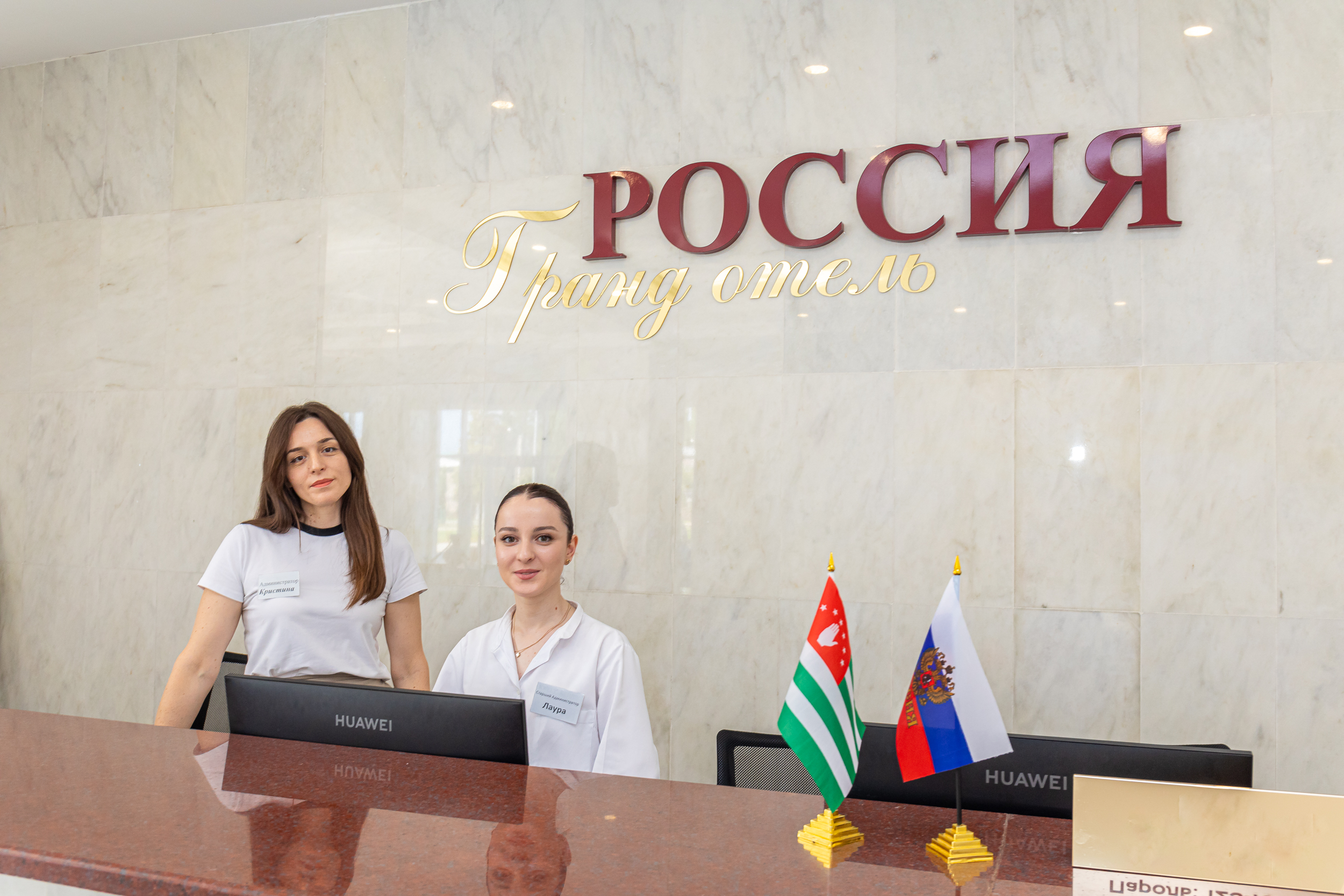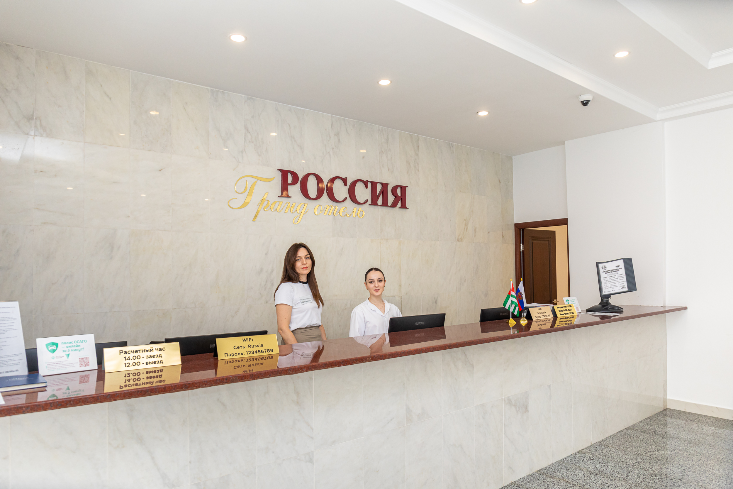 Гостиница «Гранд отель Россия» располагается в центральной части абхазского города Гудаута на первой береговой линии. Рядом — небольшой зеленый сквер, несколько кафе и магазинов, в часе езды находится аэропорт Адлер (г. Сочи), в 66 км - российско-абхазская граница.