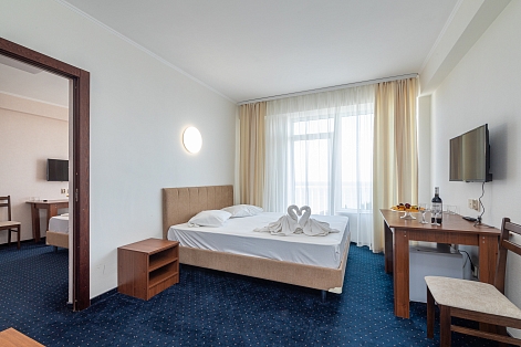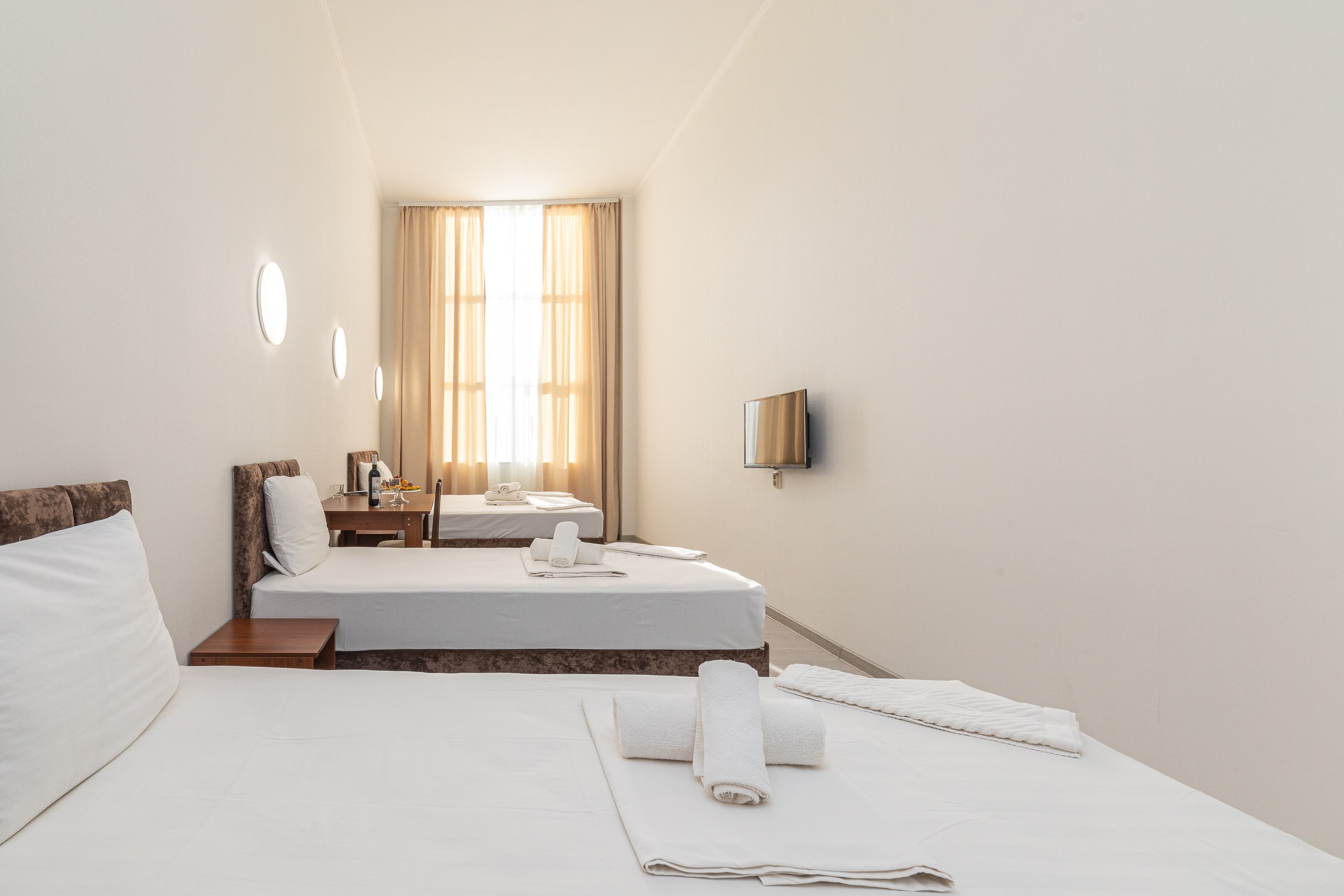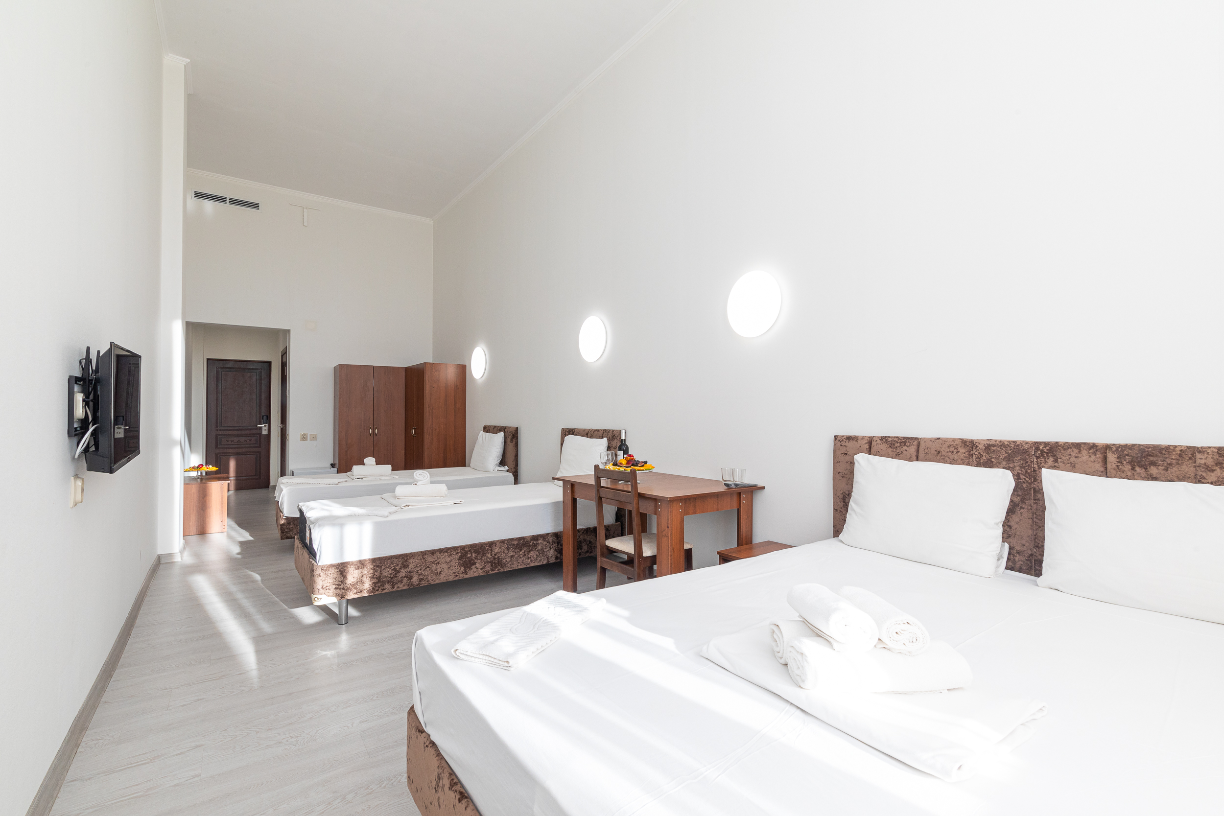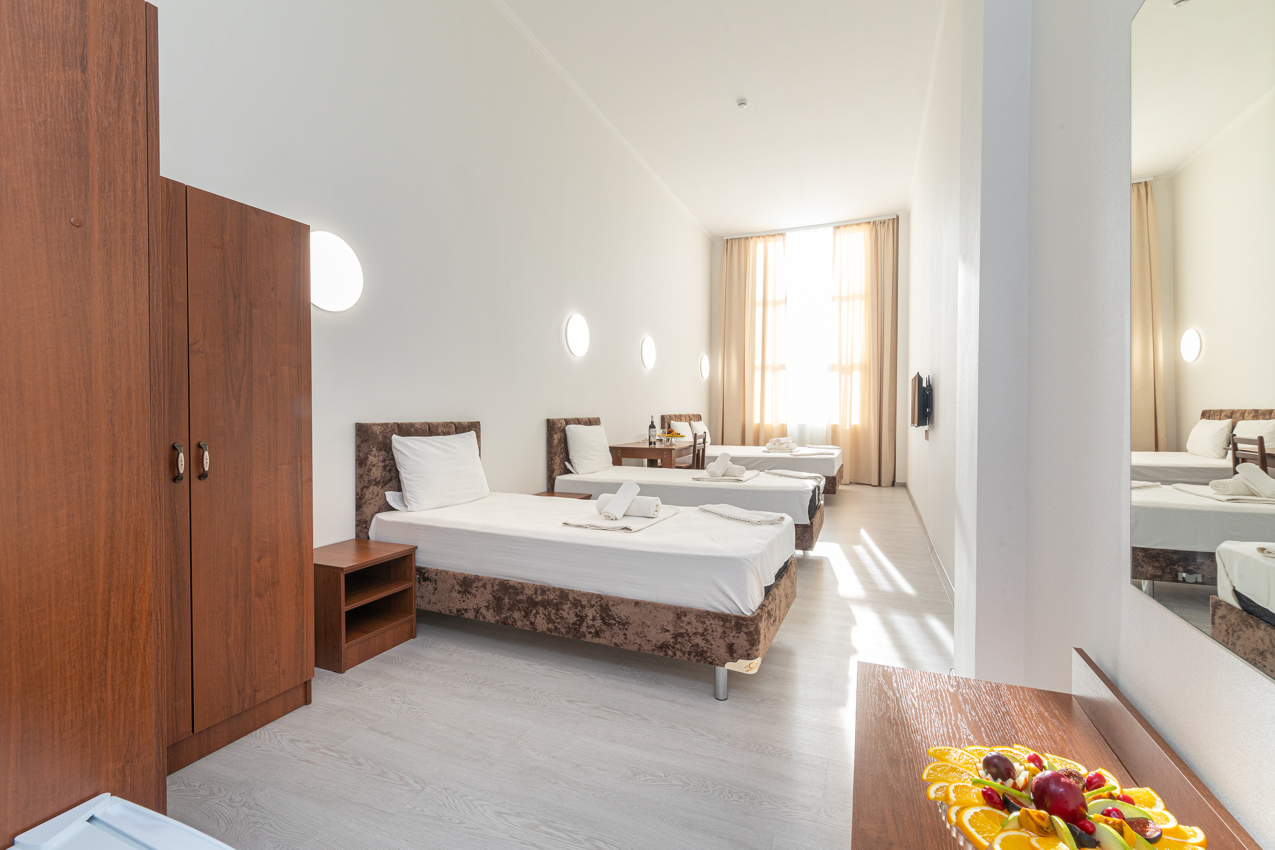 В номере: вешалка, зеркало, кровати односпальные, кровать двуспальная, прикроватные тумбочки, стол, стул, тумба, шкаф, кондиционер, телевизор, холодильник