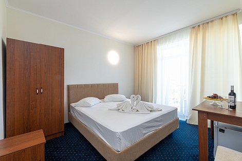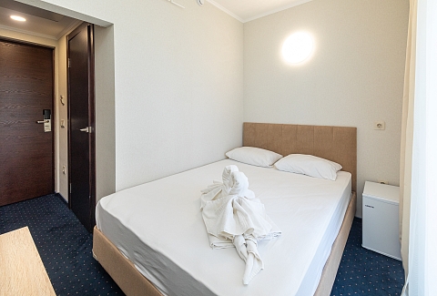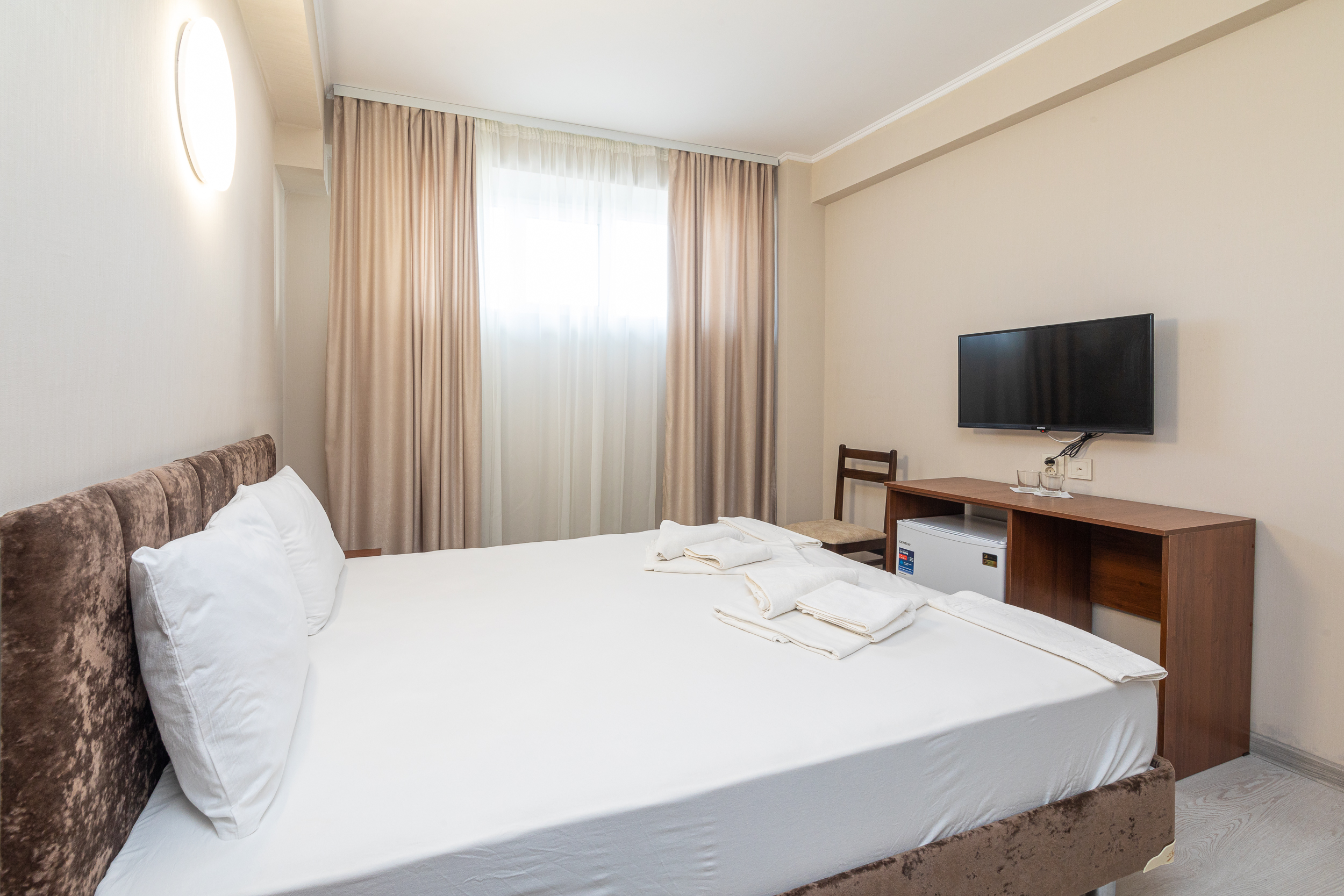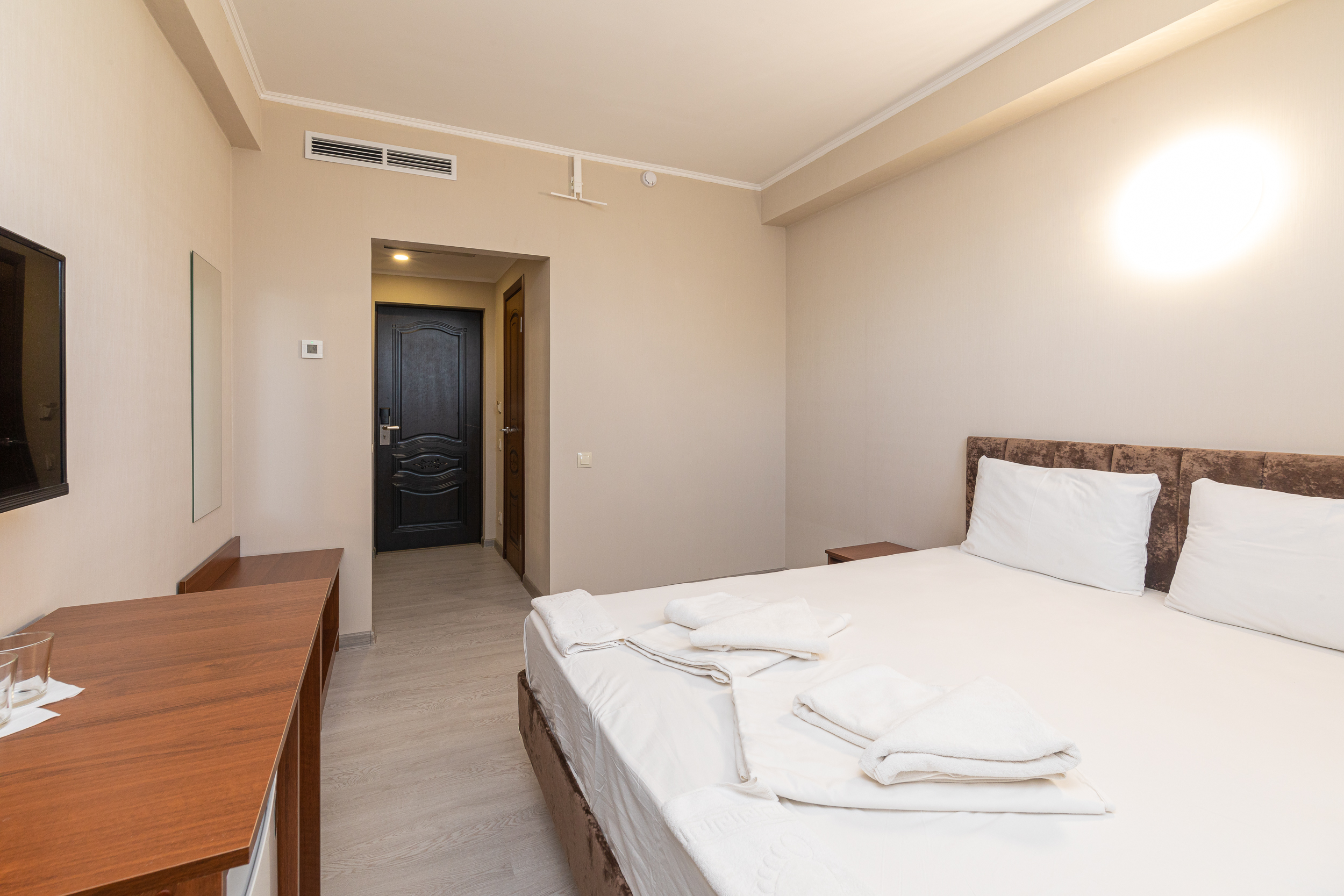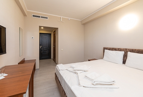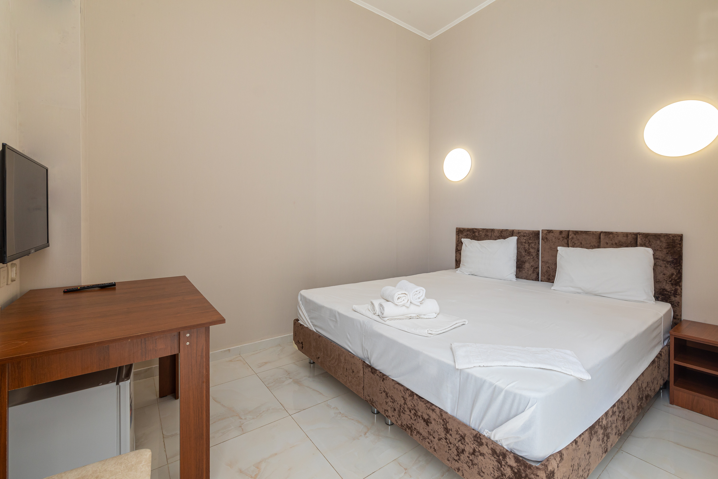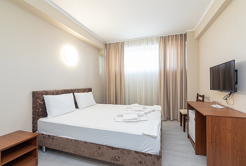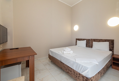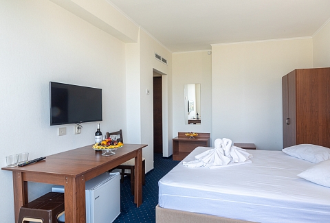В номере: вешалка, зеркало, кровать двуспальная, прикроватные тумбочки, стол, стул, шкаф, кондиционер, телевизор, холодильник