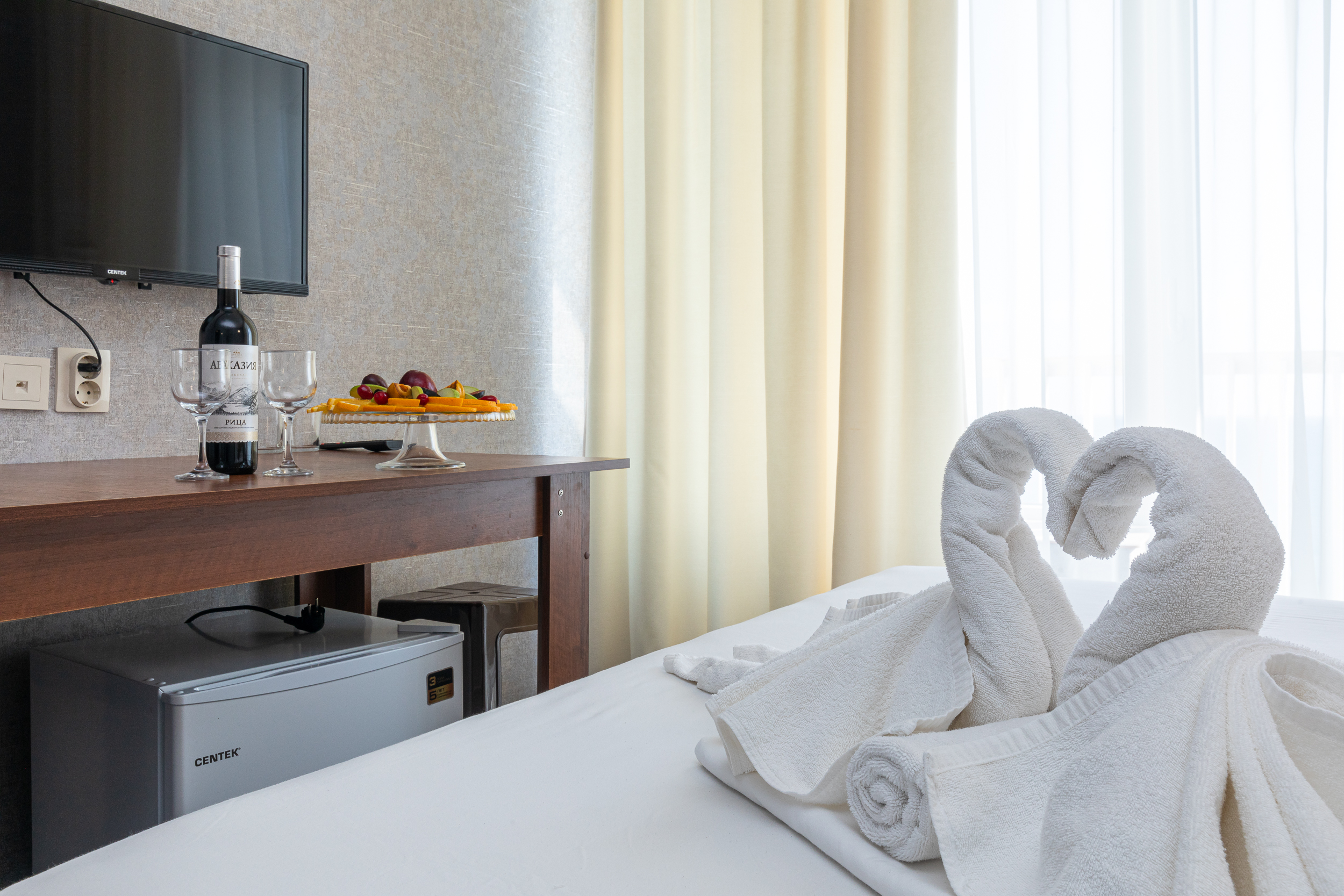 В номере: вешалка, зеркало, кровать двуспальная, прикроватные тумбочки, стол, стулья, шкаф, кондиционер, телевизор, холодильник