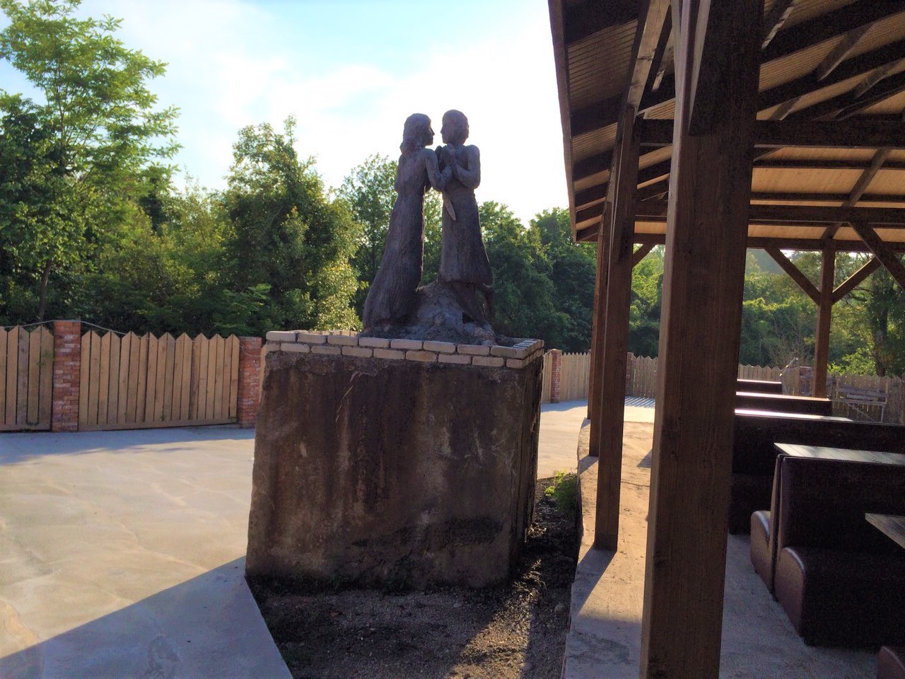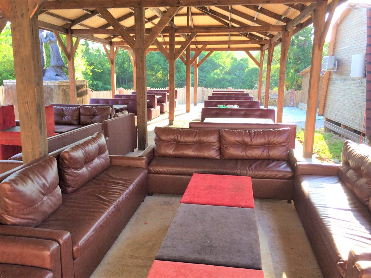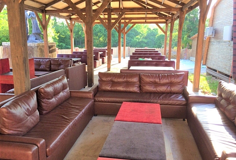 - общая кухня плиты (электрическая и газовая), СВЧ печь, столы, лавки, диваны под навесом (большая территория), посуды НЕТ.